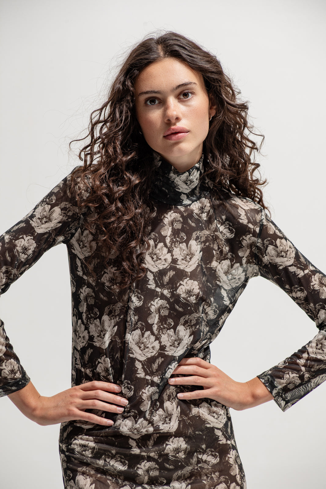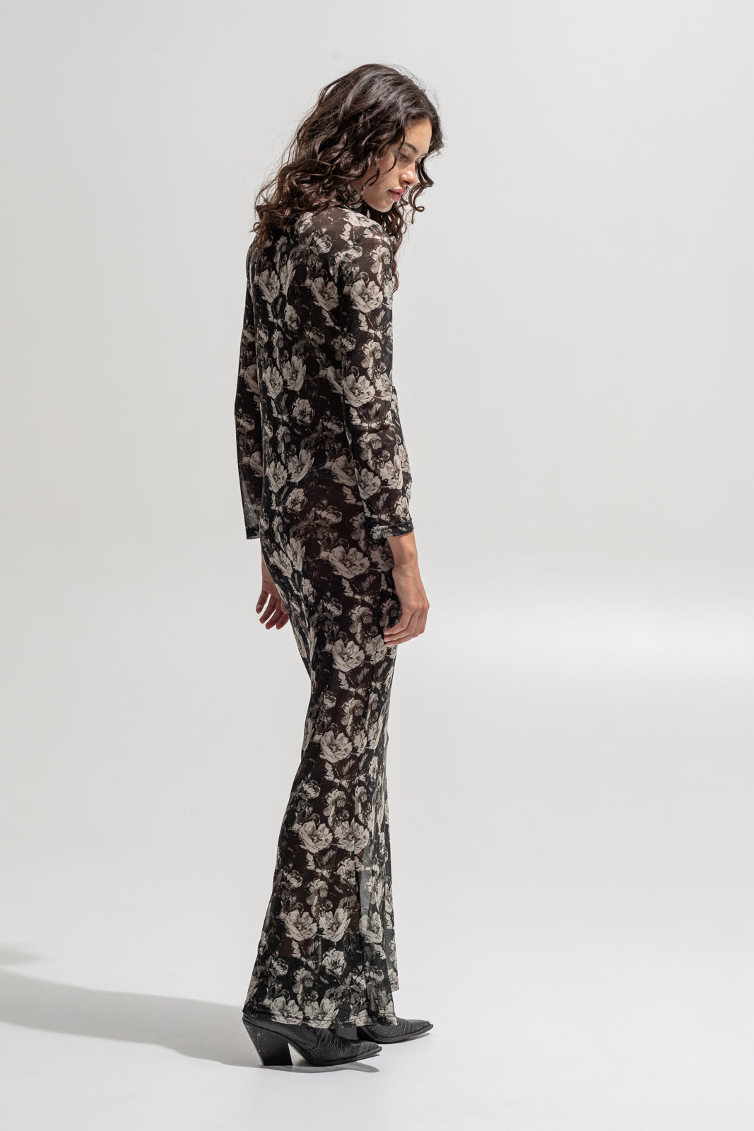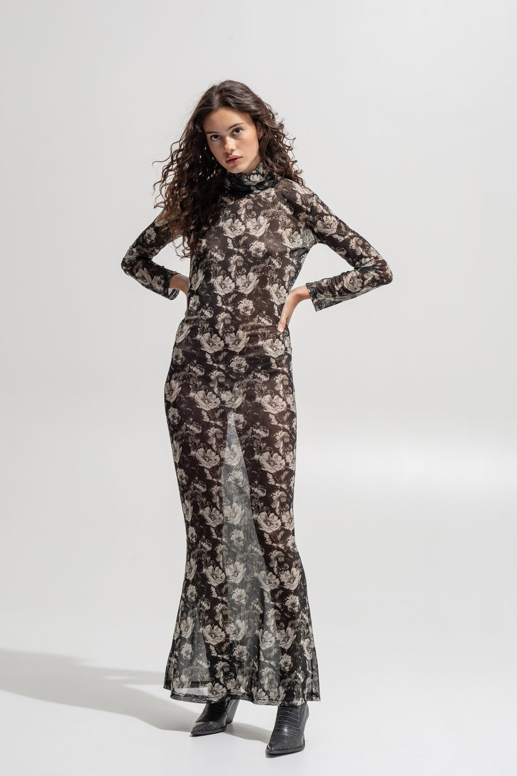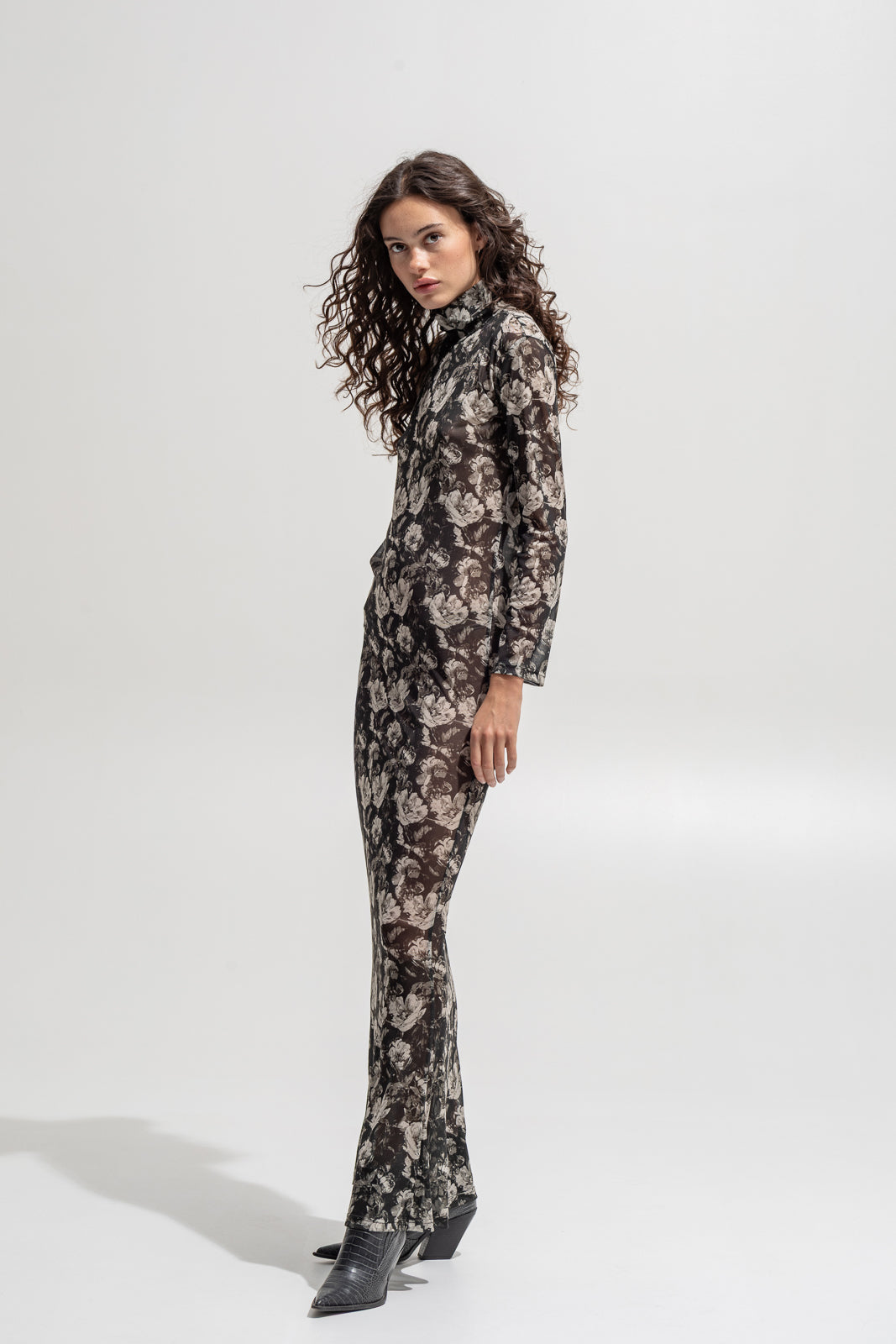 The mesh floral dress hugs the body with soft transparency and vintage-inspired florals in sepia and black.