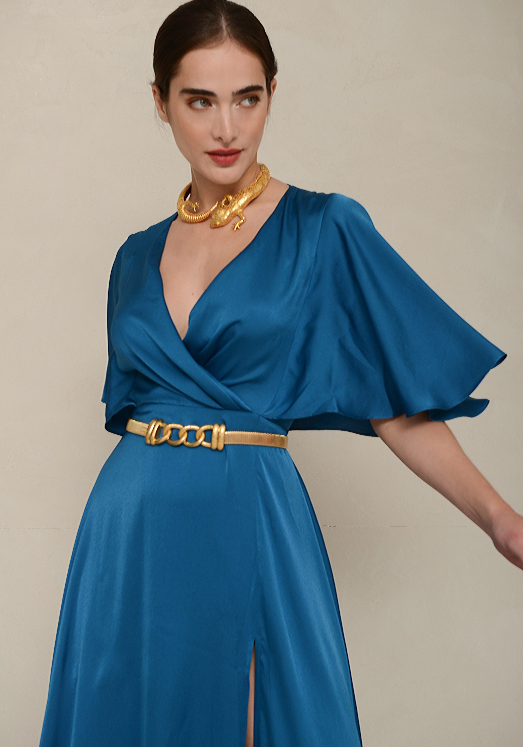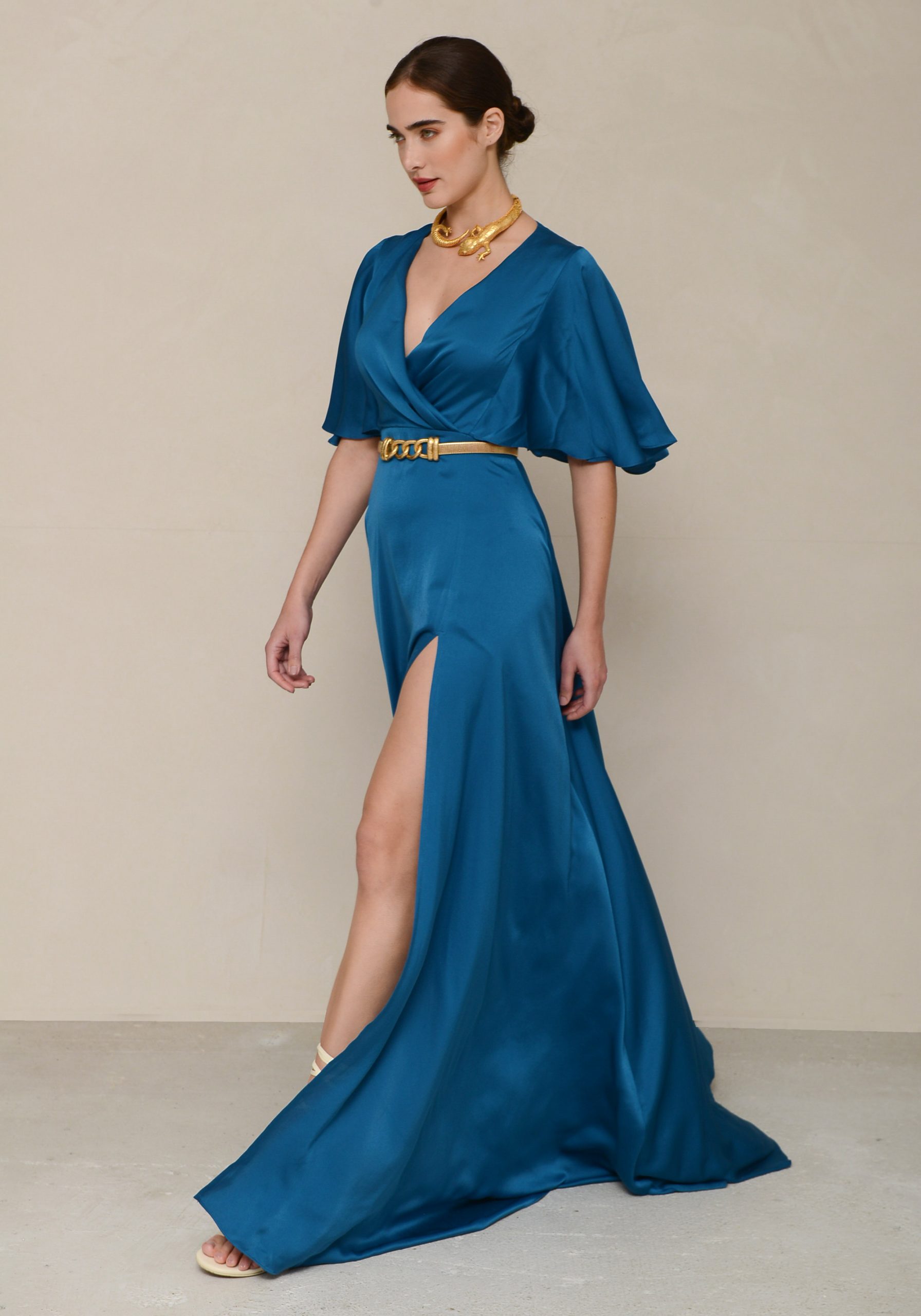 - Long dress in satin fabric with a V-neckline crouse, 2/4 sleeves and two slits in the front.