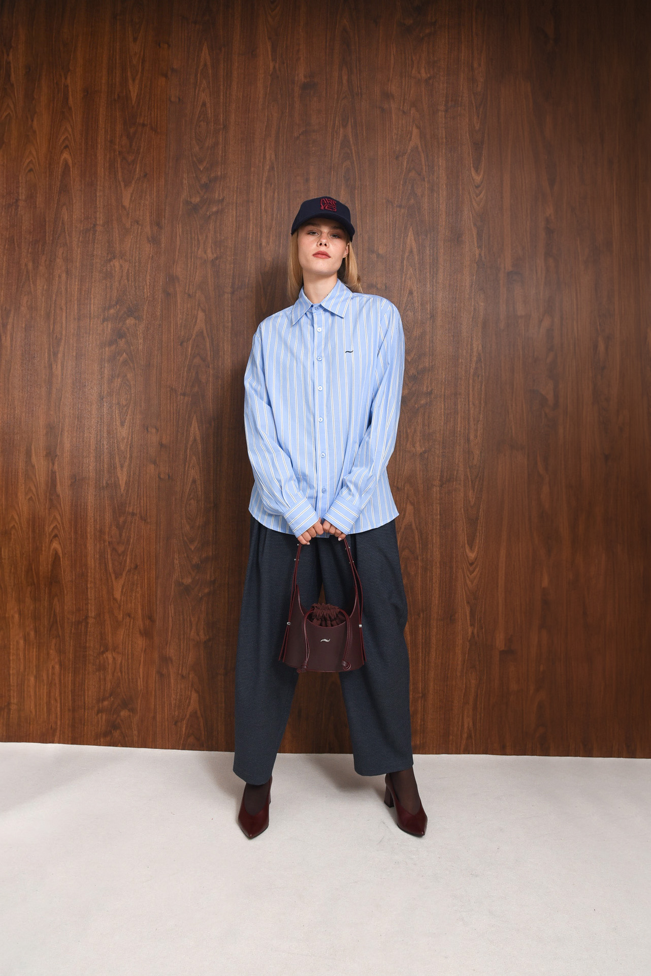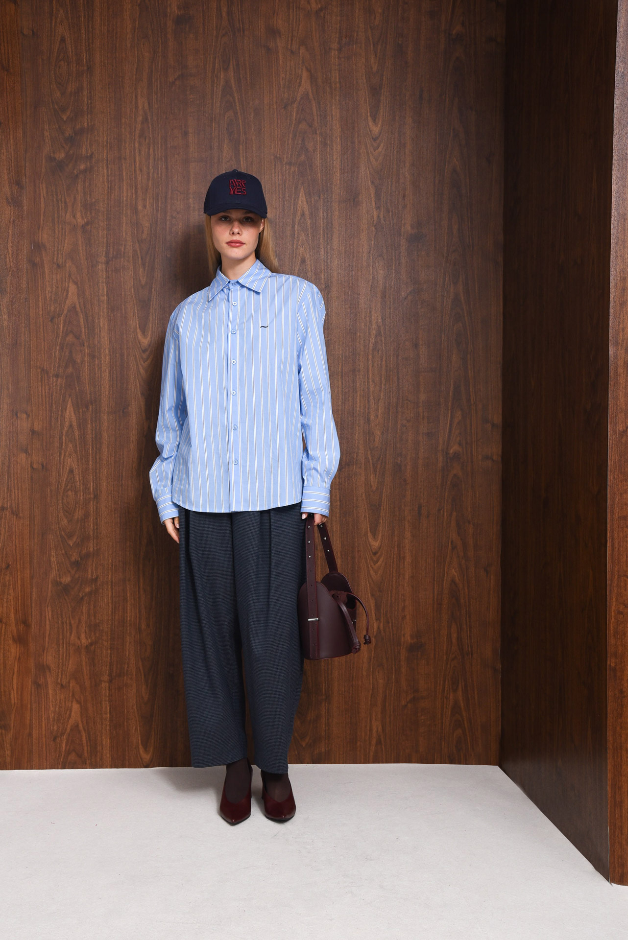 Bold Shirt, a classic blue shirt with white stripes made from soft cotton. Designed with a relaxed fit, dropped shoulders, button-down front, and wide cuffs. It features a pointed collar and a small embroidered logo on the chest. Lightweight and easy to wear, it pairs perfectly with both tailored and casual pieces.