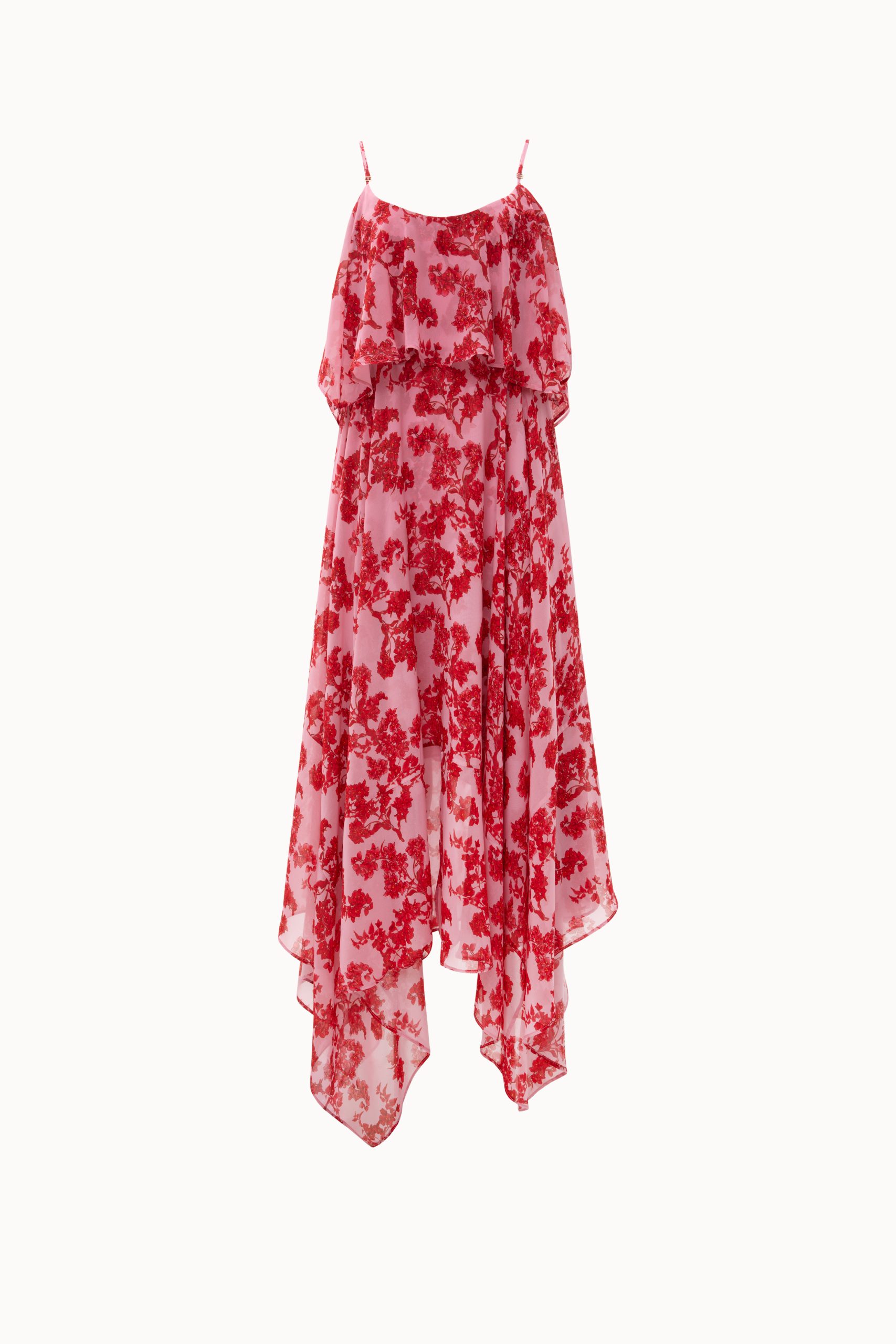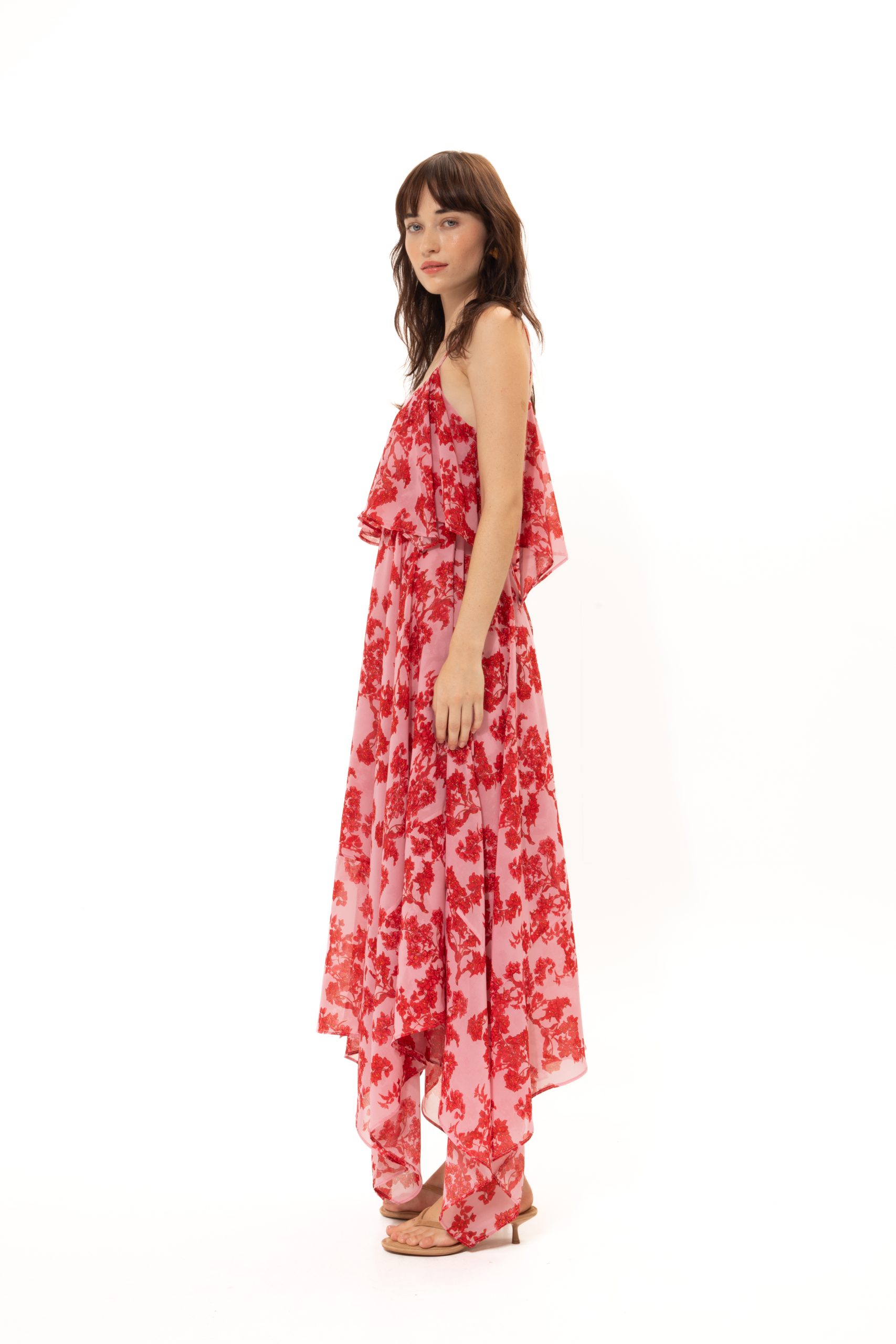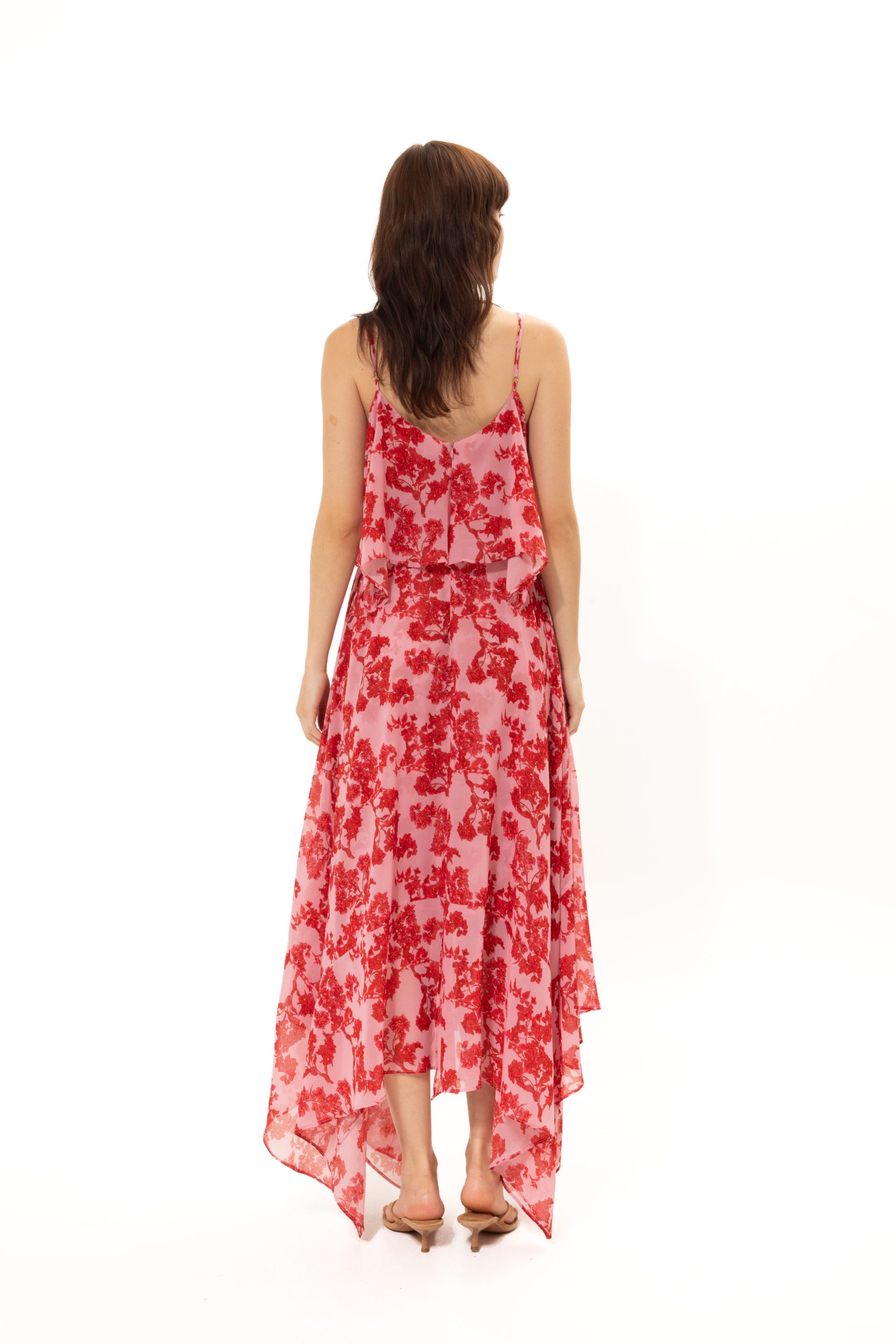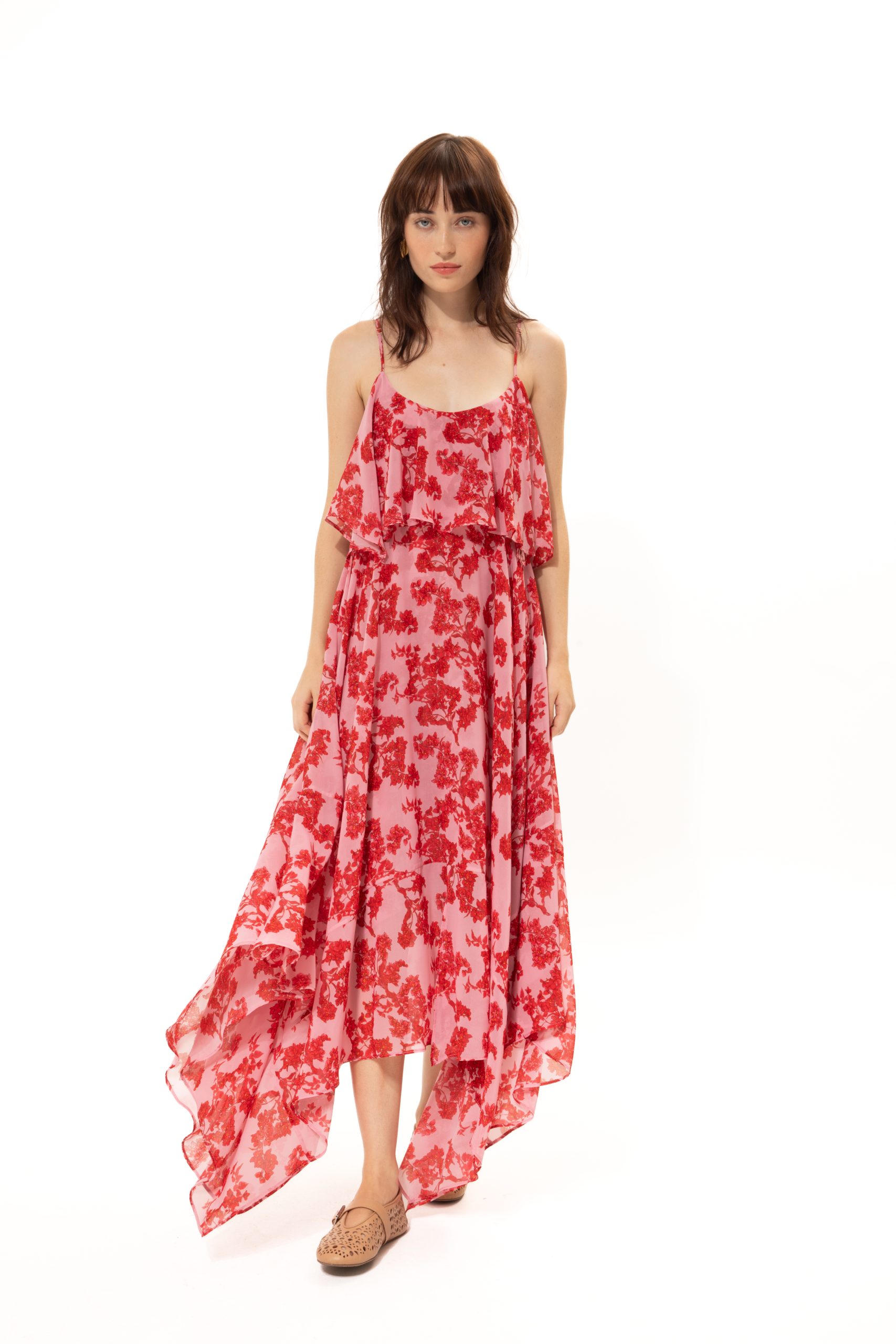 A flowy floral dream in bright bougainvillea blooms, designed to catch the breeze and the spotlight. With an elegant asymmetrical hem and layered bodice, it’s your go-to for garden parties and golden hours.