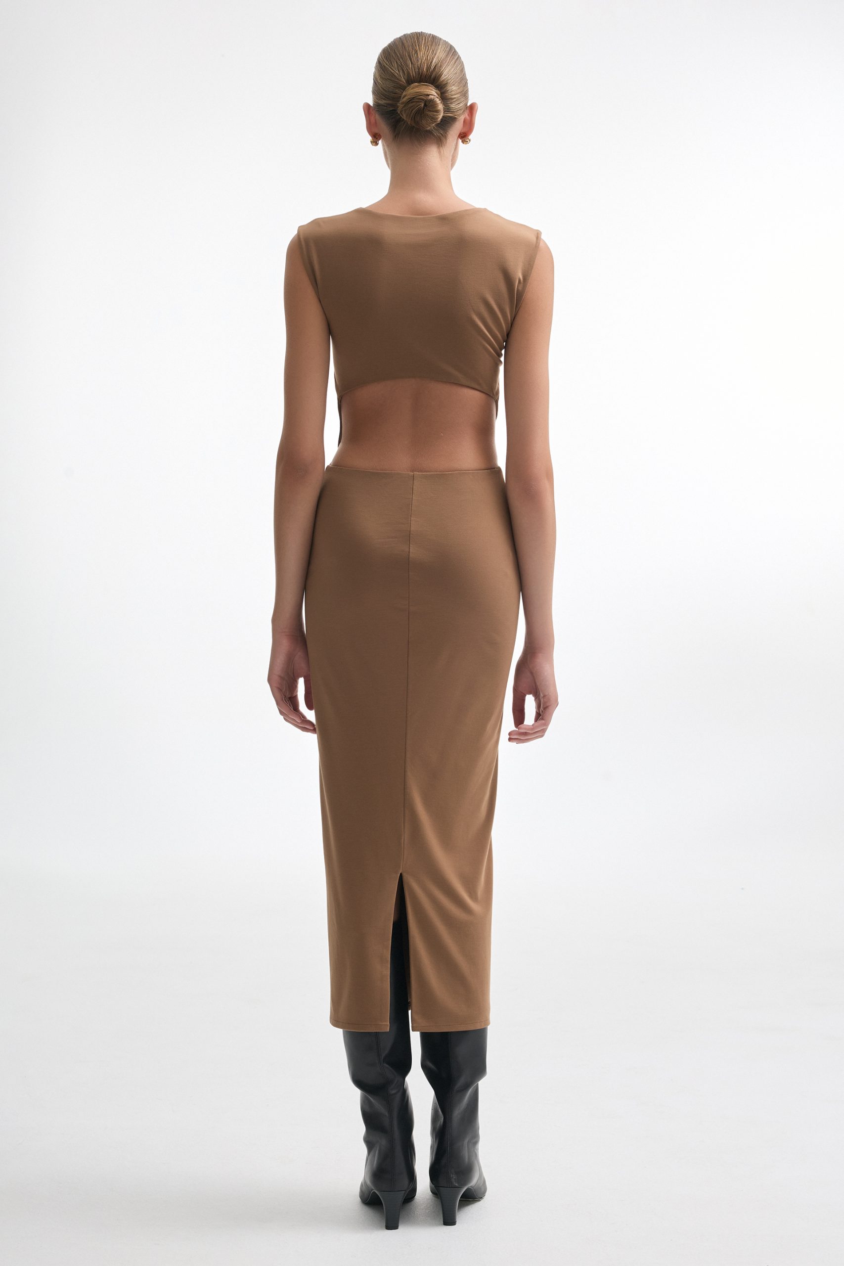 The Brooke dress is minimal yet daring, a piece that embraces the body with fluid ease, highlighting the silhouette without excess. The refined cap sleeves and softly draped neckline bring elegance, while the open-back cut-out introduces a modern, unexpected edge. It’s the kind of dress that moves seamlessly from evening gatherings to special occasions, always with quiet confidence.