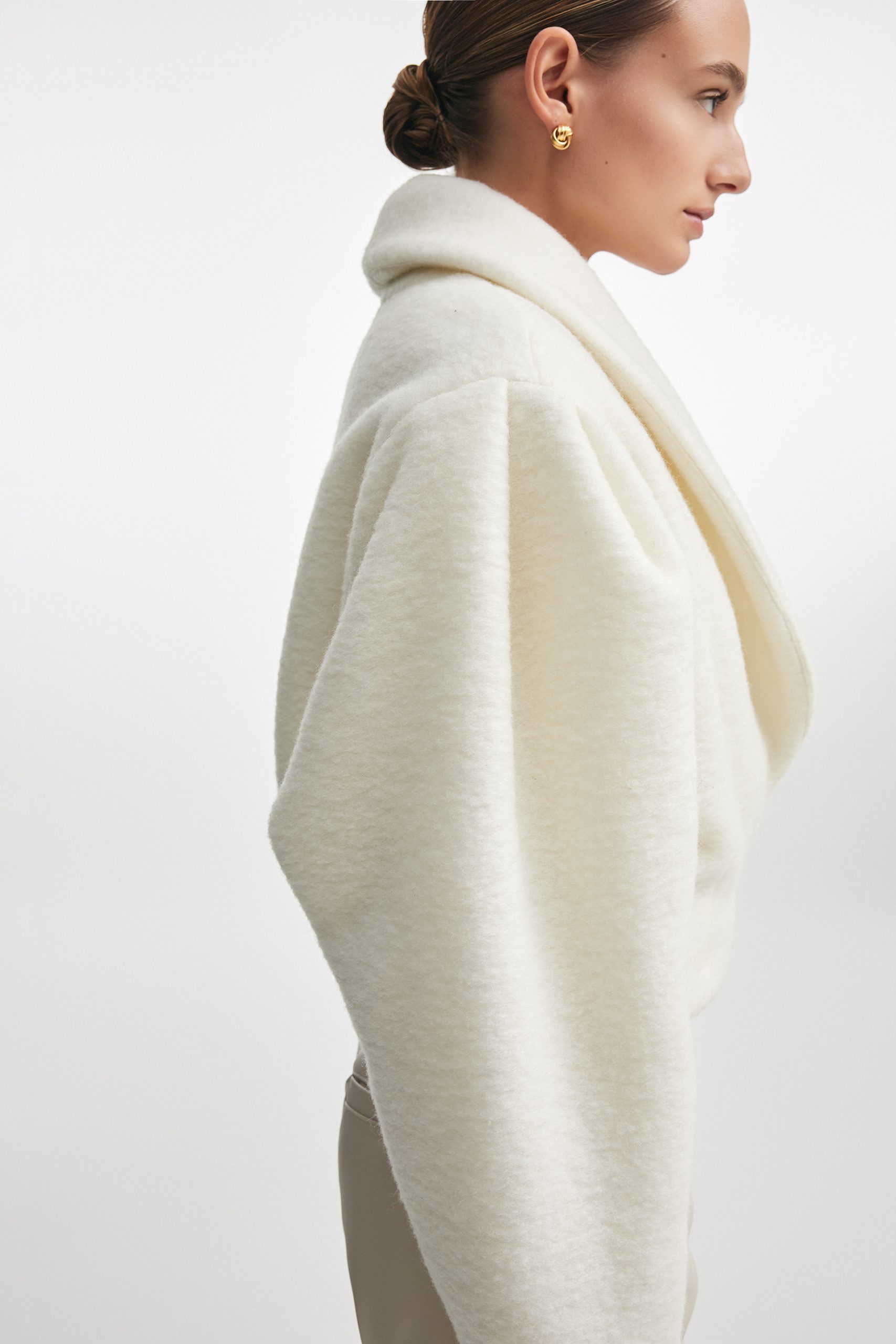 A cozy, minimal cropped jacket crafted from boiled wool, designed for clean and contemporary lines. Its relaxed fit, soft shoulders, and cropped silhouette create an elegant and feminine look, perfect for effortless everyday layering.