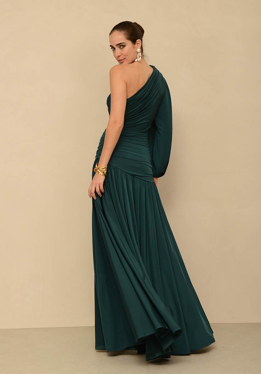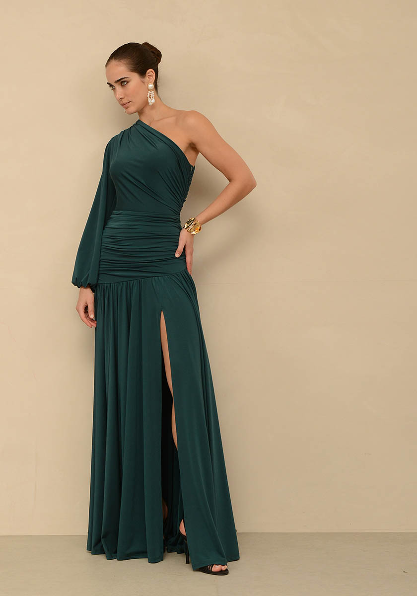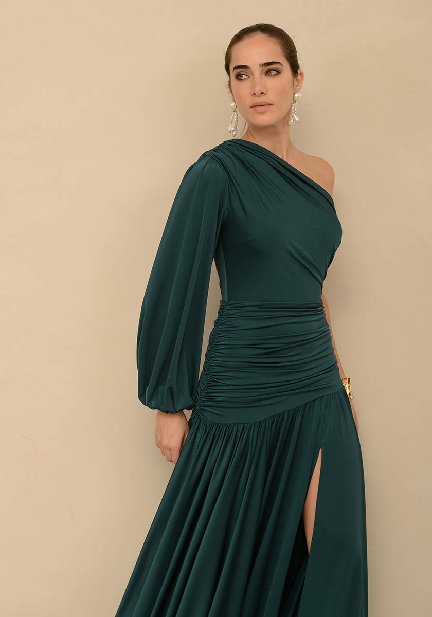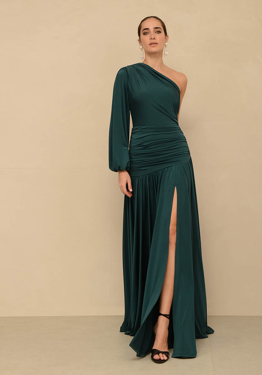 - Long dress with one shoulder and puffed sleeve in jersey fabric and front slit.