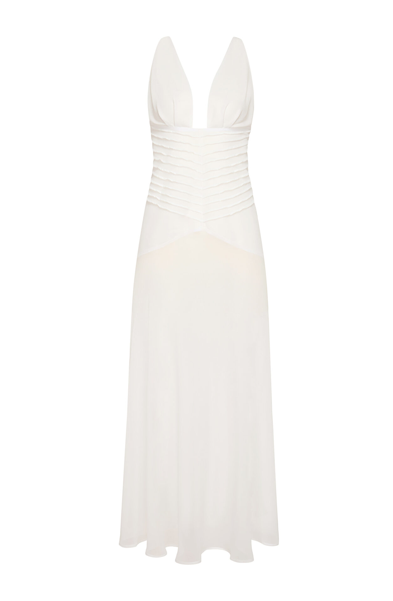 - A maxi gown with a deep V on the front, open back & pleated movement.