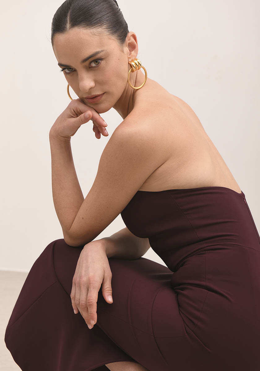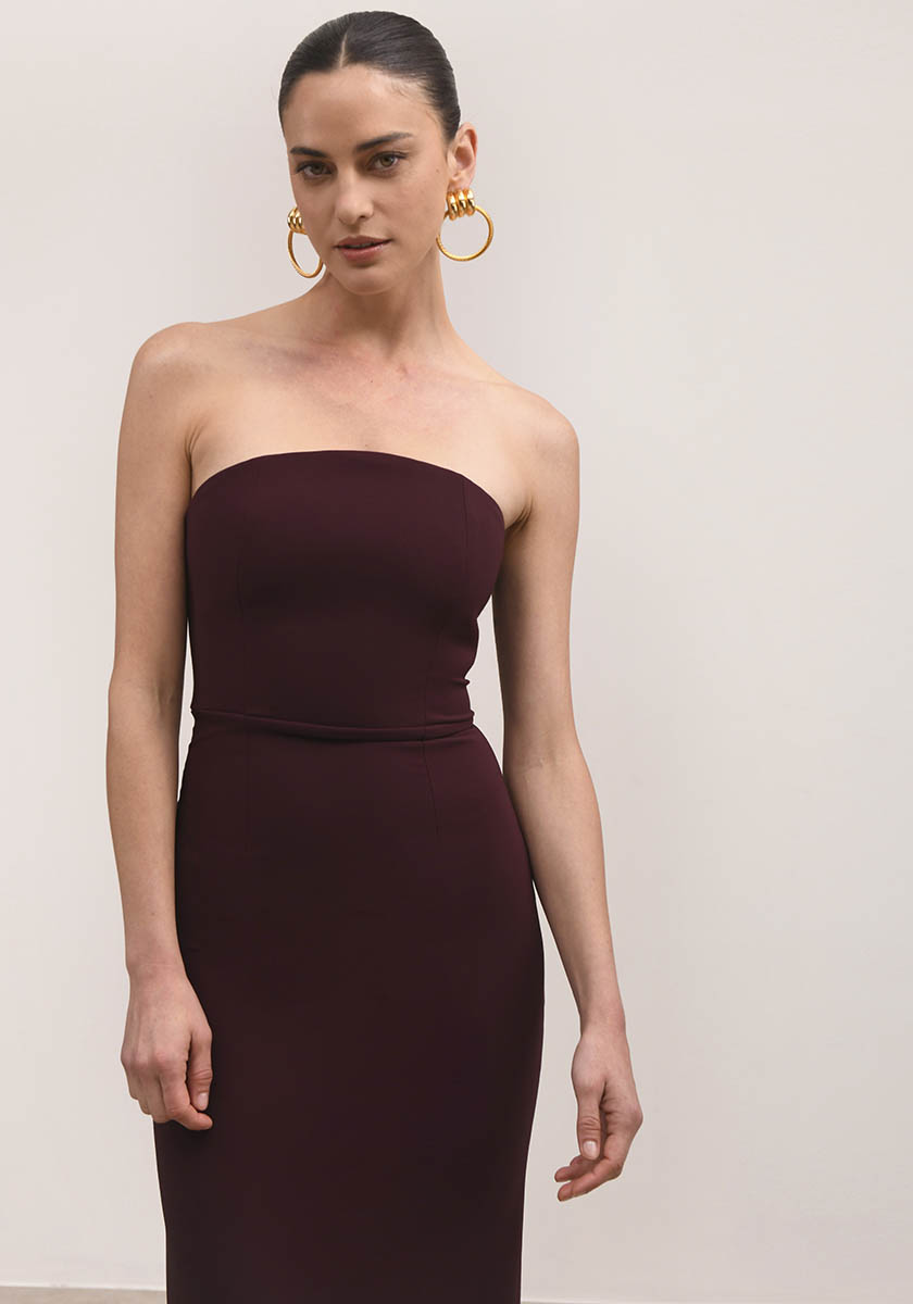 Μίντι στράπλες φόρεμα από κρεπ ύφασμα. Διαθέτει σκίσιμο στο πίσω μέρος ώστε να υπάρχει ευκολία στην κίνηση. Φερμουάρ στο πίσω μέρος.