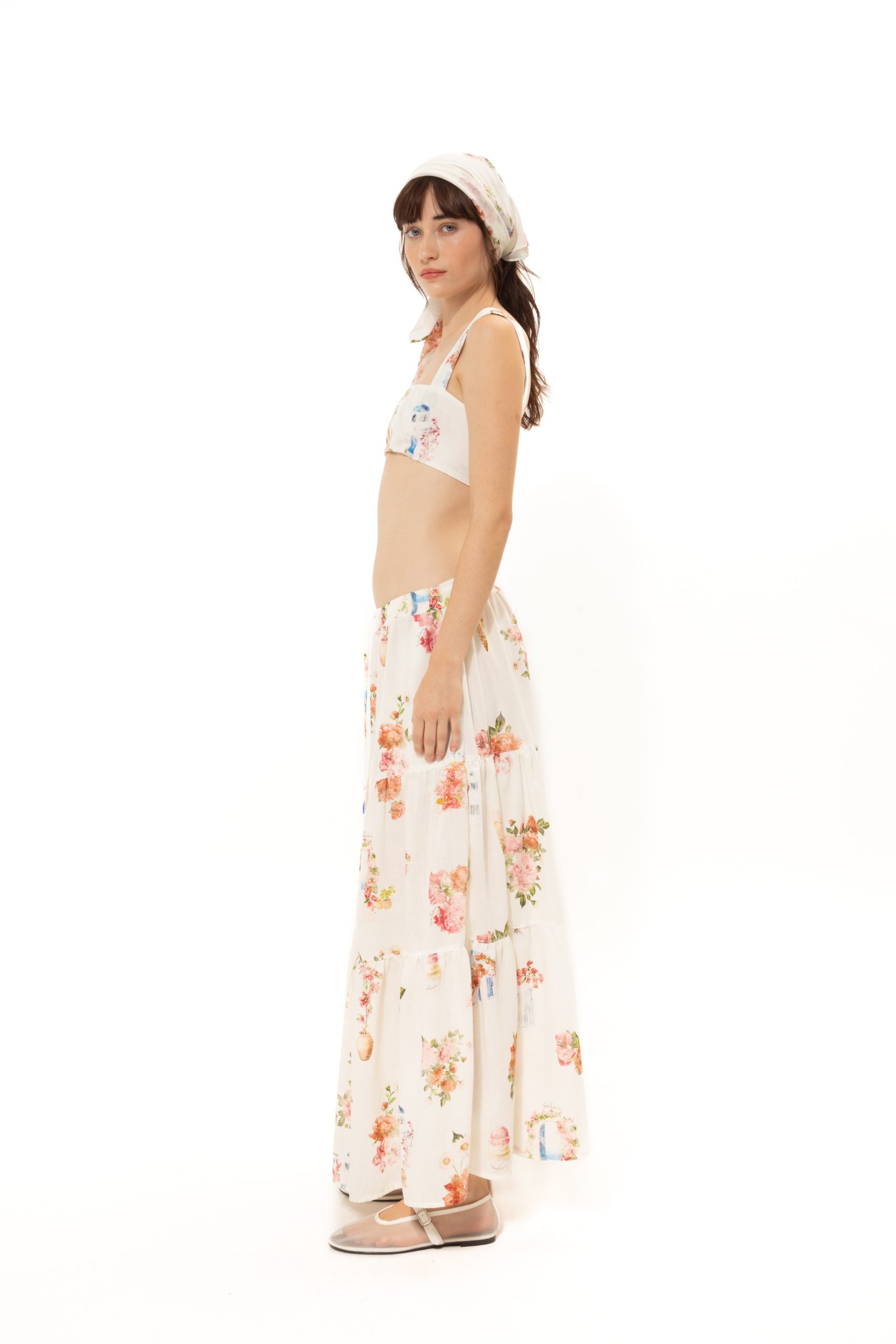 Whitewashed walls, blooming bougainvillea, and summer skies come to life in this wearable escape.