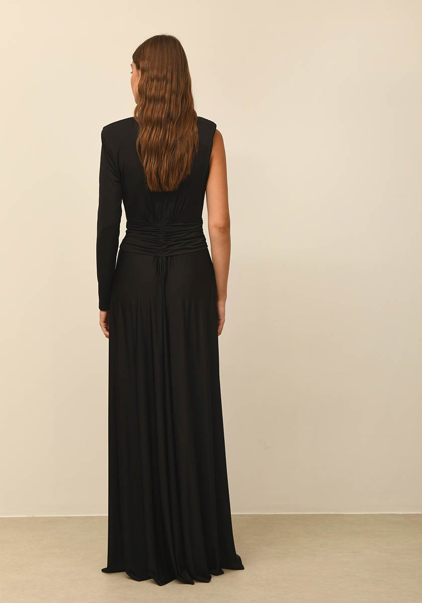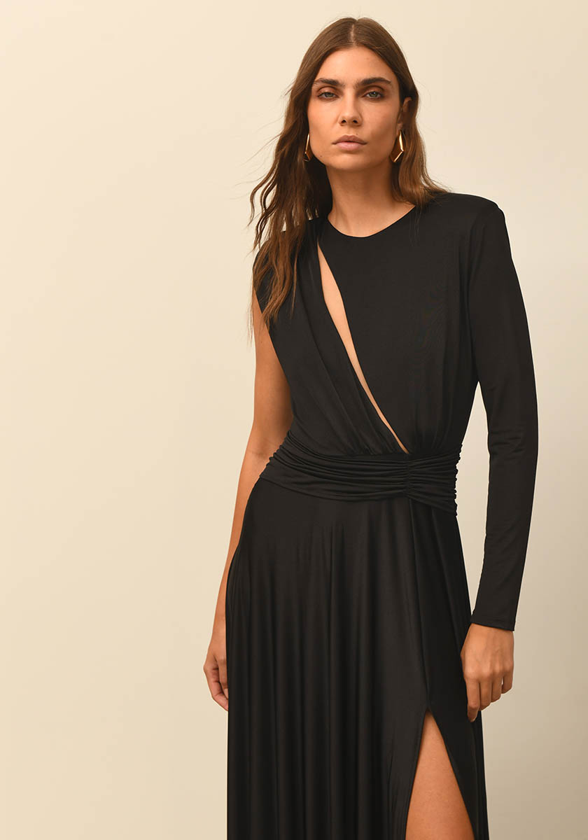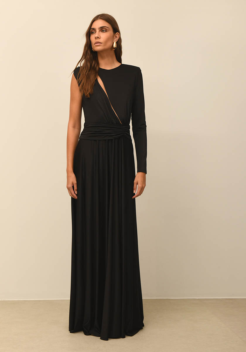 - Long dress in jersey stretch fabric with one sleeve. Especially open with transparency on the chest and detail on the waist with souras. A-line skirt with front slit. Zipper at the back.