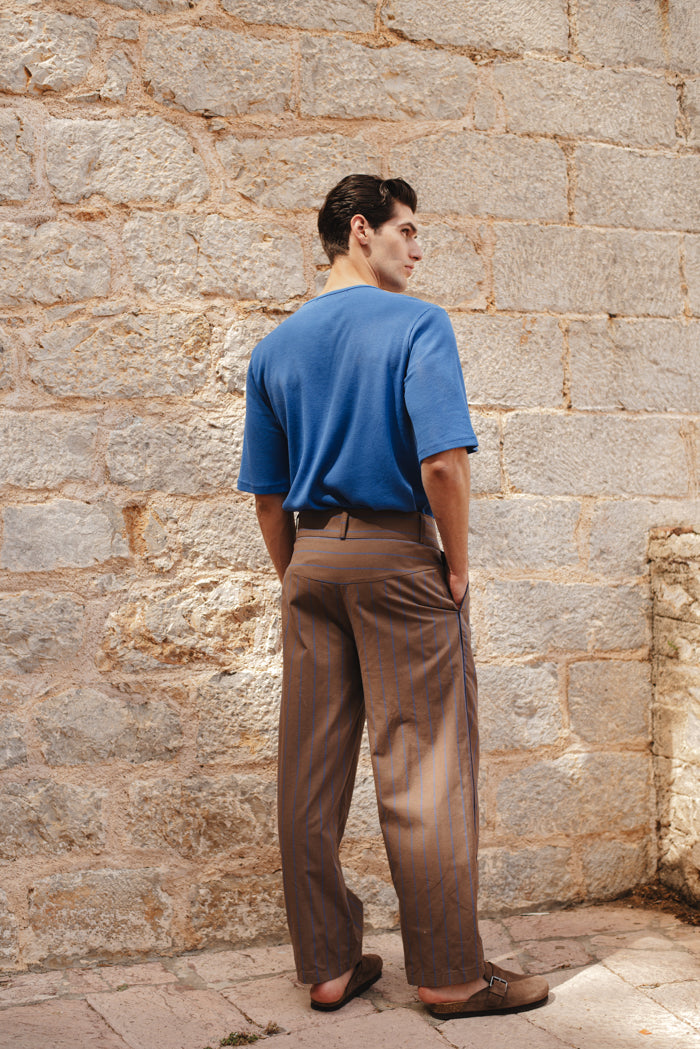 - Step up your style game with the Dario Striped Pants in Brown. These tailored pants feature a sophisticated striped pattern, adding a touch of elegance to any outfit. Crafted from premium fabric, they offer both comfort and durability. Perfect for both casual and formal occasions, these pants are a versatile addition to your wardrobe.
