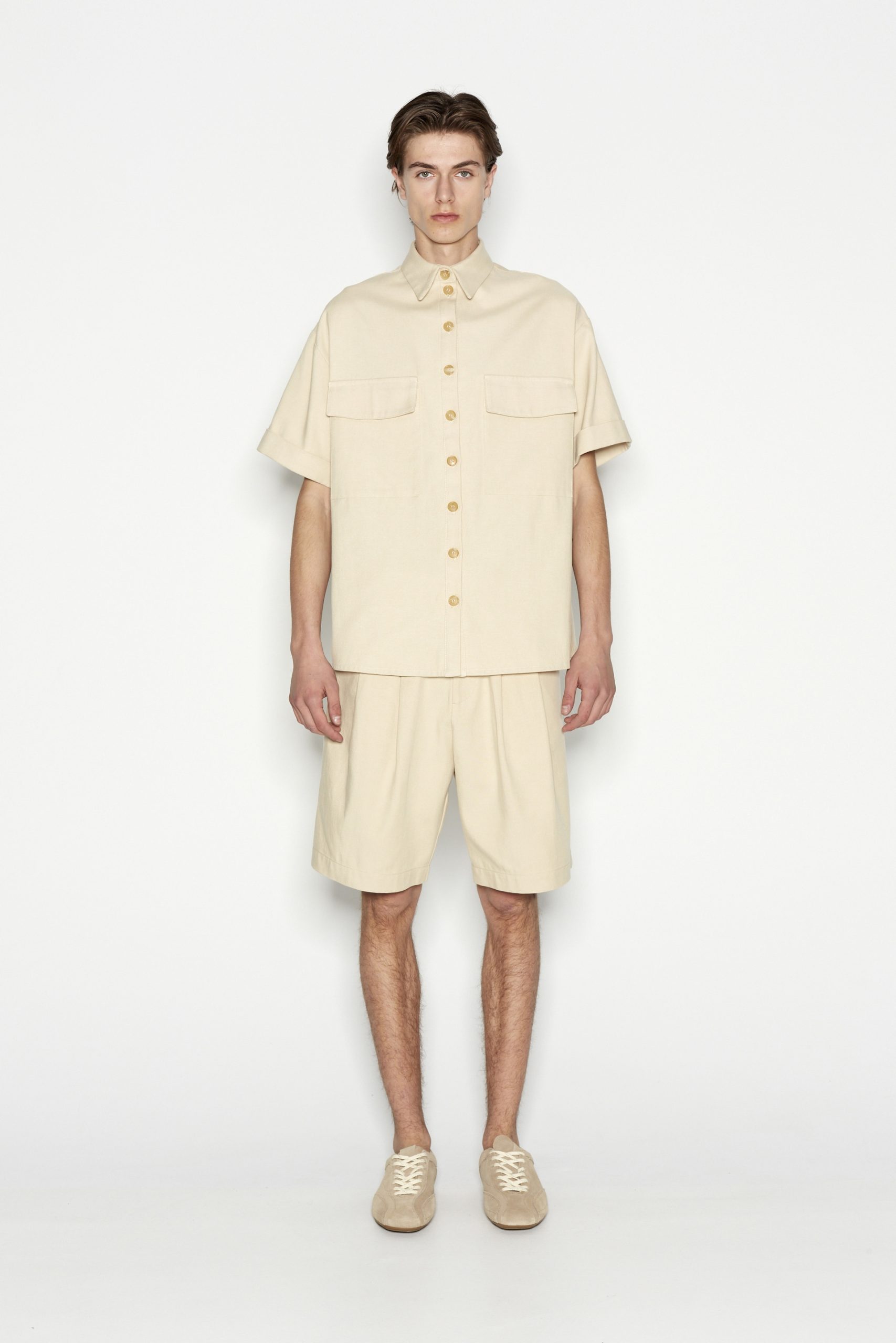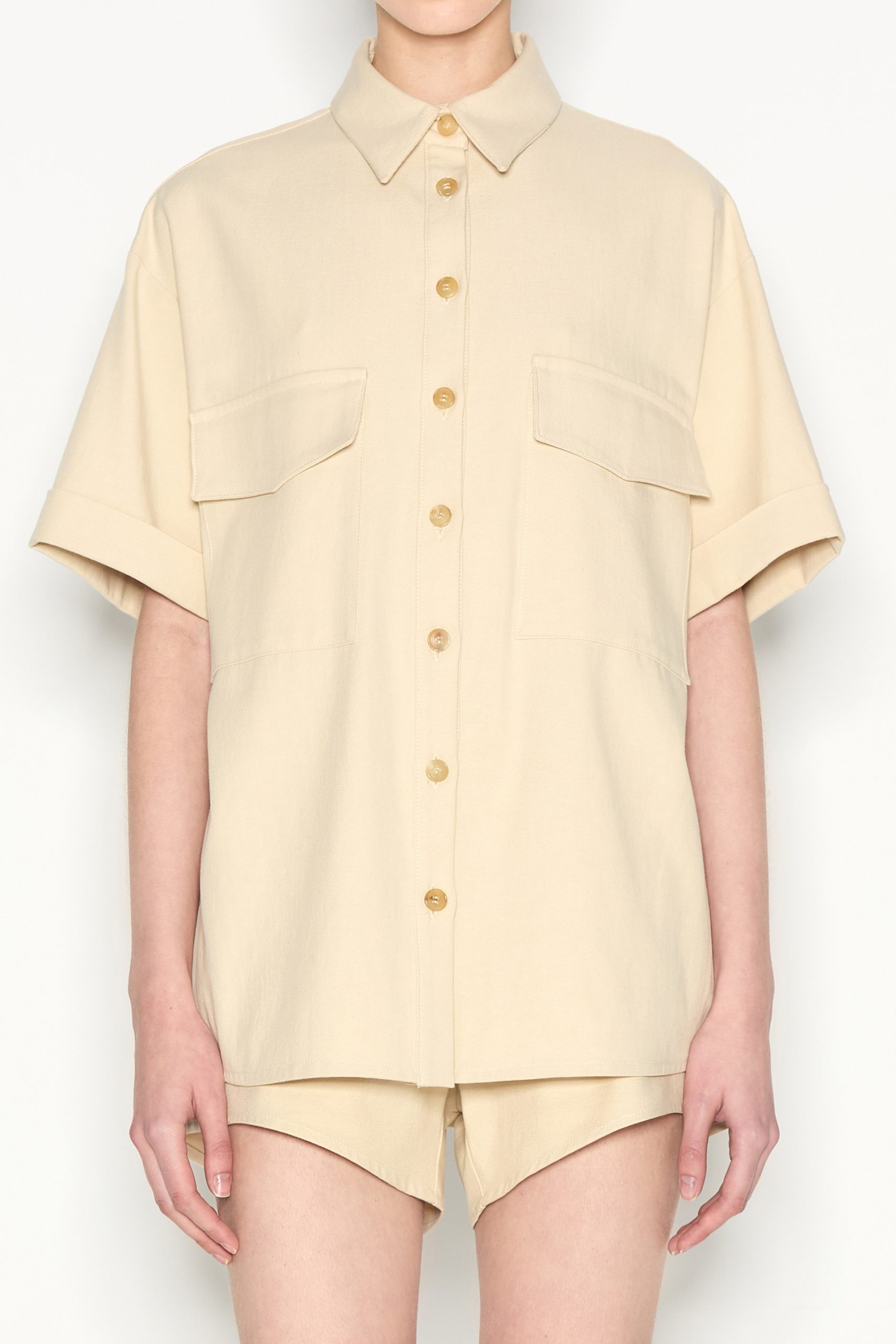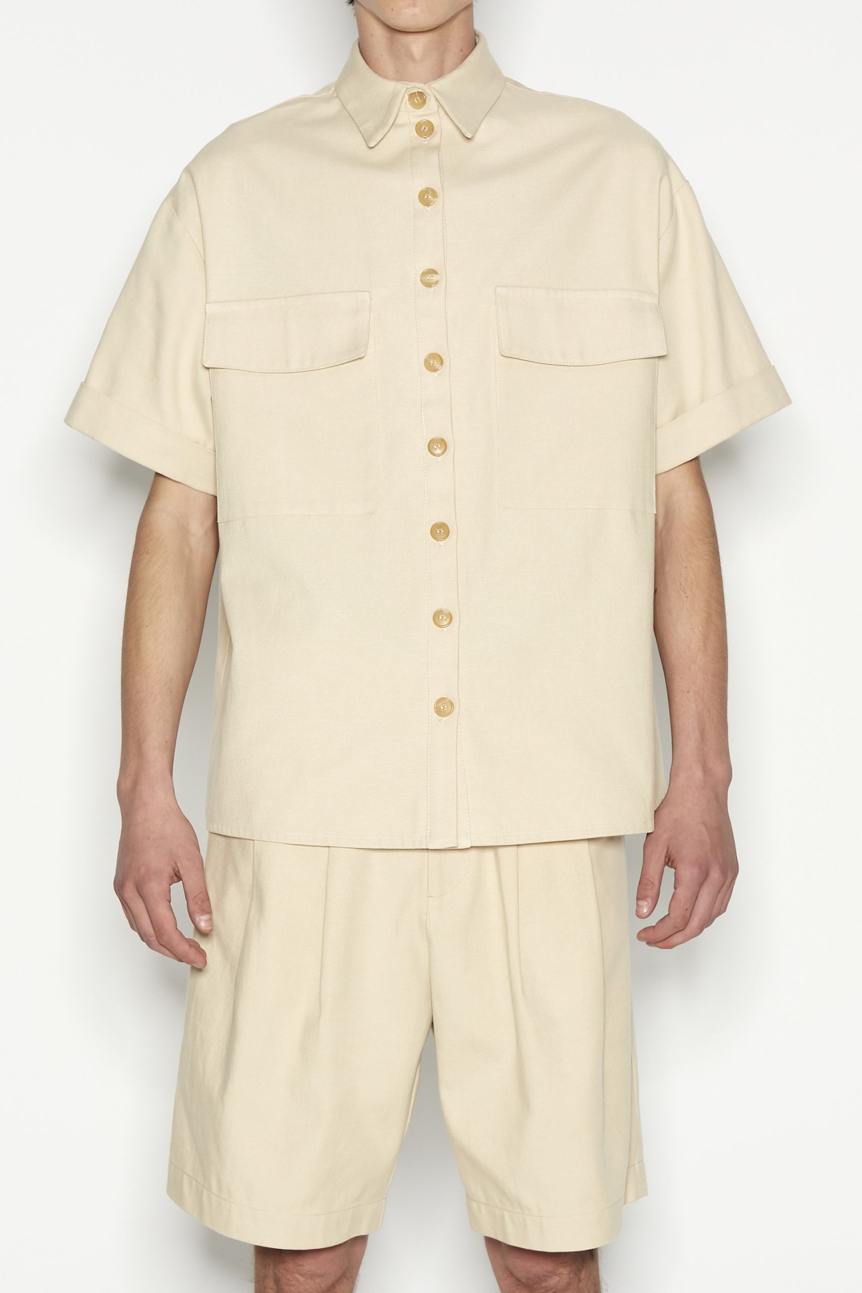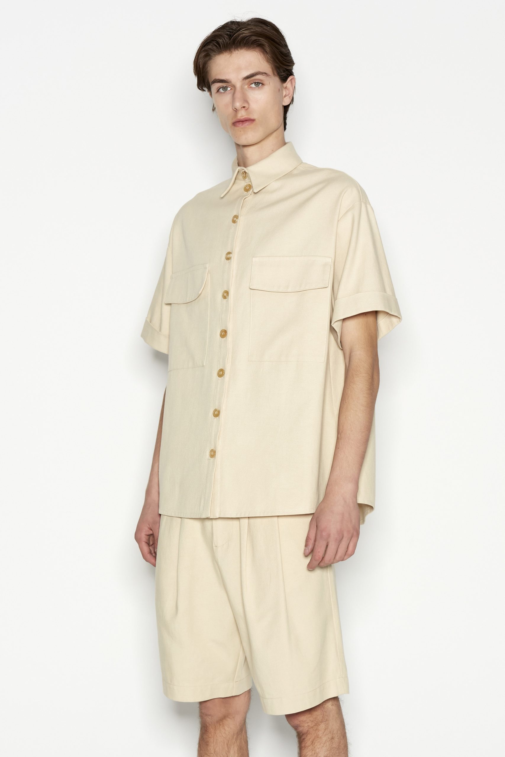 This short-sleeved shirt is a must-have for effortless style and versatility. Featuring a relaxed fit, a classic button-down front, and two statement chest pockets, this piece blends functionality with modern minimalism. The fabric makes it perfect for layering or wearing solo. Style it with matching trousers for a sophisticated look or with denim for a casual, laid-back vibe.