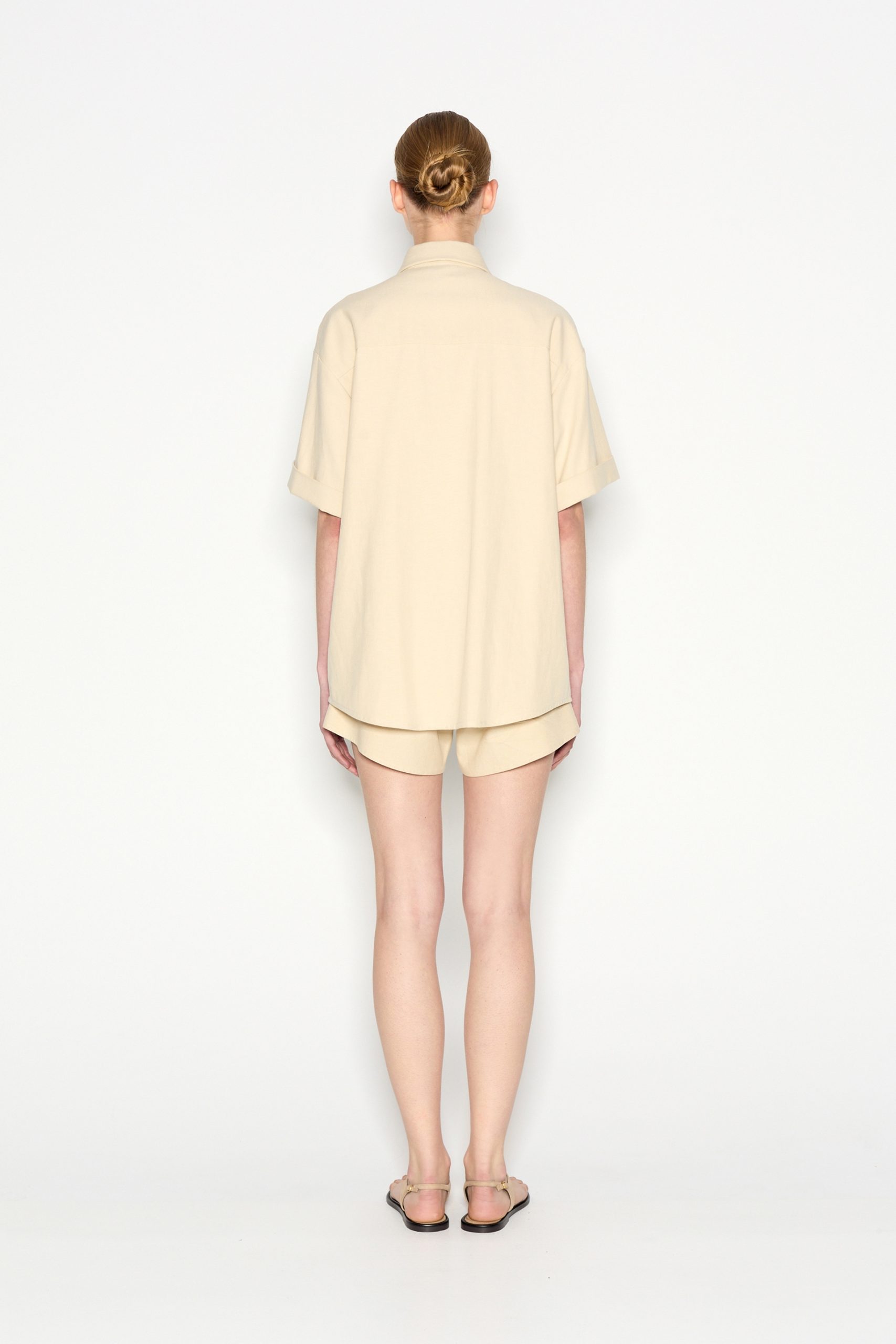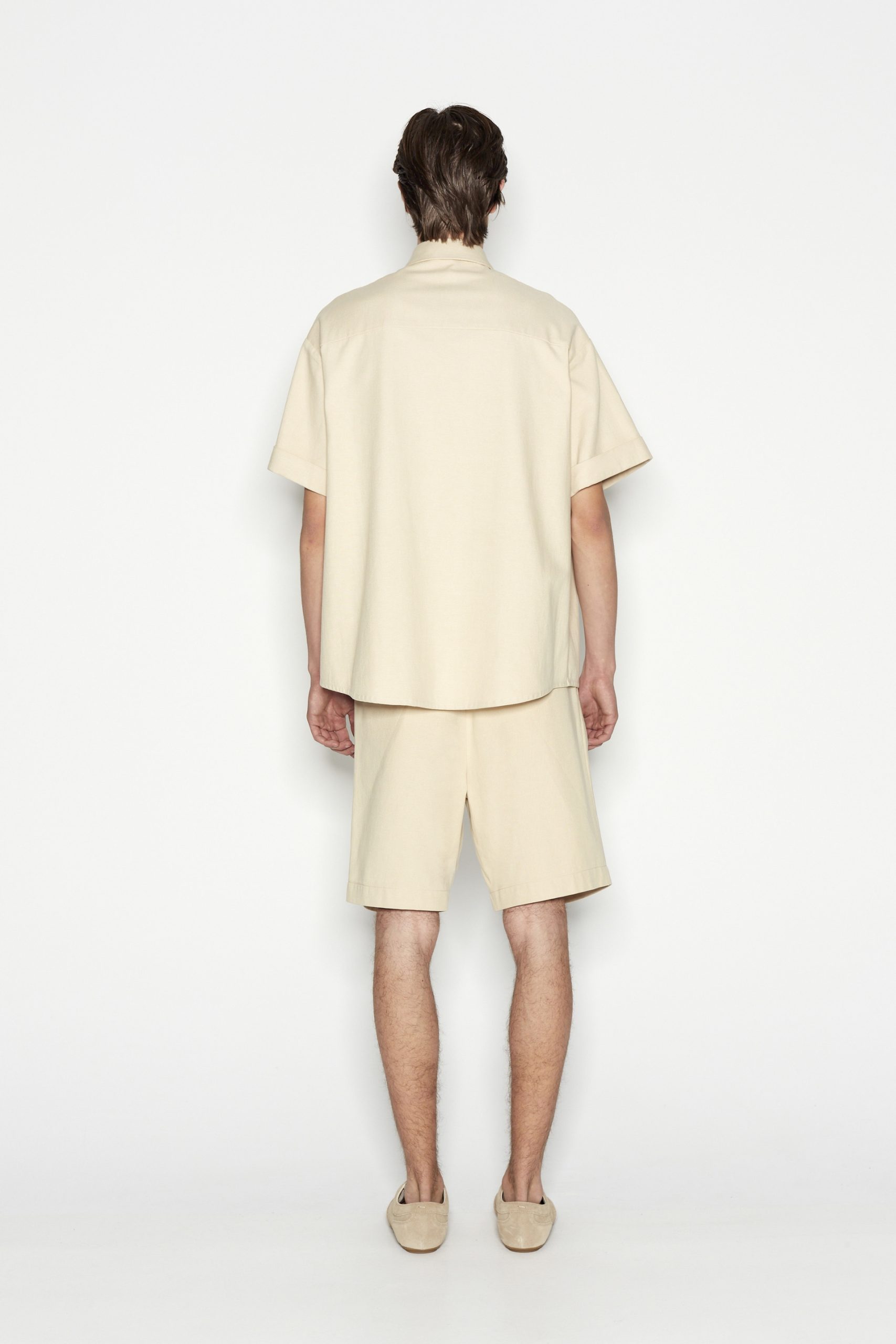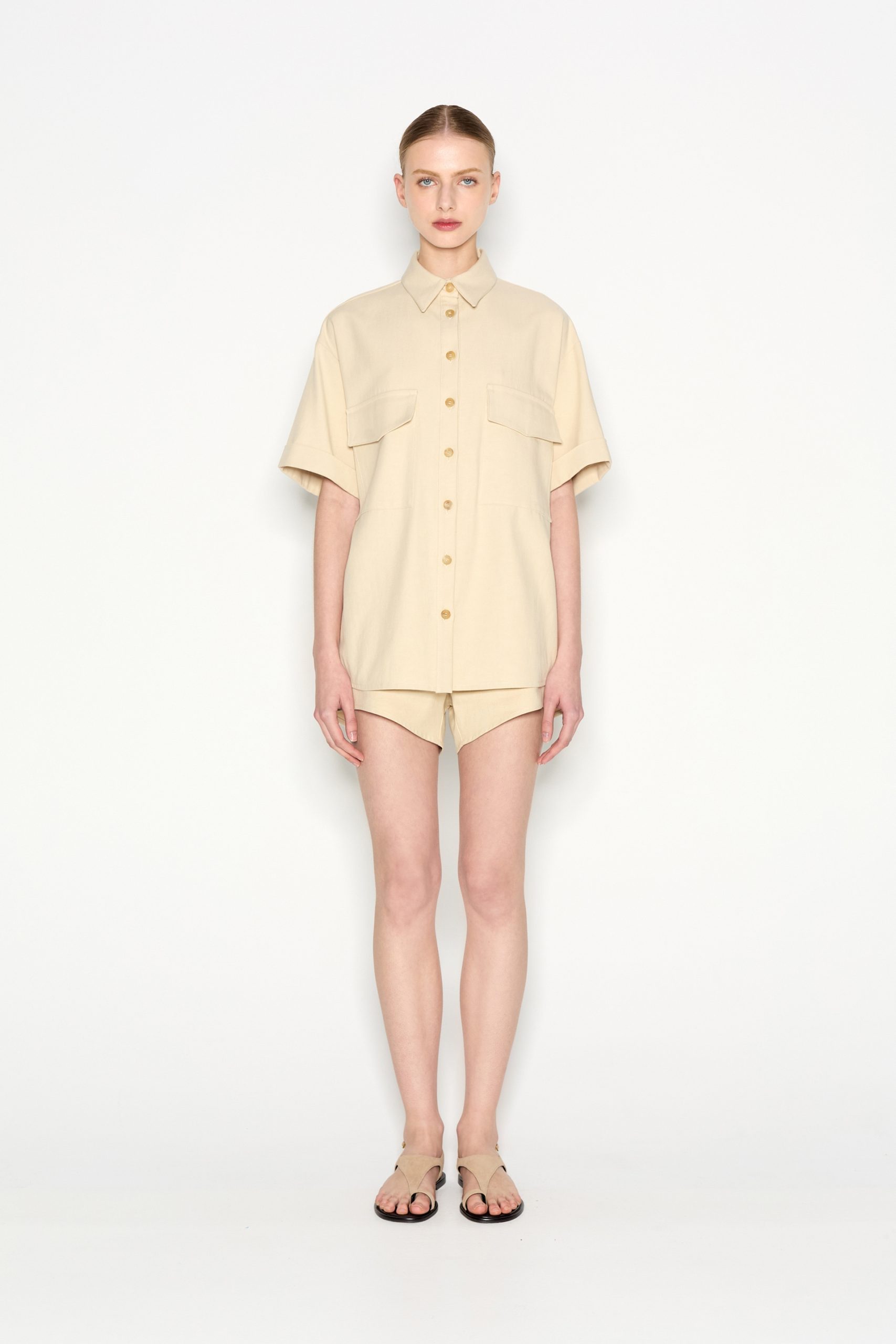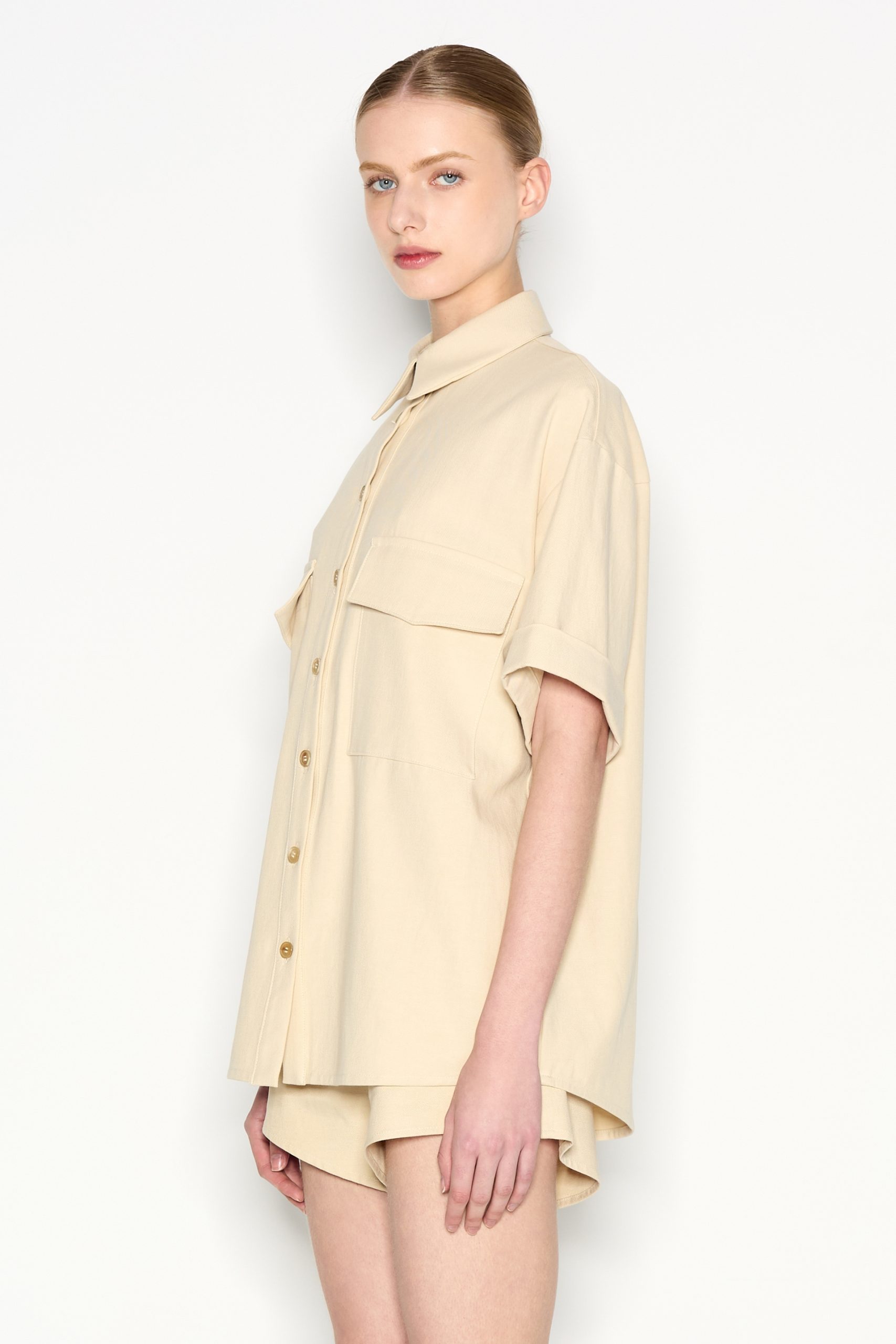 This short-sleeved shirt is a must-have for effortless style and versatility. Featuring a relaxed fit, a classic button-down front, and two statement chest pockets, this piece blends functionality with modern minimalism. The fabric makes it perfect for layering or wearing solo. Style it with matching trousers for a sophisticated look or with denim for a casual, laid-back vibe.