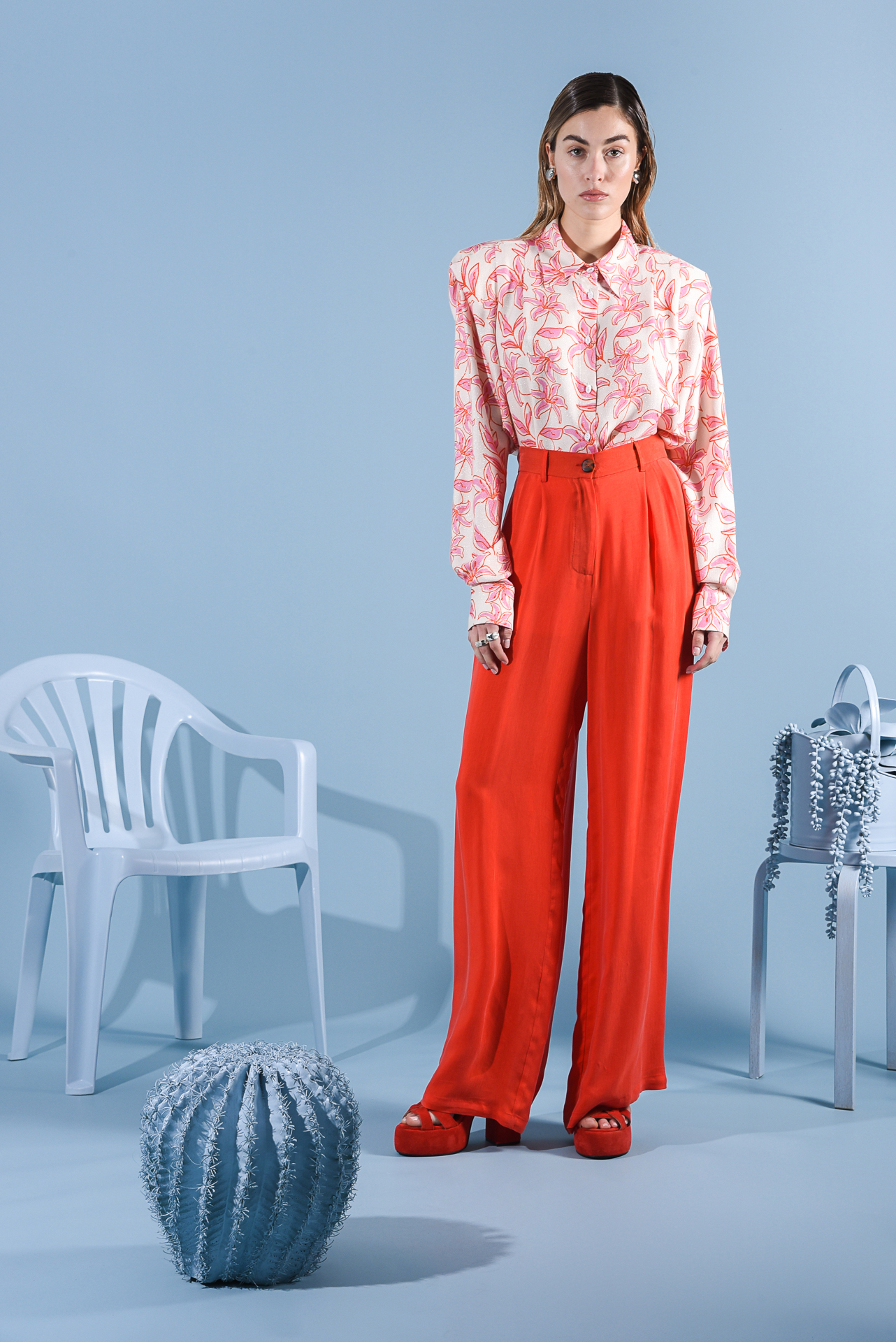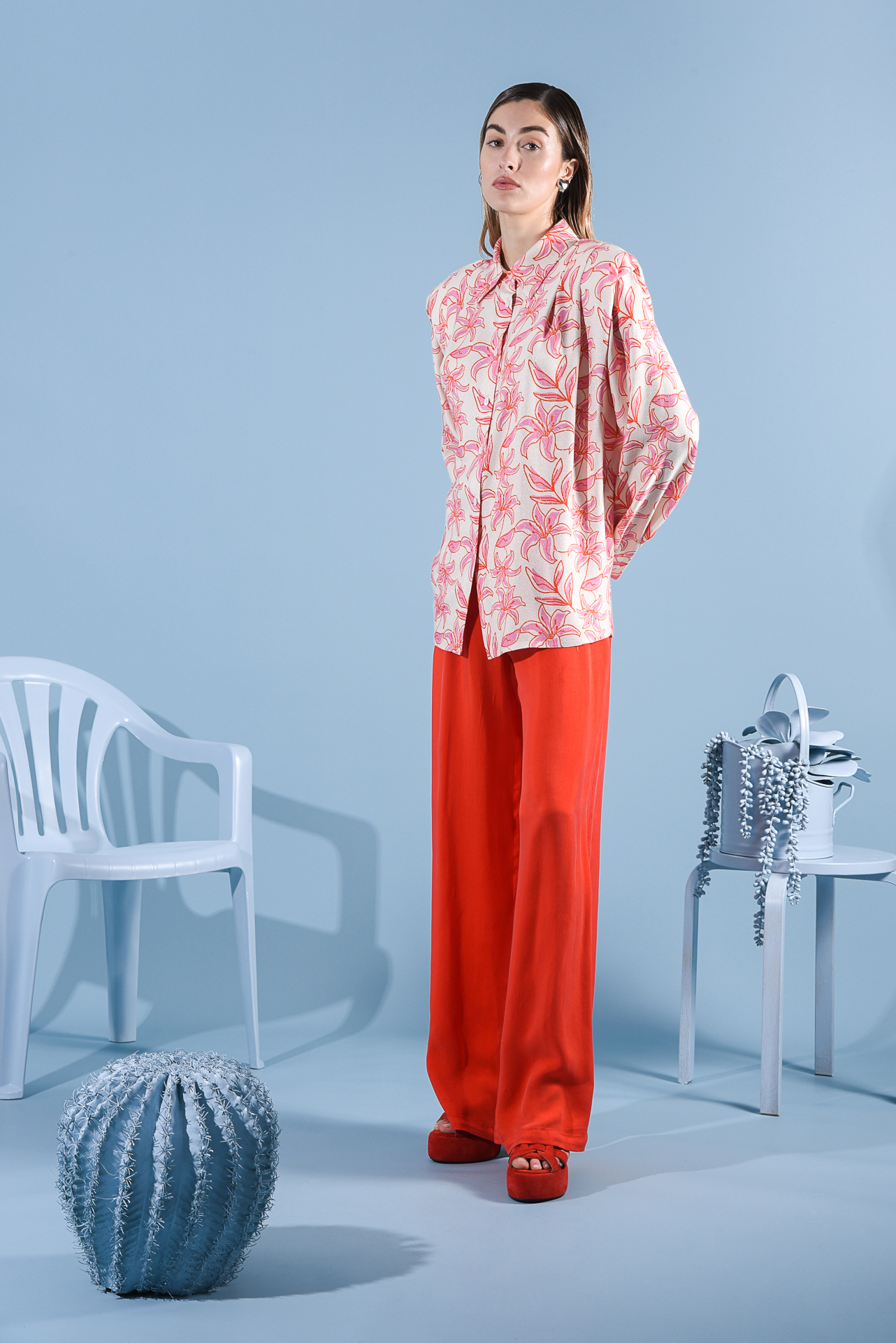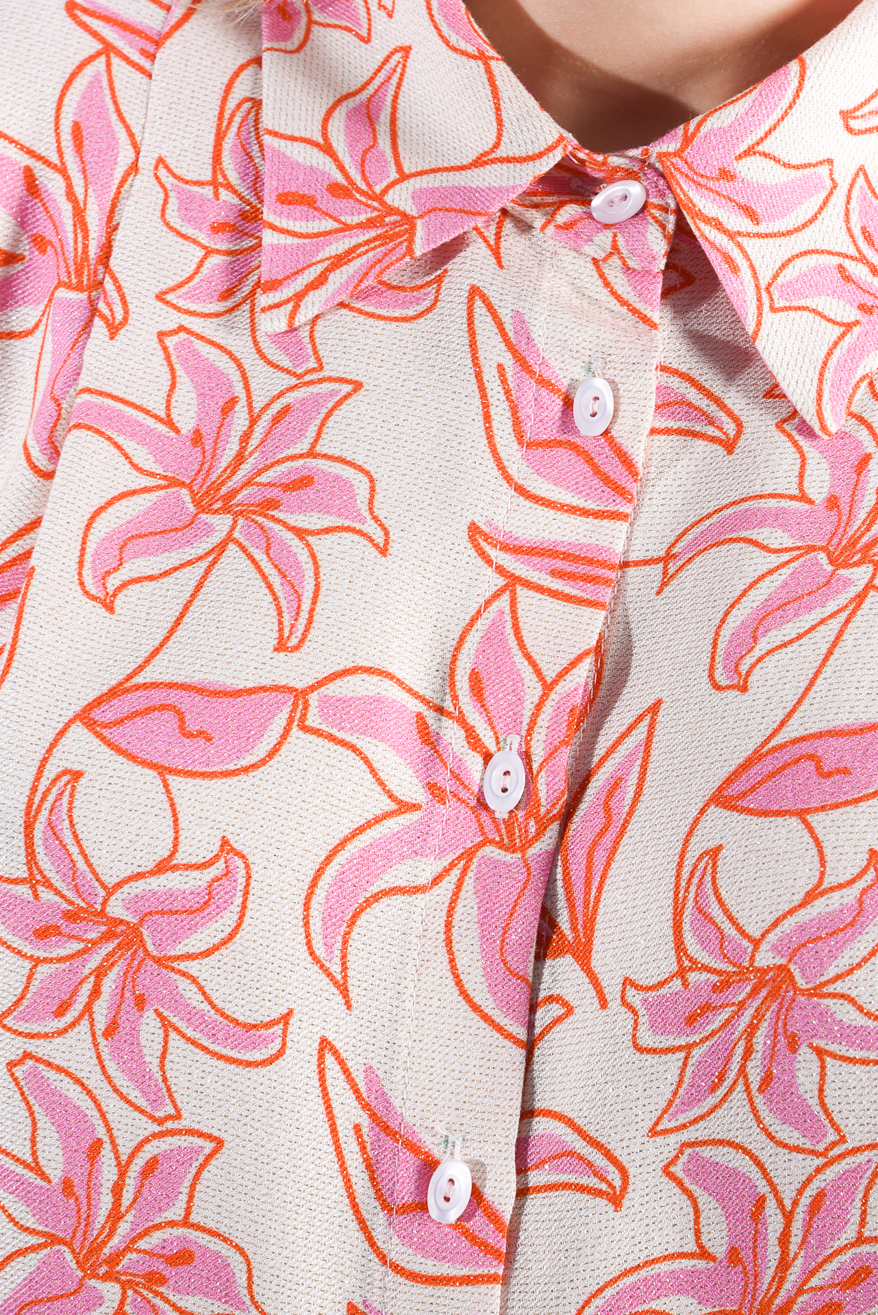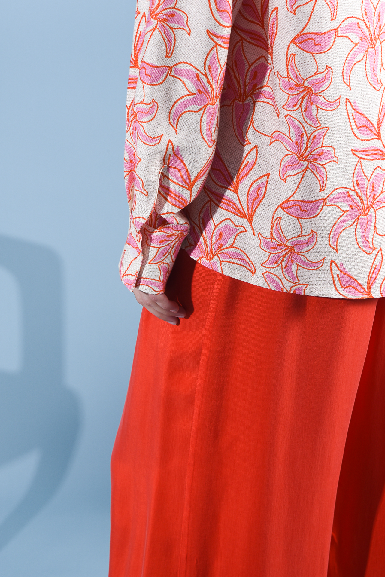 - The Dylan shirt boasts a distinctive print adorned with graphic-inspired flowers, adding a touch of charm to its design. Crafted from lurex-viscose fabric, it exudes an alluring sheen and texture. Complete with padded shoulders for a structured look and oval buttons for added detail, this shirt offers both style and sophistication. Pair it with the Garner pants for a coordinated ensemble.