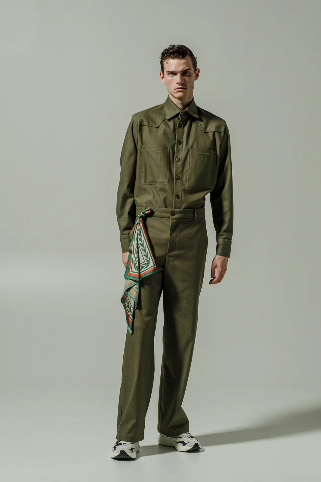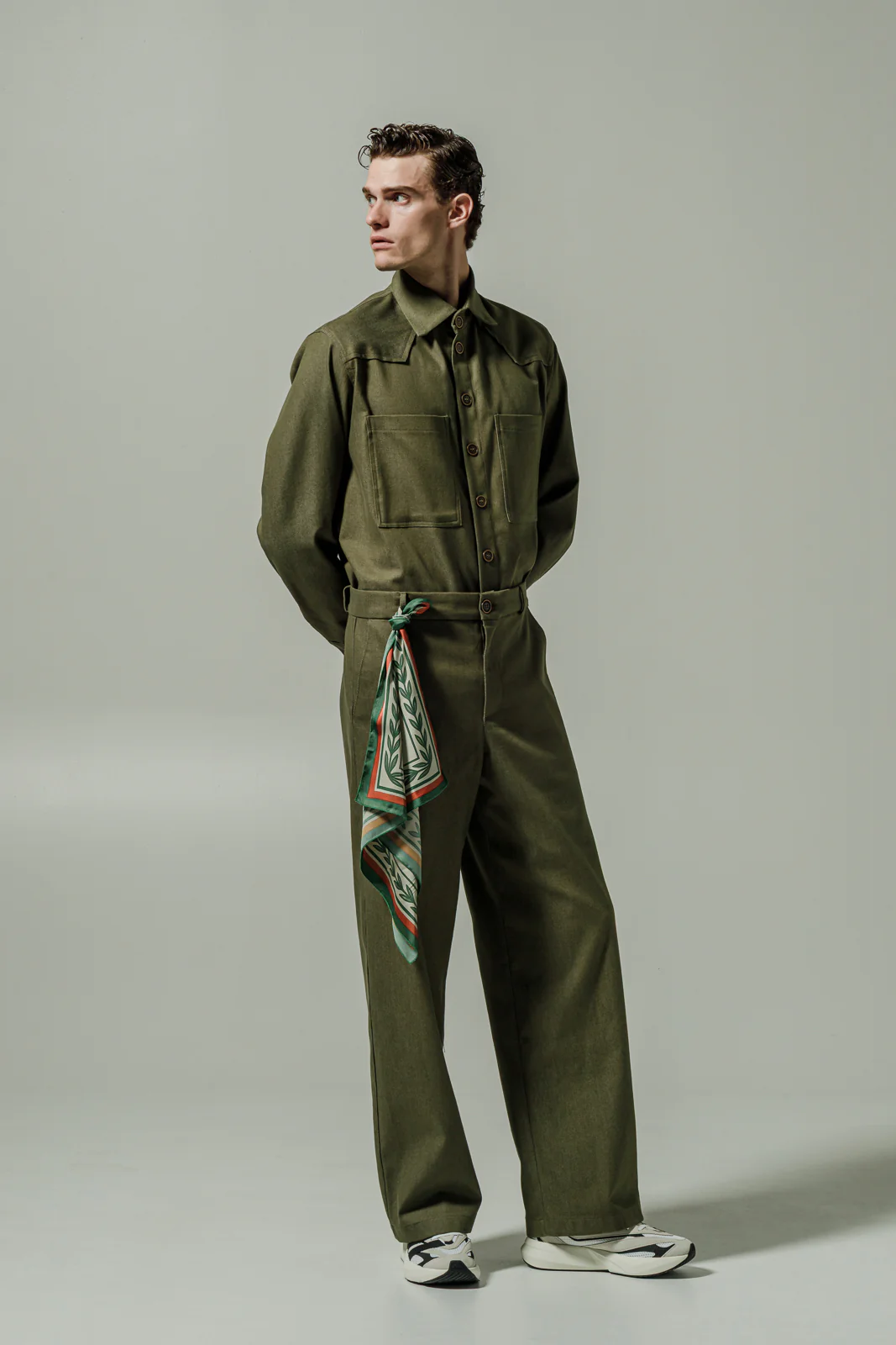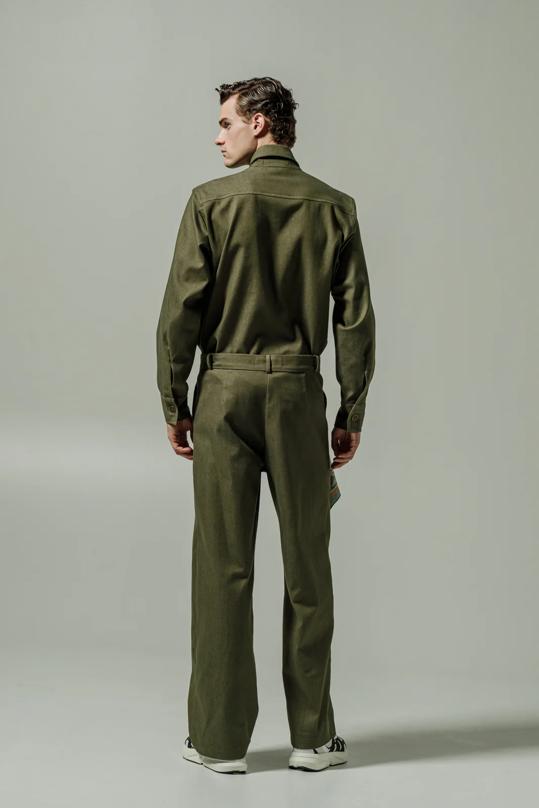 Denim pants in muted green with a straight, structured silhouette. Crafted from sturdy cotton, they offer durability with refined simplicity. The clean design makes them versatile for both casual and elevated looks. A timeless piece that merges everyday ease with understated sophistication.