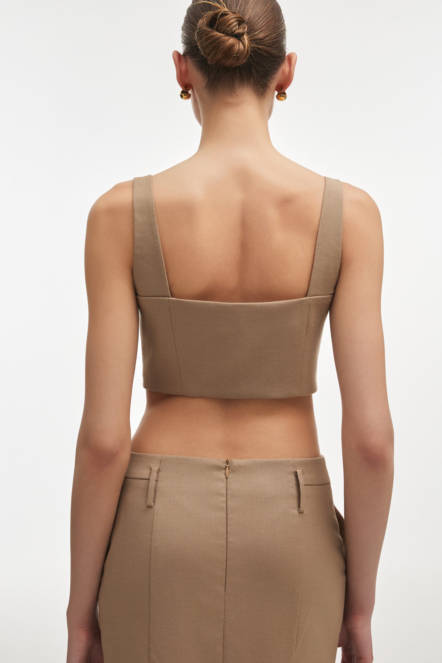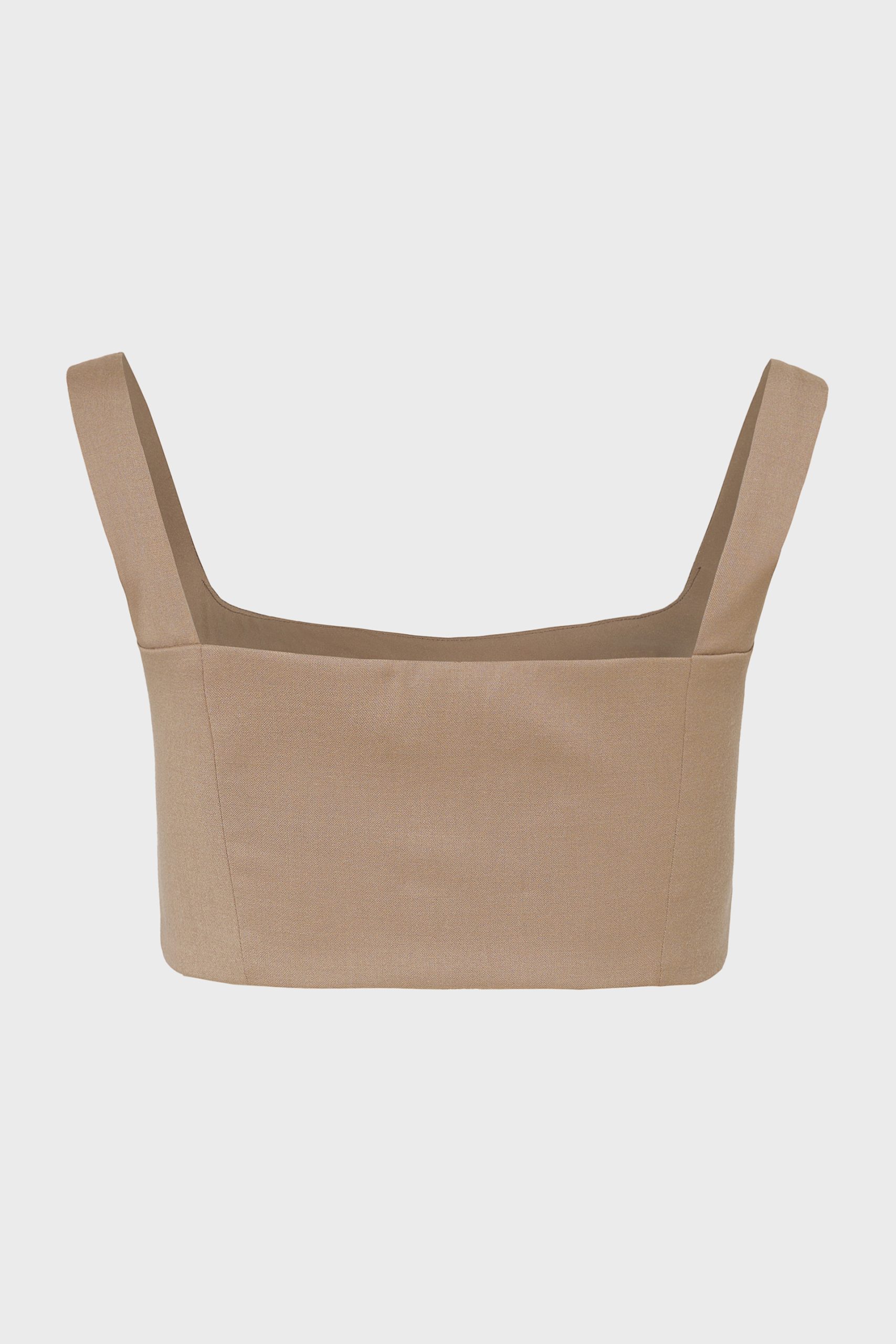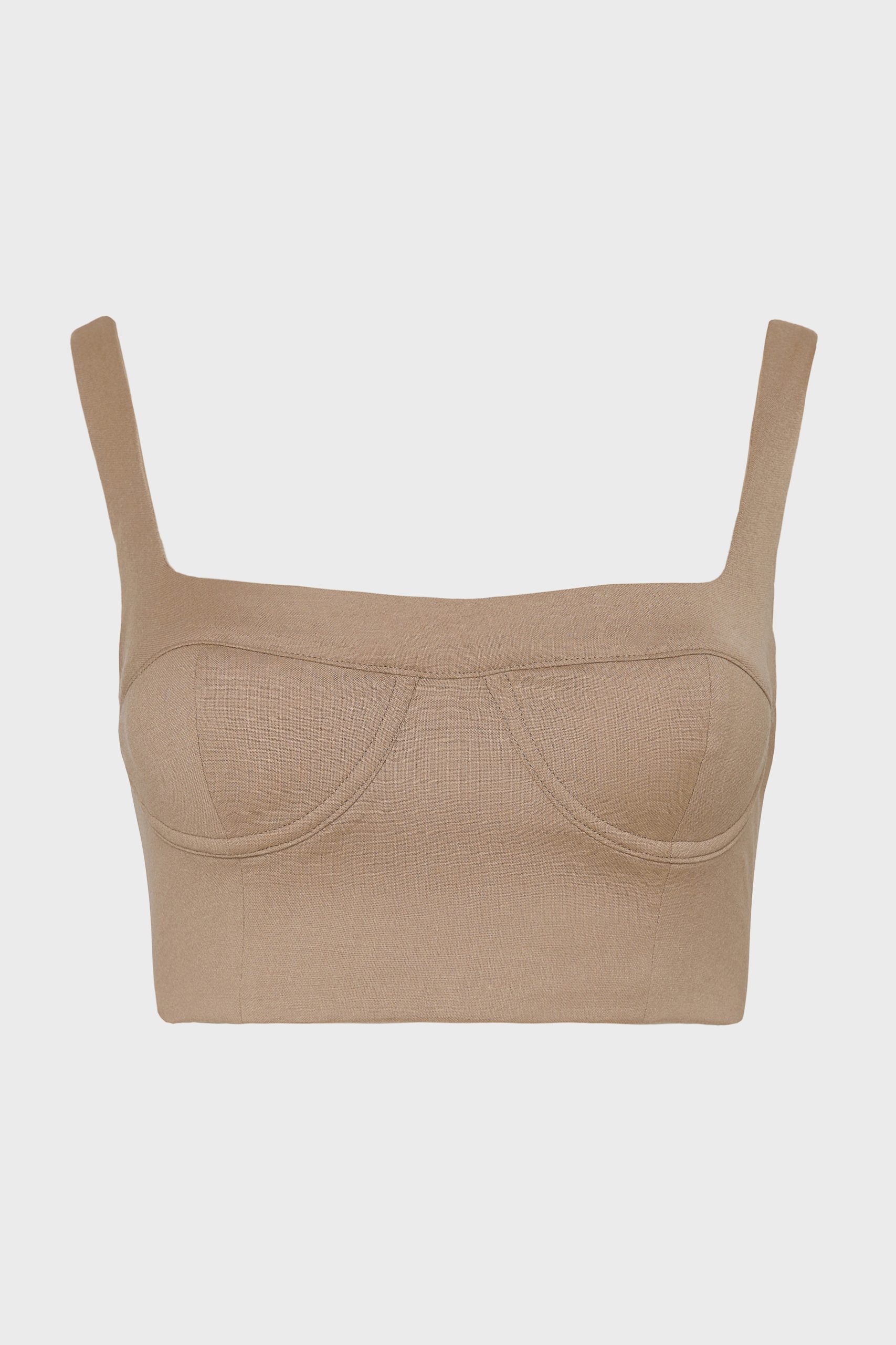 A sculpted top with a restrained, architectural presence. Defined by a squared neckline and structured straps, the silhouette frames the body with precision rather than decoration. Crafted from a wool-blend fabric with subtle elasticity, it offers support and softness in equal measure. The cut sits close to the body, holding its form while allowing natural movement. Designed to be worn alone or layered ,equally considered either way. A modern essential, reduced to what is necessary.