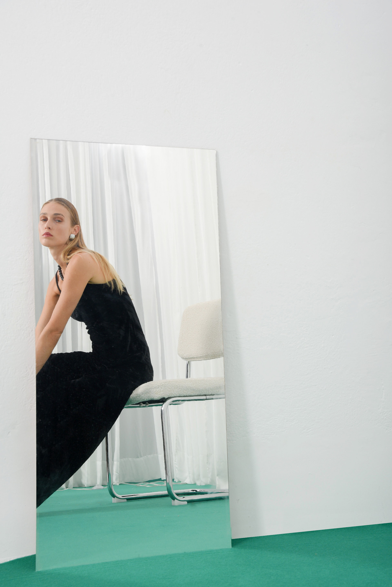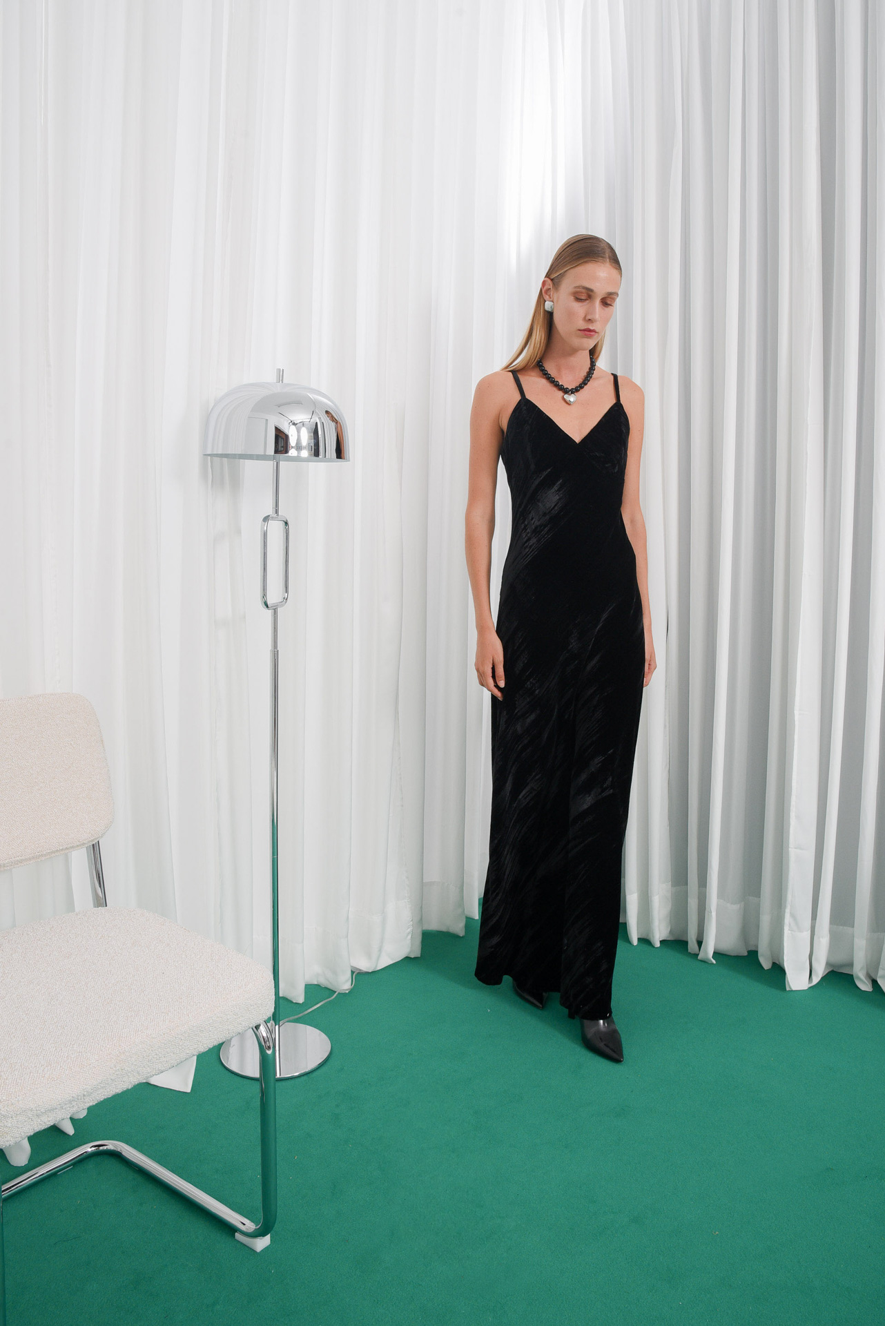 Fearless Maxi Dress, a long dress made from soft fabric with velvet finish, rich texture and natural shine. It features a flattering V-neckline, thin adjustable straps, and a bias-cut design that follows the body’s shape. The floor-length silhouette flows smoothly, creating an elegant and timeless look.