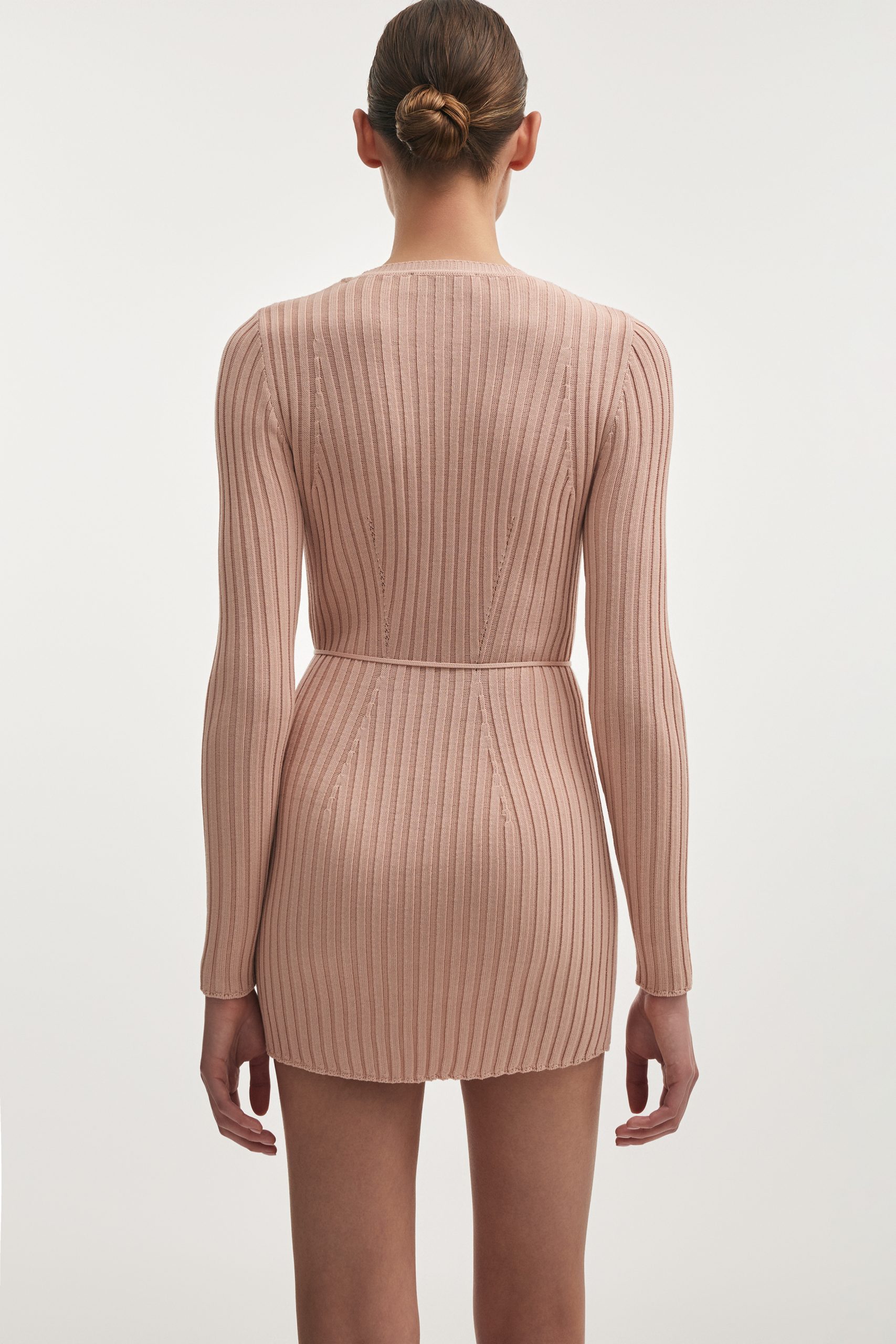 A refined ribbed knit mini dress designed to contour the body with ease. Crafted from a soft viscose blend, the silhouette is close-fitting, offering a balance of structure and stretch. The minimal design is defined by its clean neckline and long sleeves, allowing the texture of the rib knit to shape the form. Subtle yet precise, the piece embodies a quiet, modern femininity.
