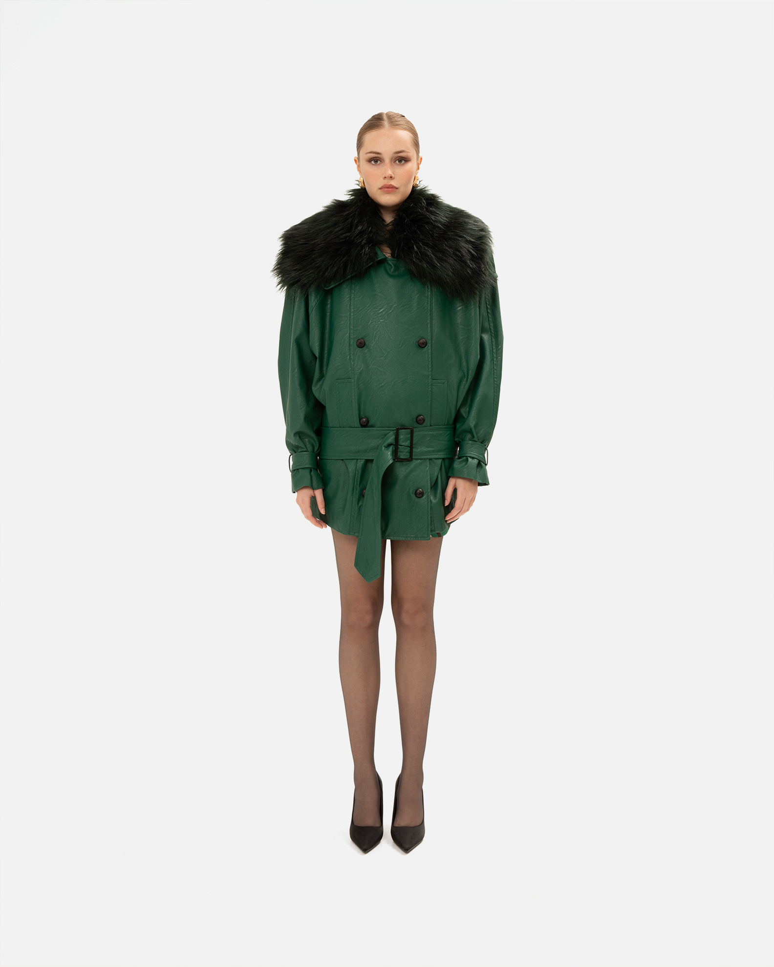 A jacket in dark evergreen tones evoking cozy winter evenings.