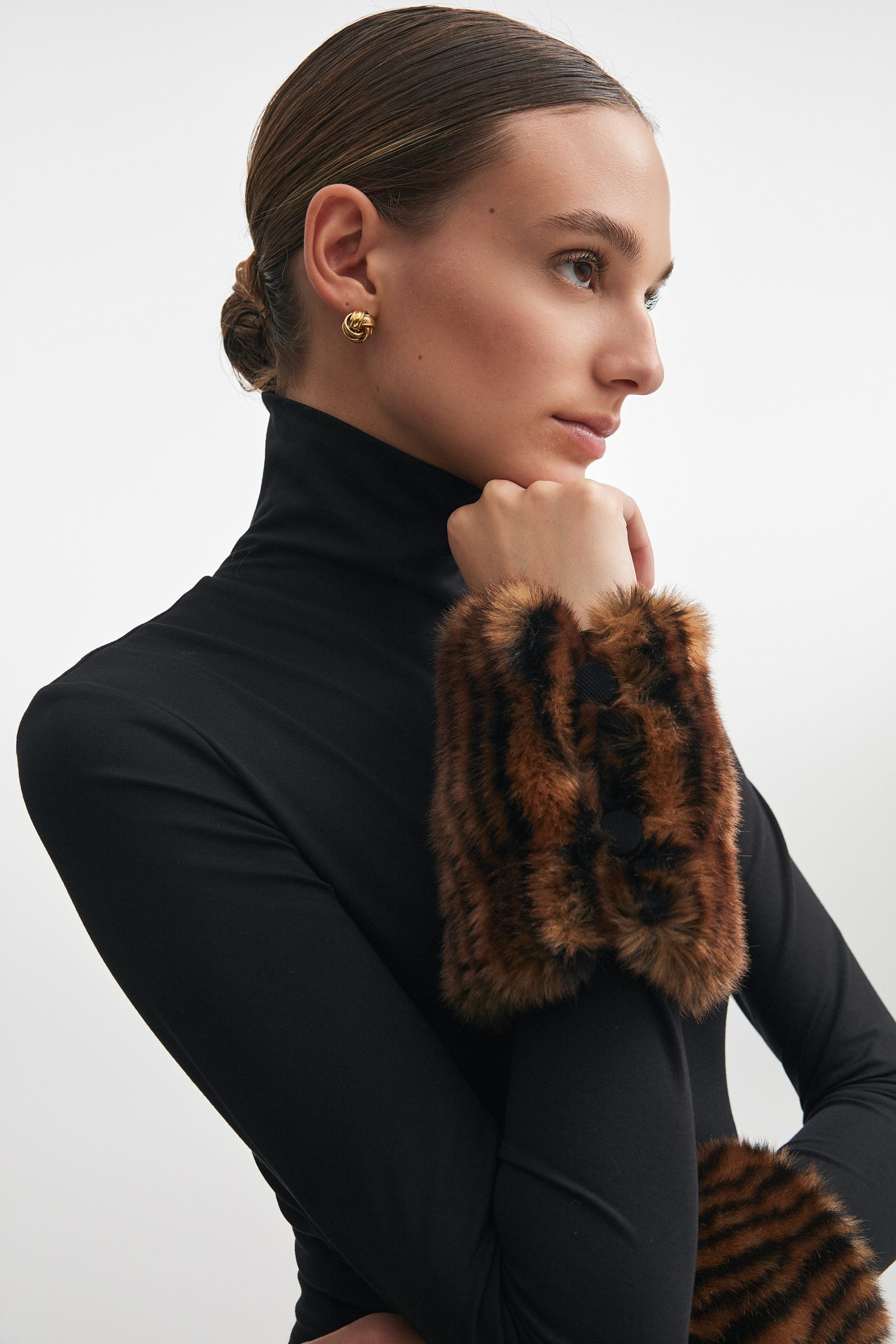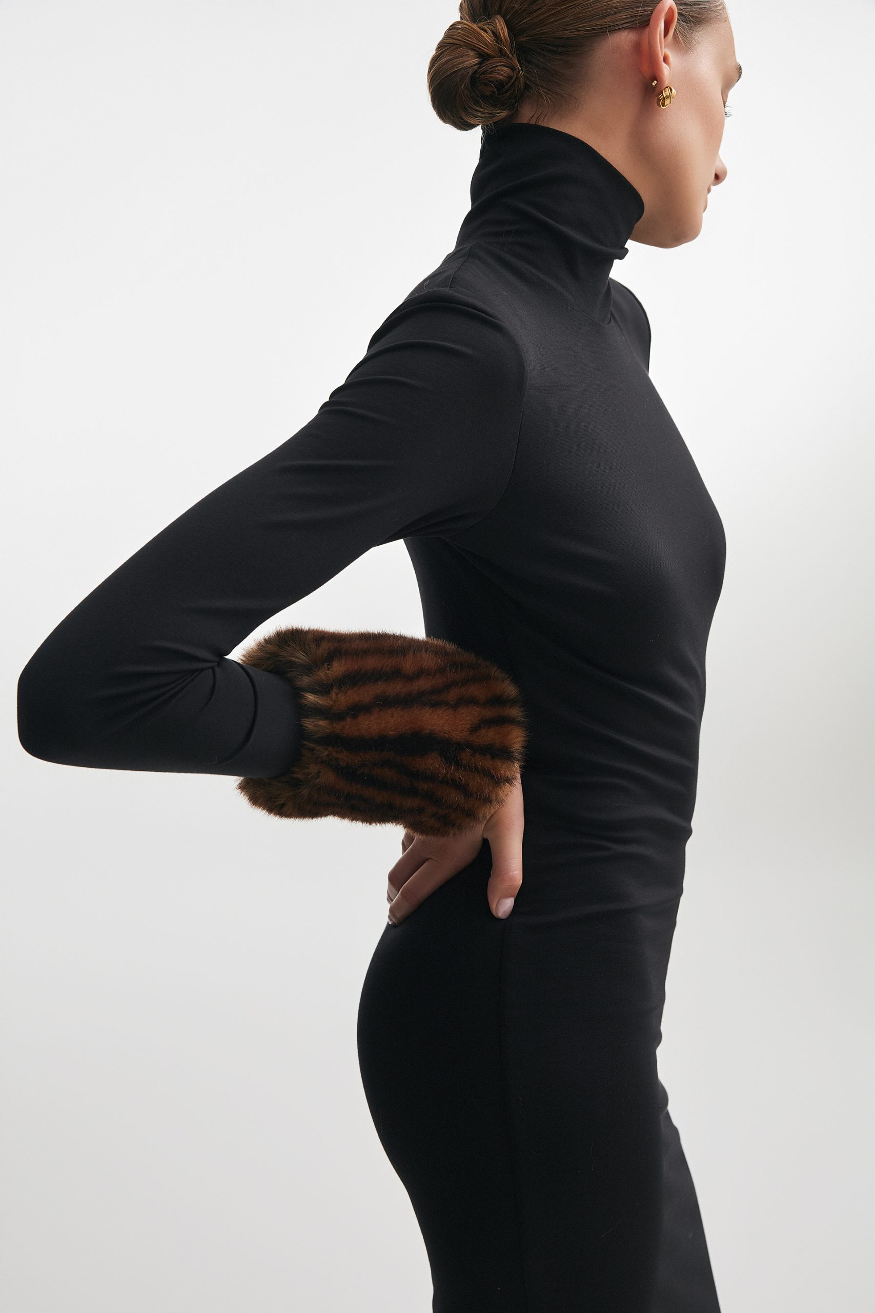 A long, streamlined silhouette. Soft jersey that moves with the body.Faux fur cuffs introducing texture and contrast.A quiet statement for evening and beyond.