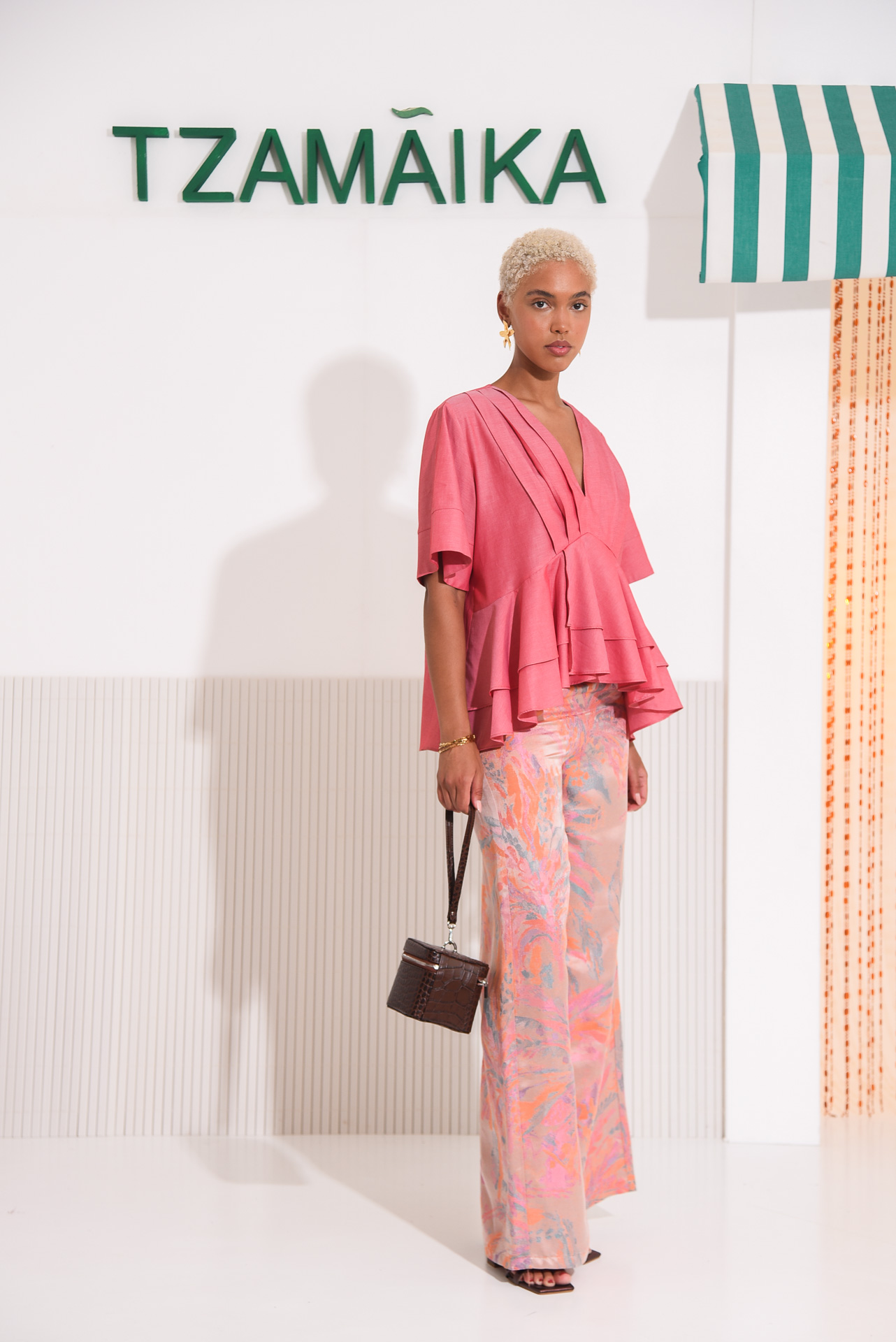 Elevate your wardrobe with the Fruit Punch Pants, featuring a jacquard print in shimmering pink hue. Designed with a high waist, structured fit, and wide-leg silhouette, they offer both elegance and comfort. The hidden side zipper ensures a seamless finish, while subtle front pockets add practicality.