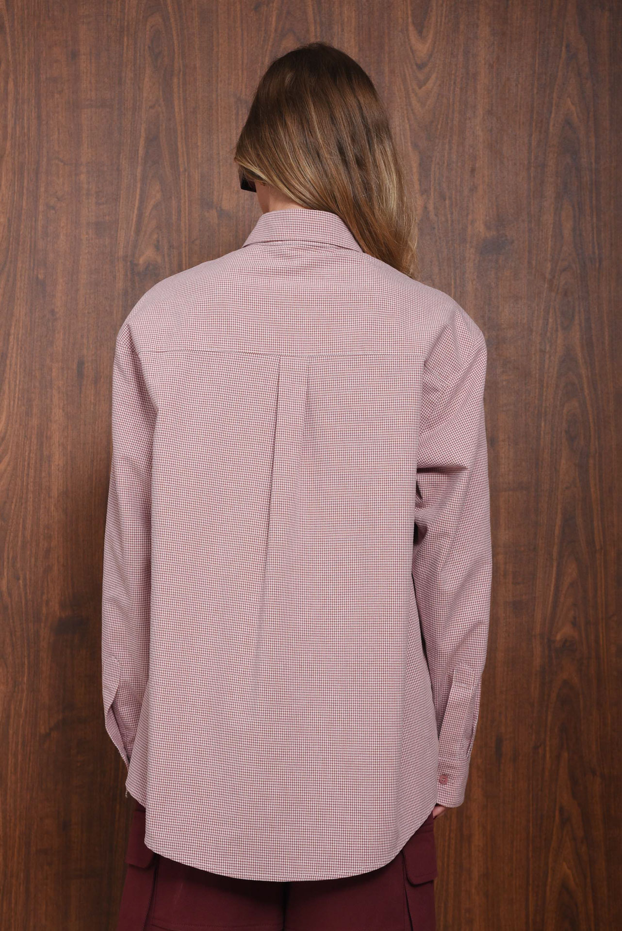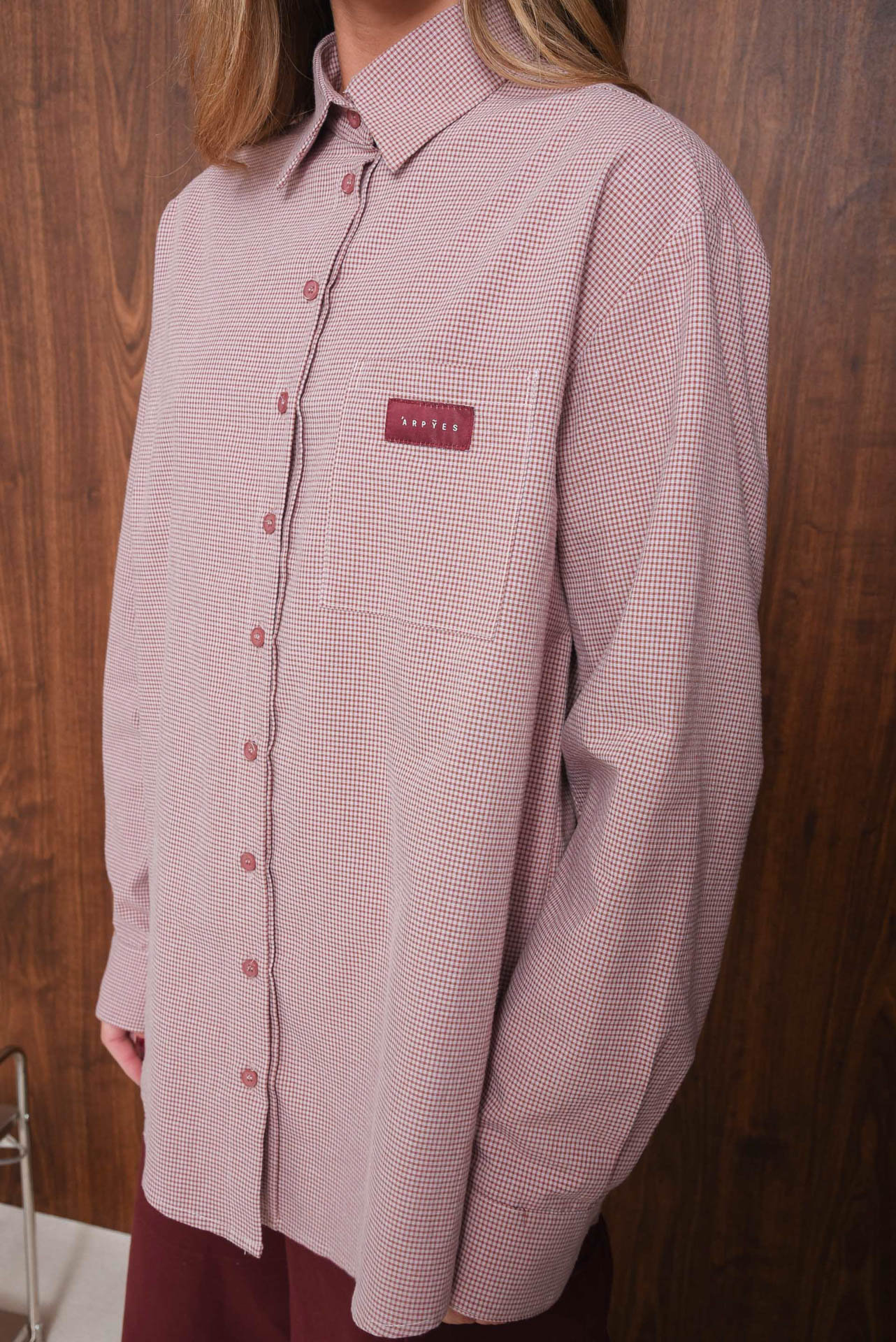 Grace shirt, an oversized cotton shirt in a dusty pink micro-check pattern. Designed with a pointed collar, tonal buttons, and a chest pocket featuring a burgundy “ARPYES” logo patch. A relaxed silhouette with a back pleat for comfort and movement.