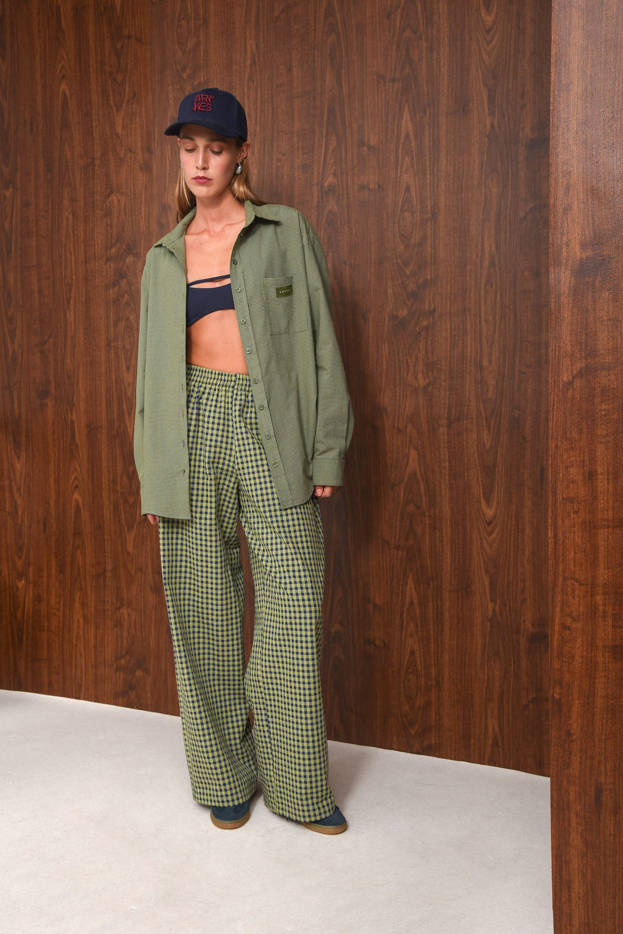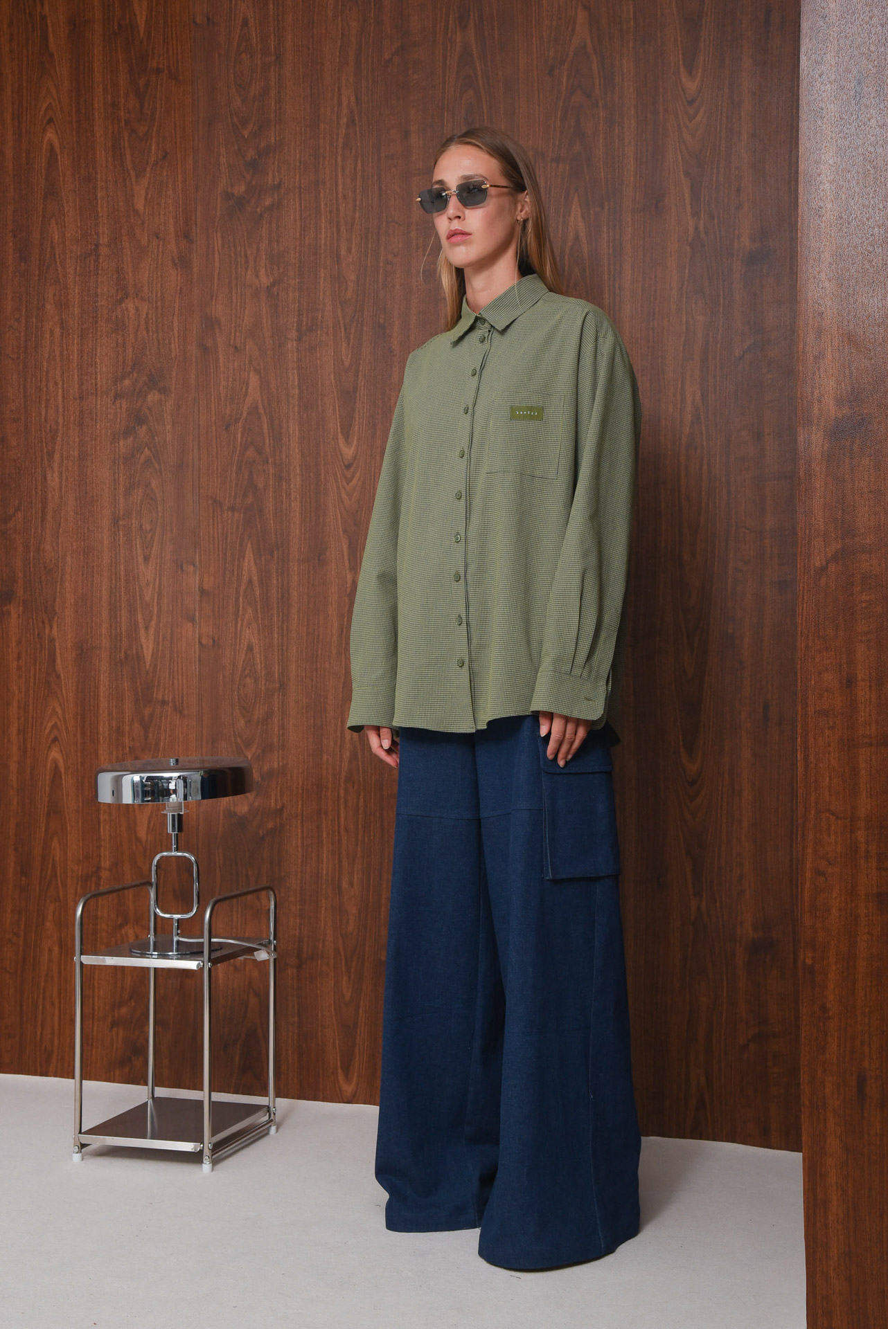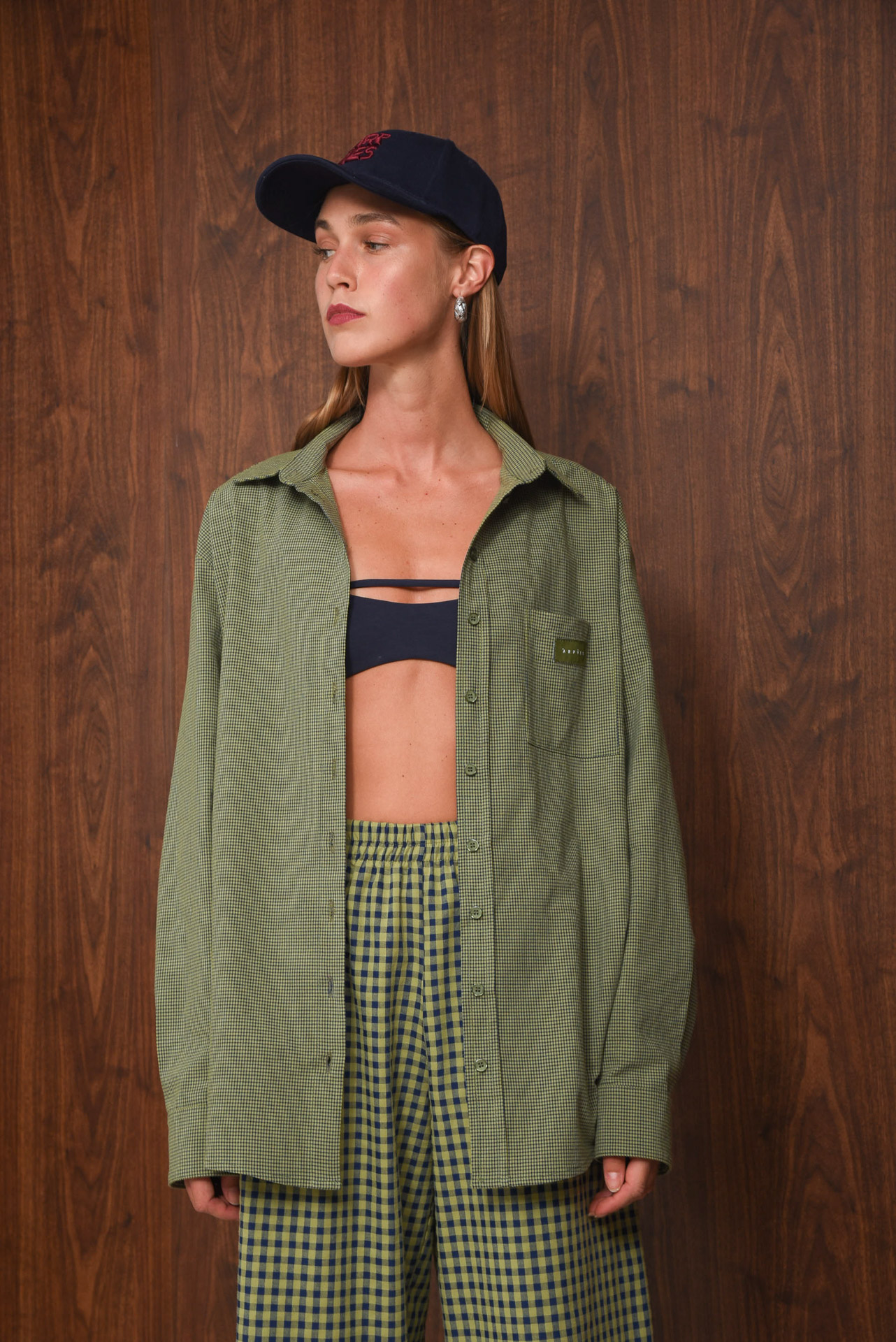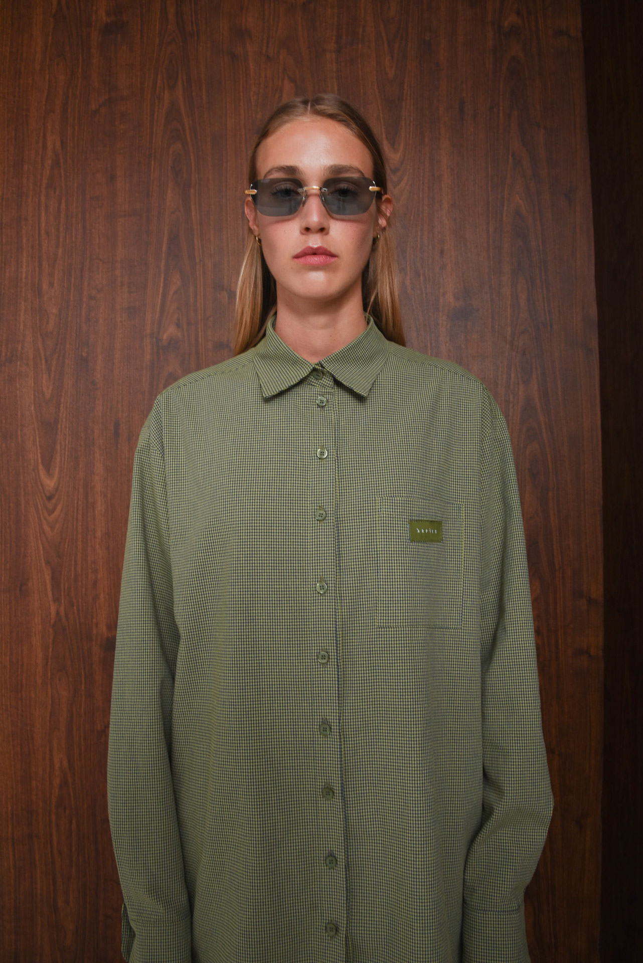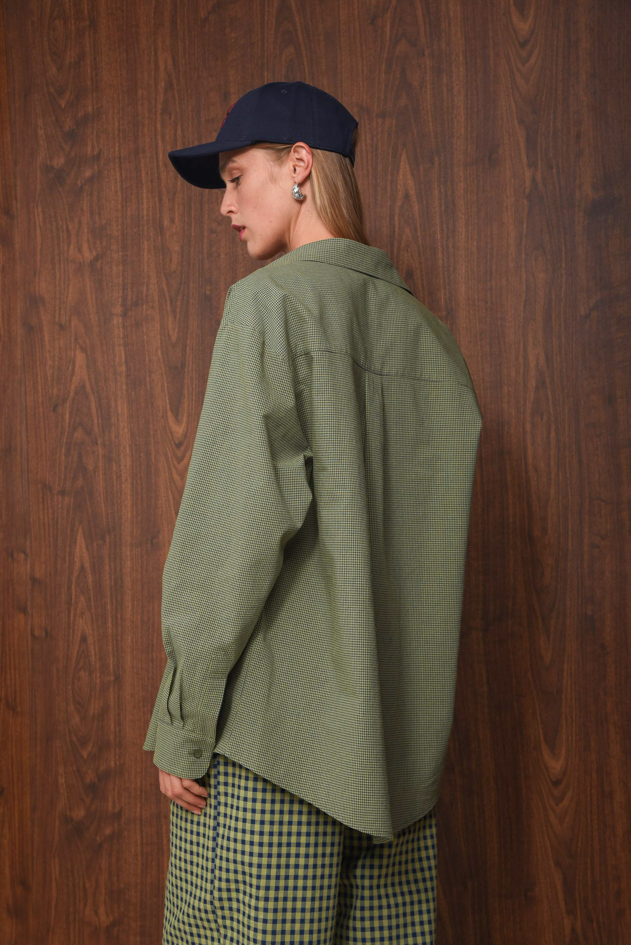 Grace shirt, an oversized cotton shirt in an olive green micro-check pattern. Designed with a pointed collar, tonal buttons, and a chest pocket featuring a tonal green “ARPYES” logo patch. A relaxed silhouette with a back pleat for comfort and movement.