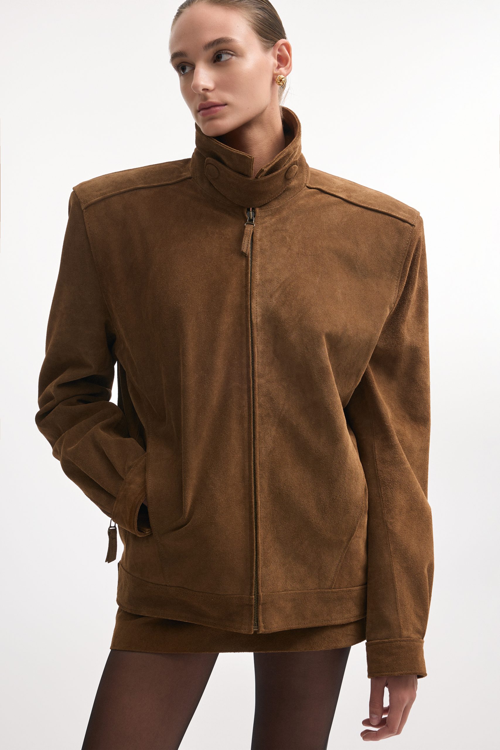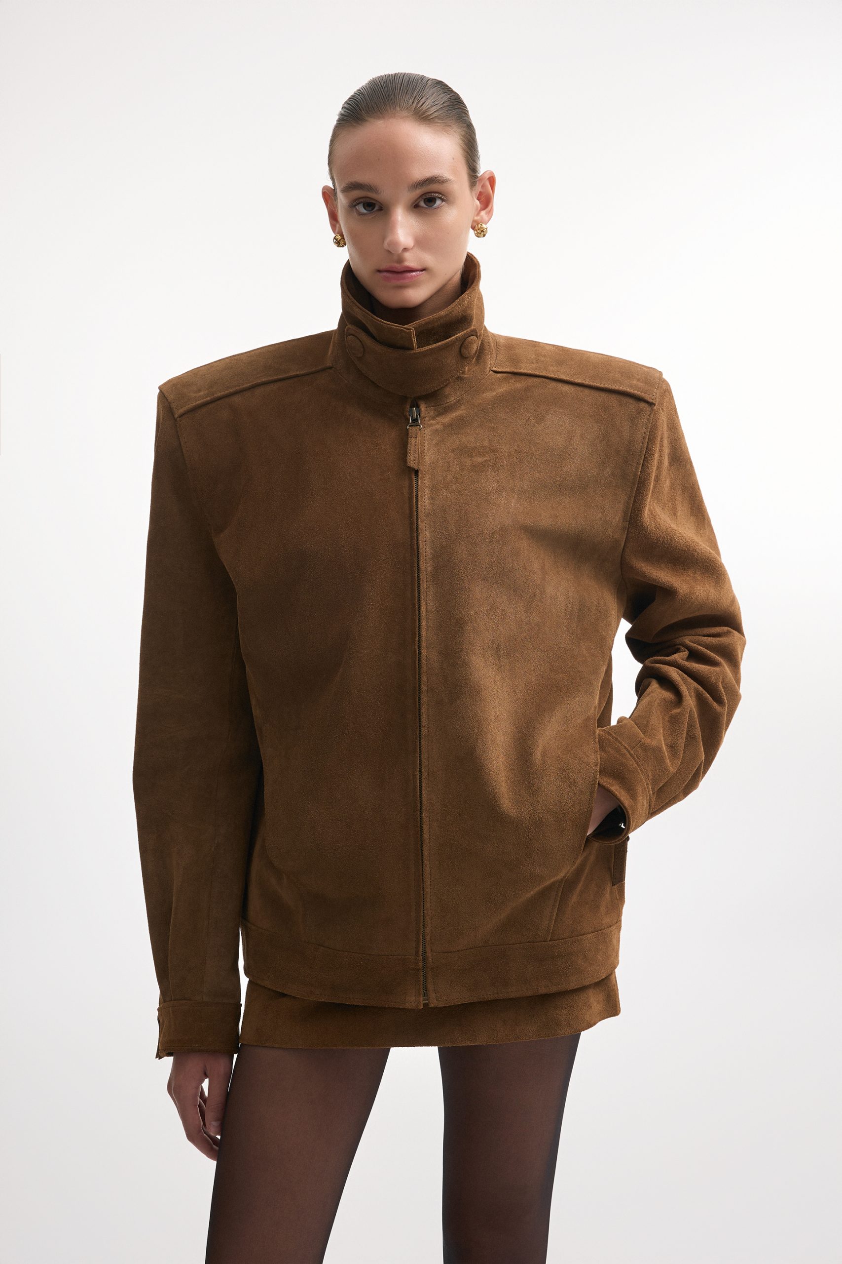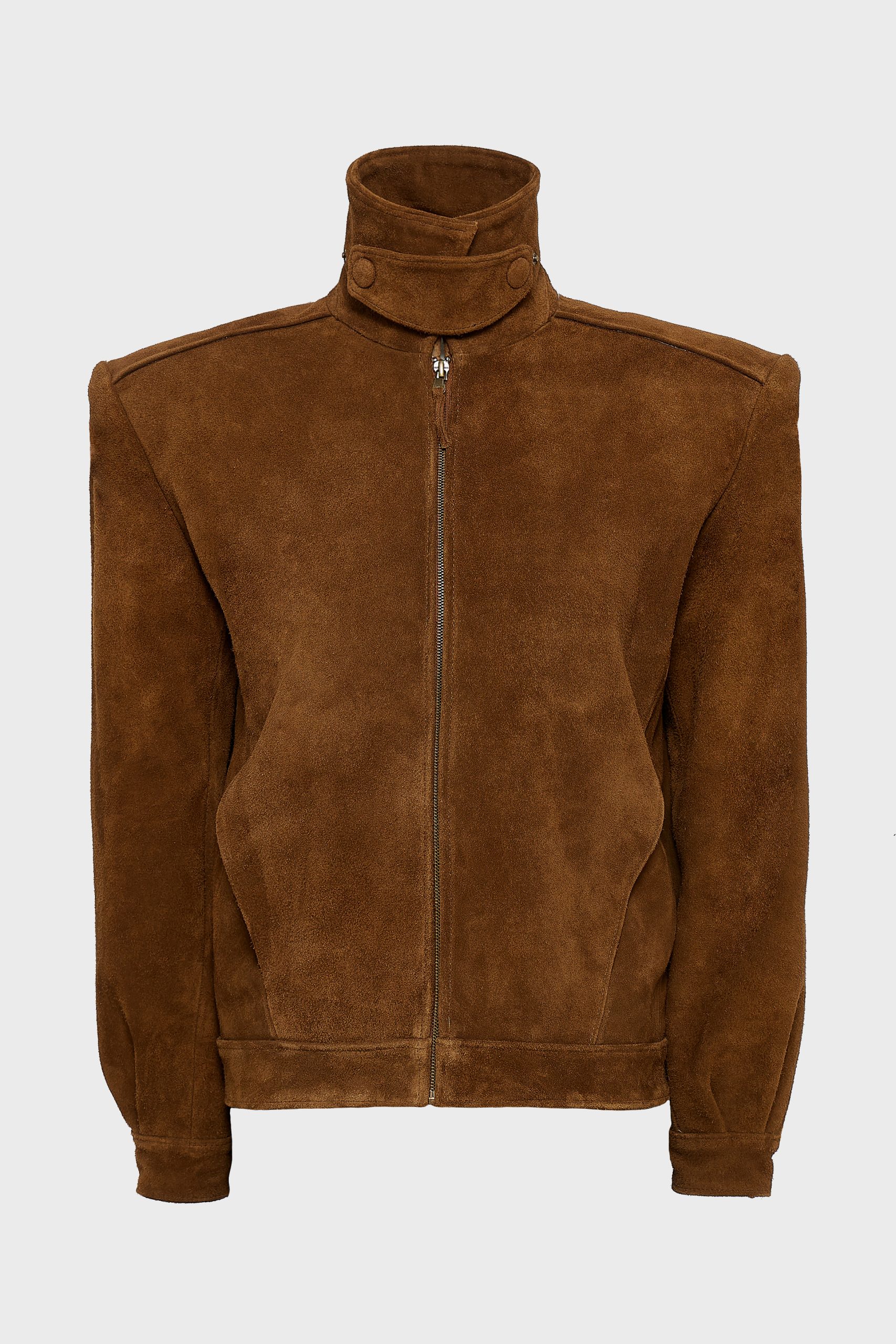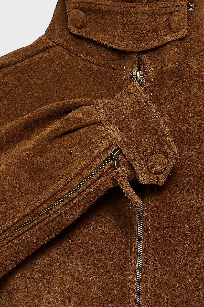 The Guardian jacket is crafted from premium suede leather with a high collar, structured shoulders, and a zip-up front. Snap buttons at the collar, cuffs, and hem allow for a customizable fit, while the tailored cut keeps the silhouette sharp. A versatile piece that works equally well for daytime outings or evening looks.