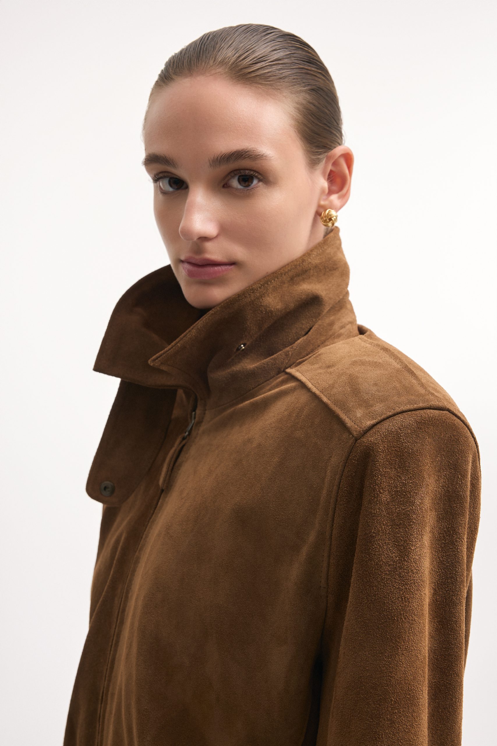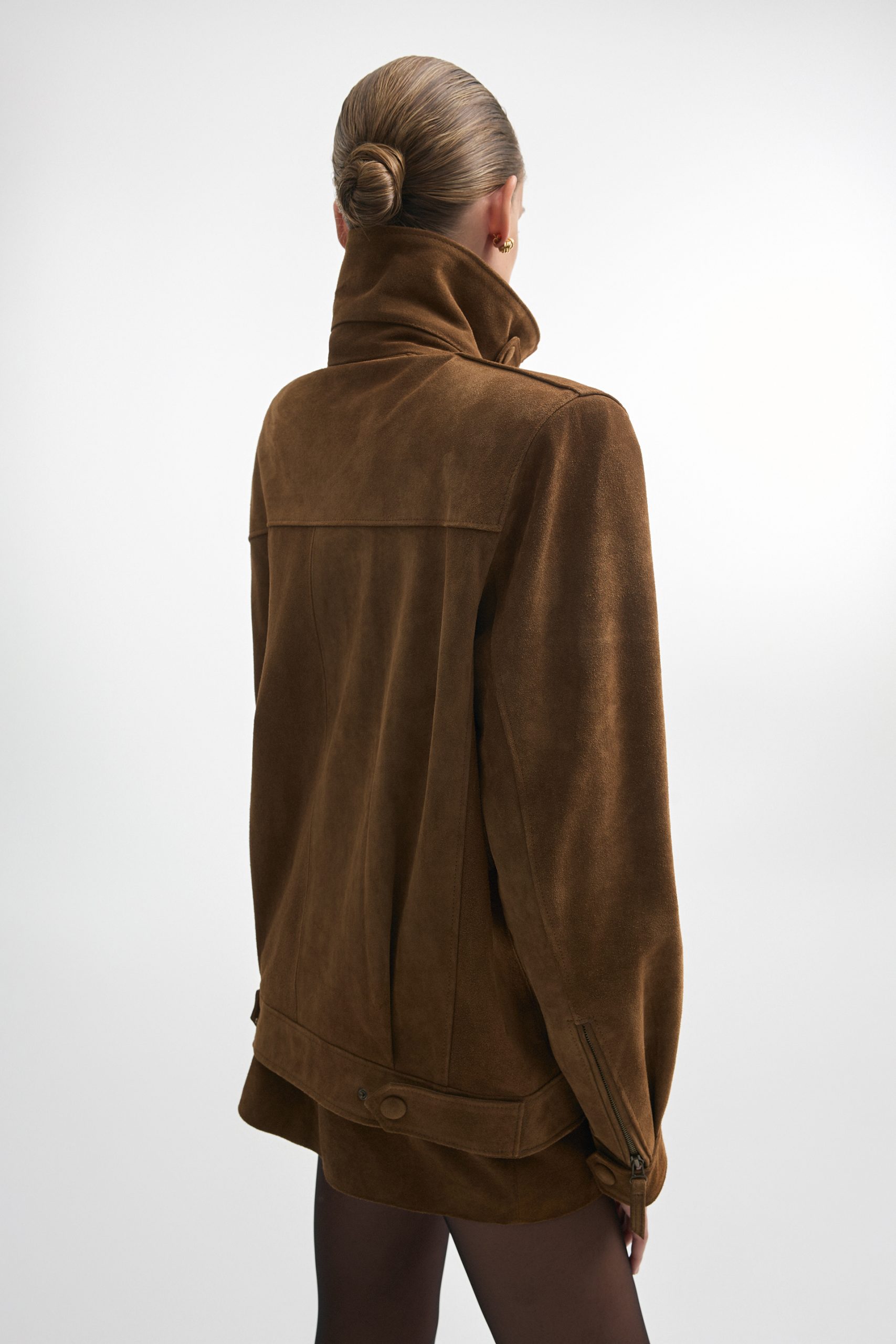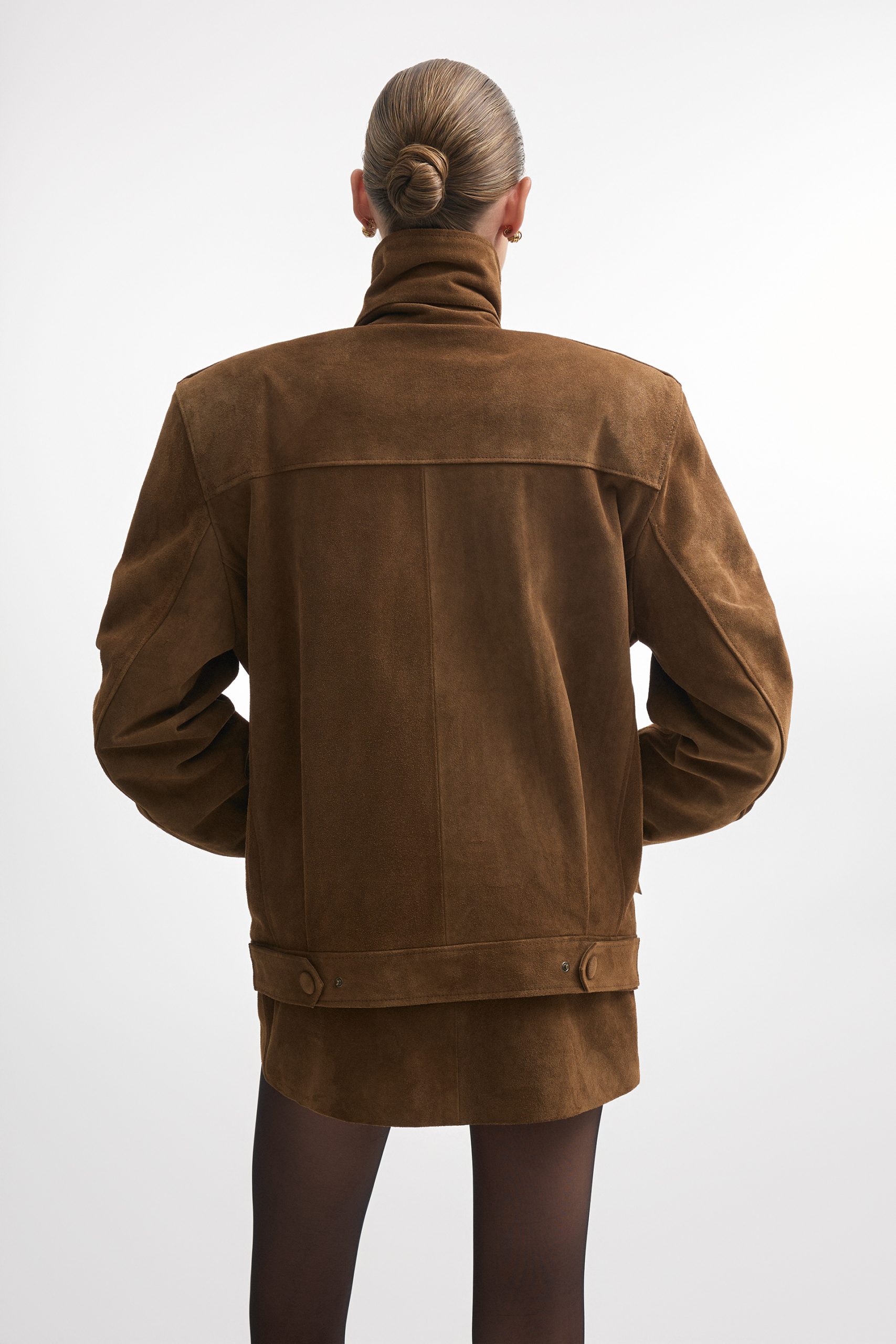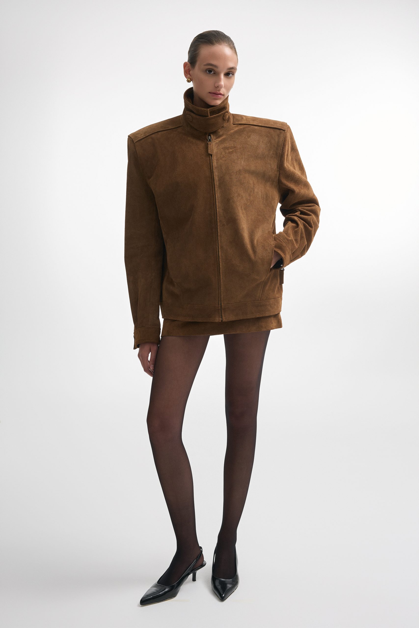 The Guardian jacket is crafted from premium suede leather with a high collar, structured shoulders, and a zip-up front. Snap buttons at the collar, cuffs, and hem allow for a customizable fit, while the tailored cut keeps the silhouette sharp. A versatile piece that works equally well for daytime outings or evening looks.