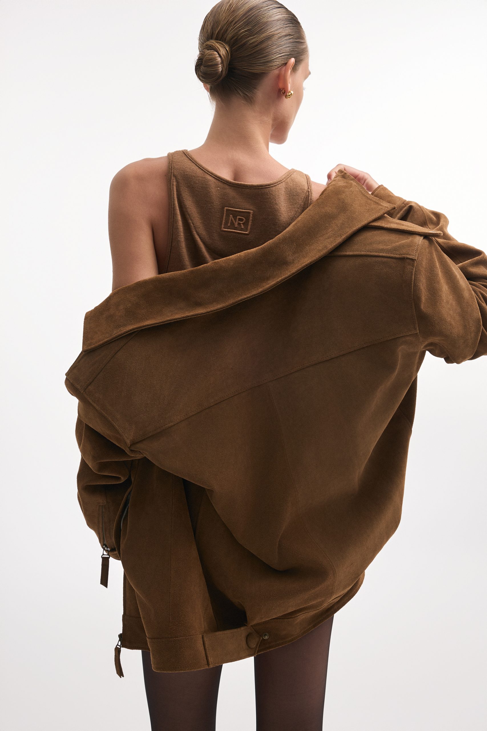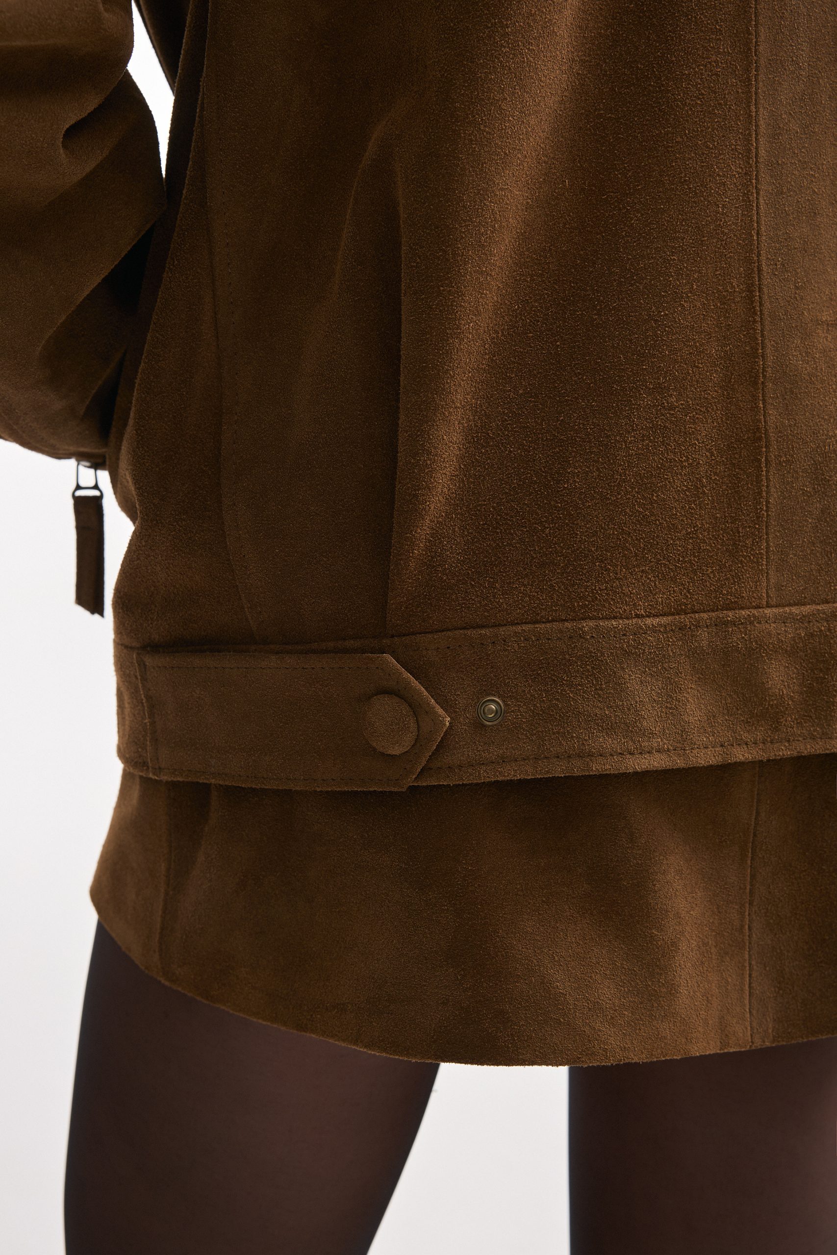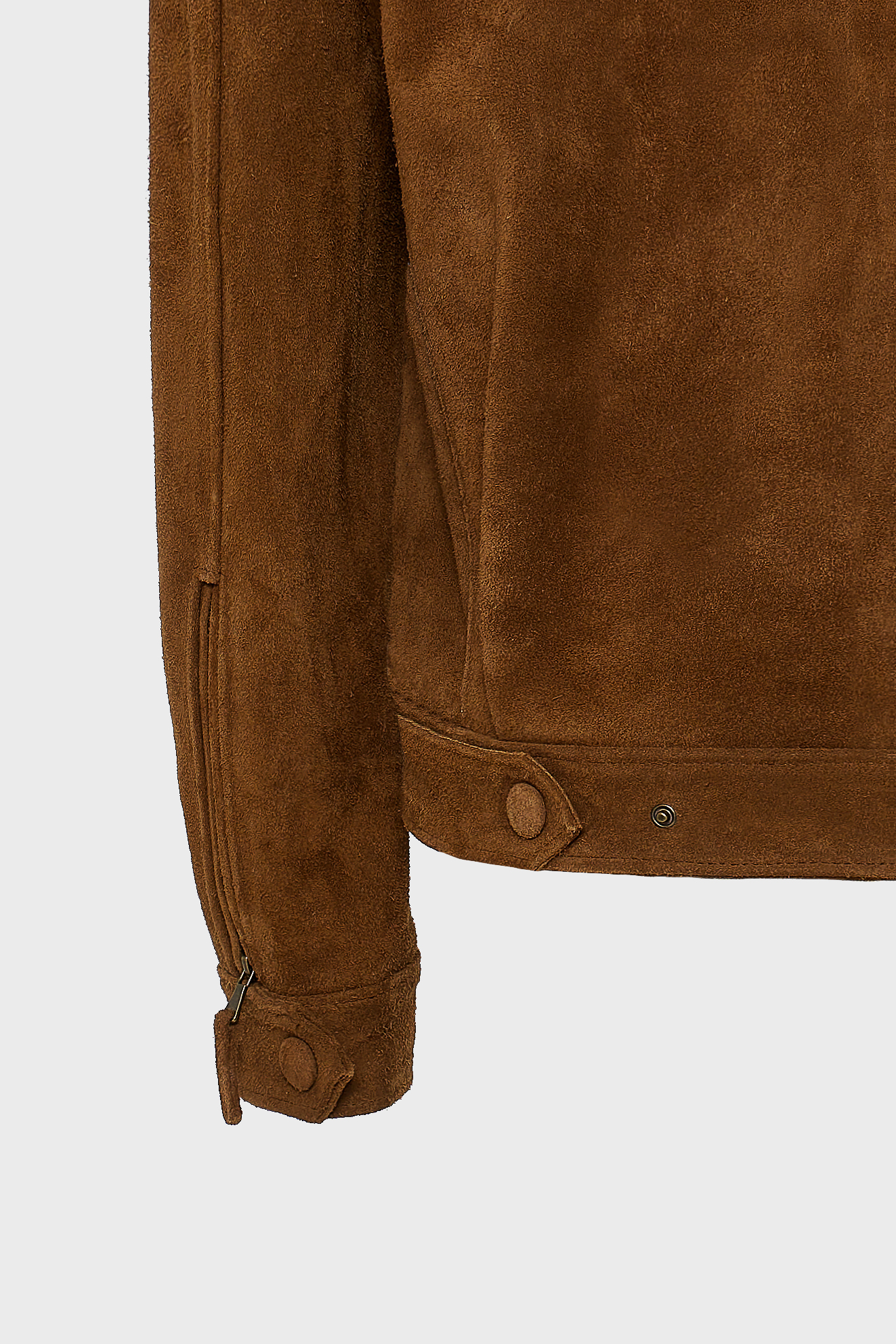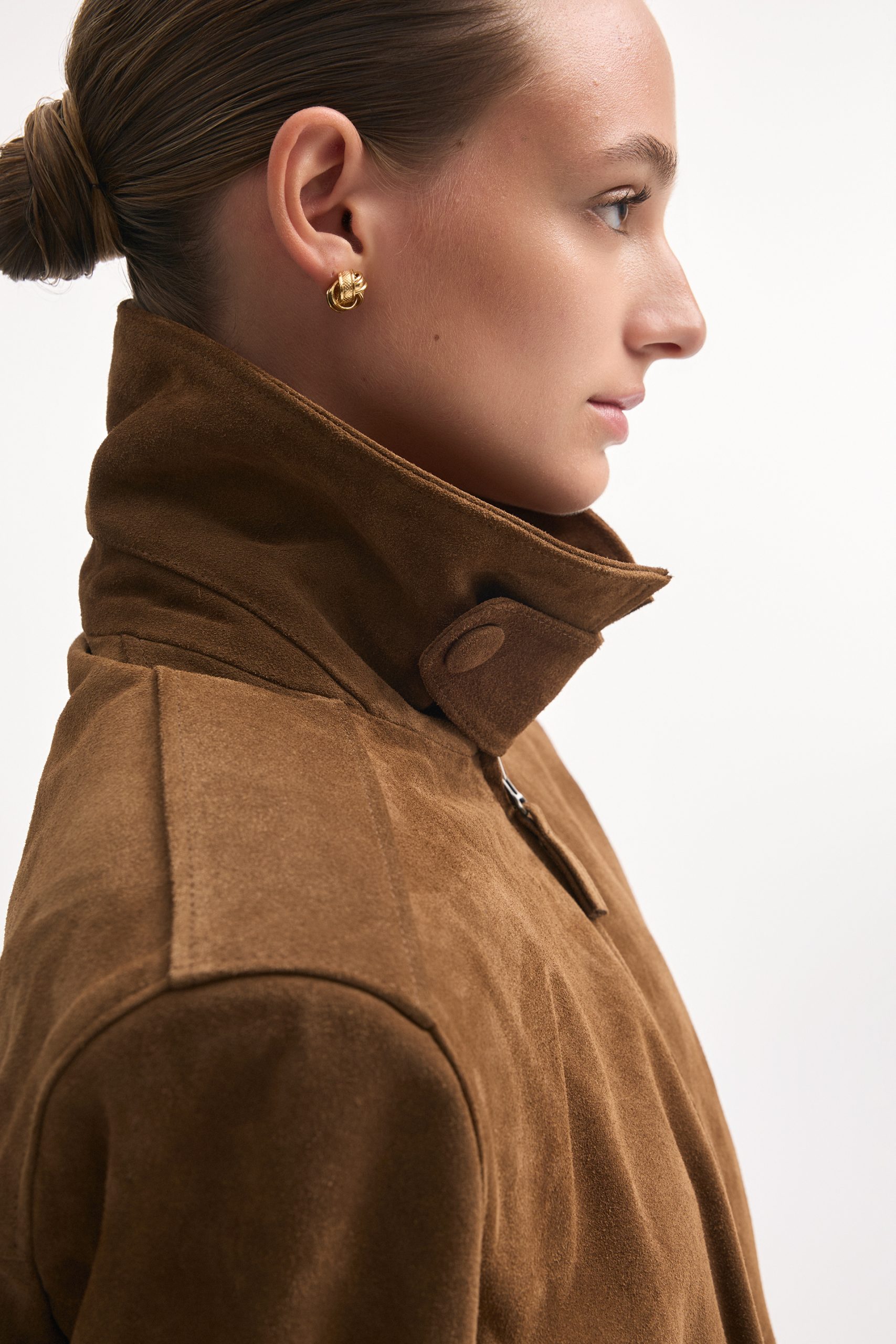 The Guardian jacket is crafted from premium suede leather with a high collar, structured shoulders, and a zip-up front. Snap buttons at the collar, cuffs, and hem allow for a customizable fit, while the tailored cut keeps the silhouette sharp. A versatile piece that works equally well for daytime outings or evening looks.