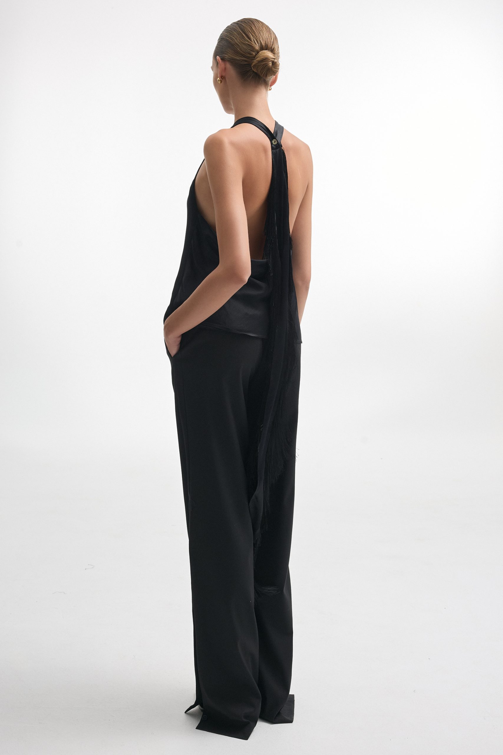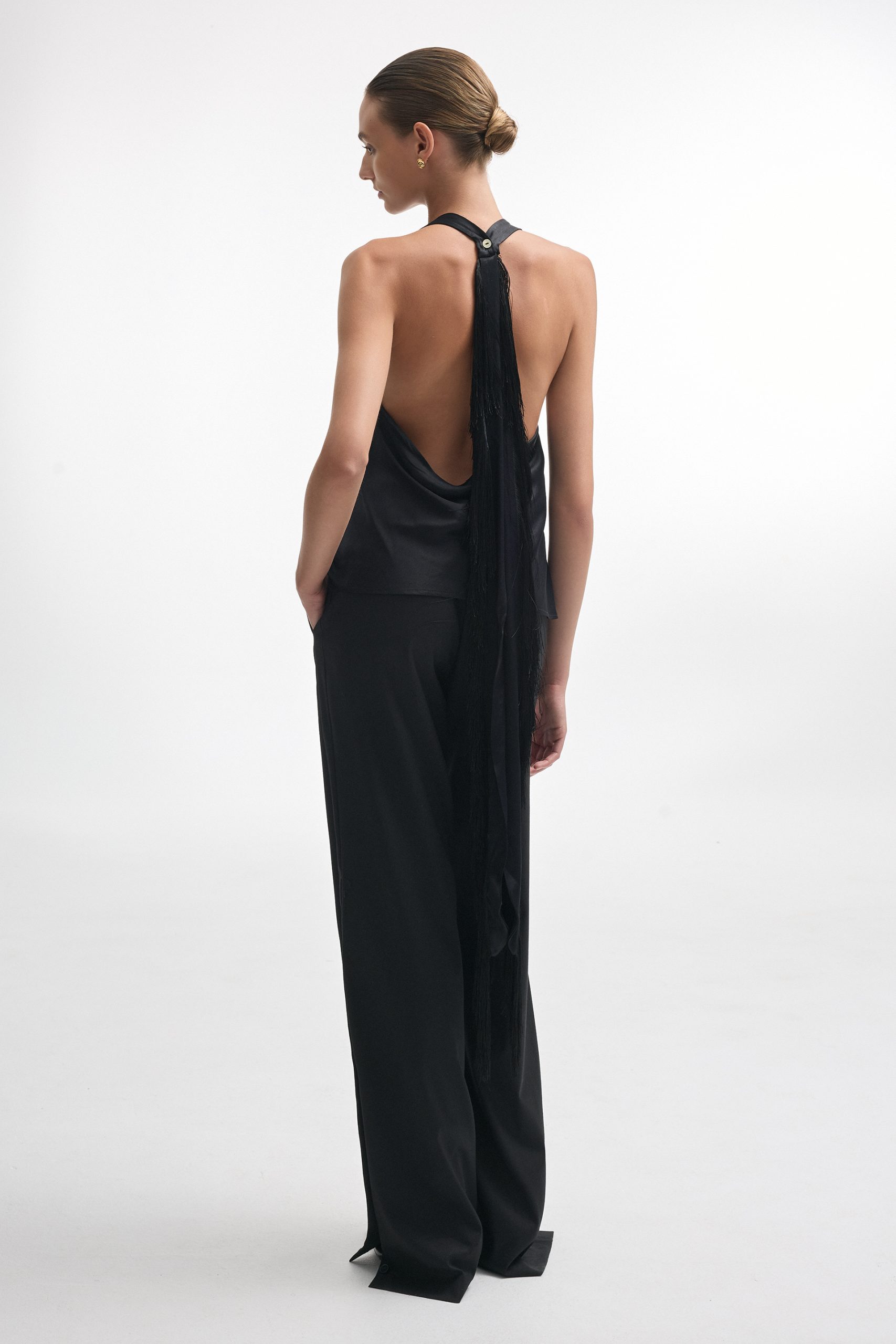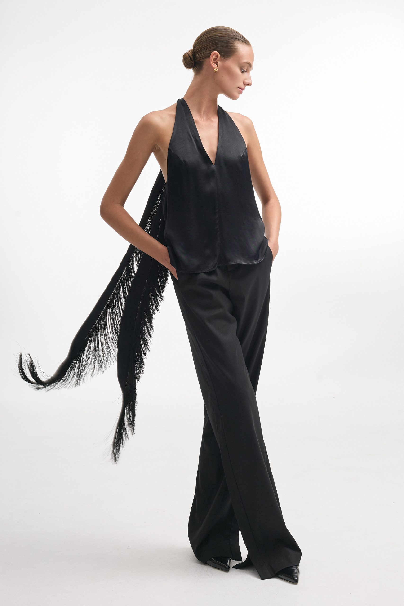 Satin halter top with an open back and statement fringe details. A sleek and modern piece that adds movement and elegance to your look, perfect for evening outings or special occasions.
