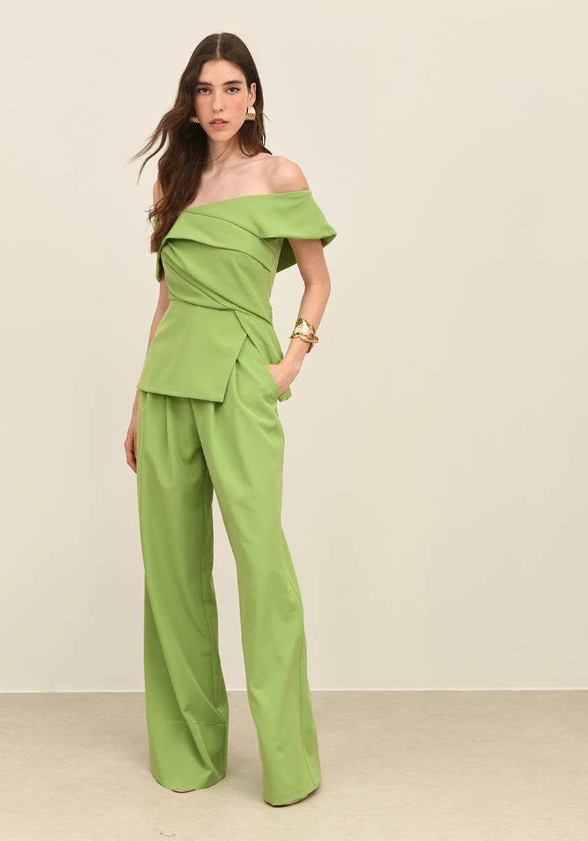 - Wide-leg trousers in crepe fabric with front pleats and side pockets. You can combine it with the Palmer top.