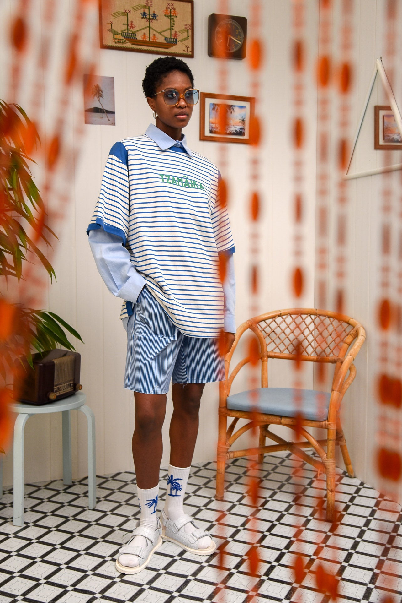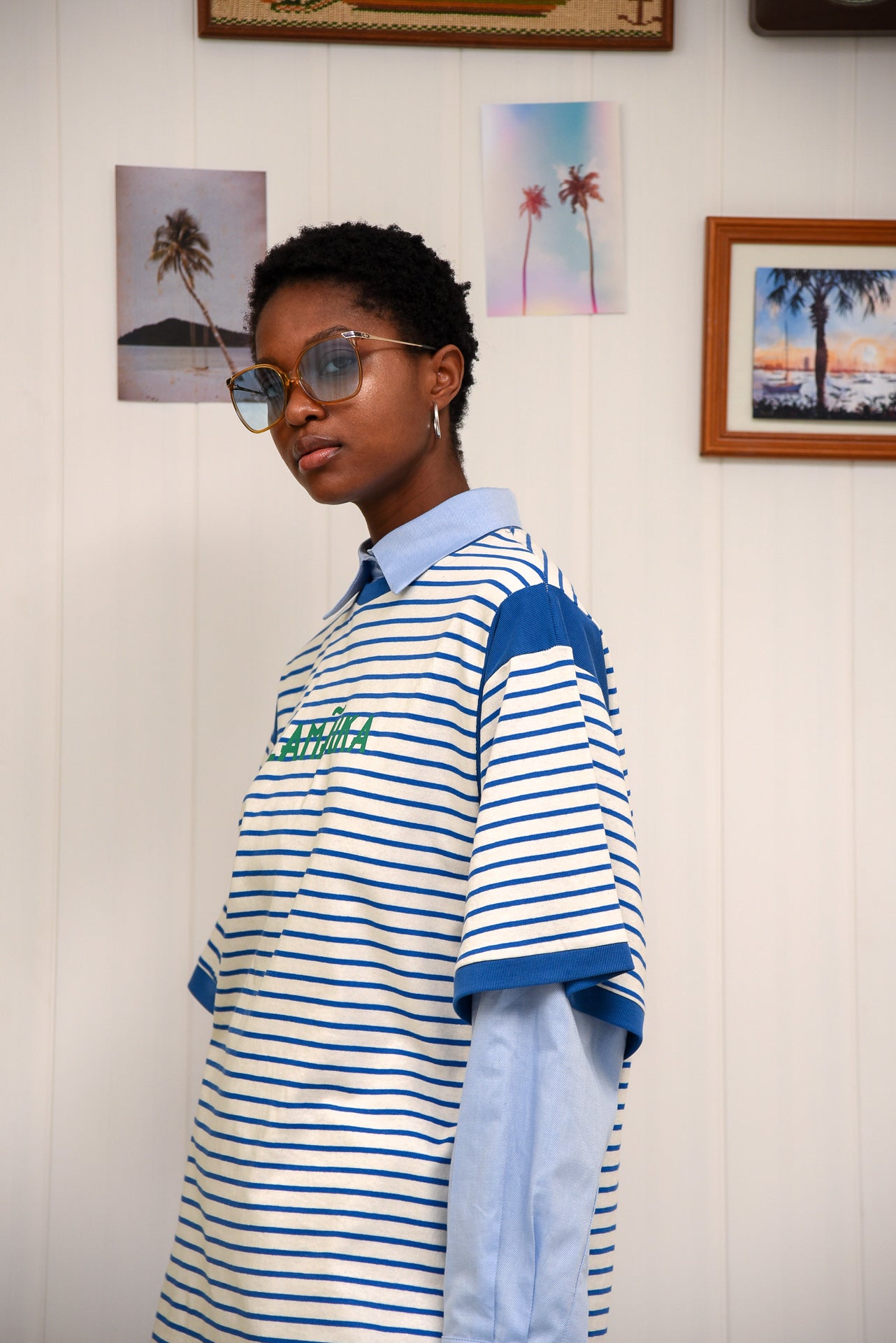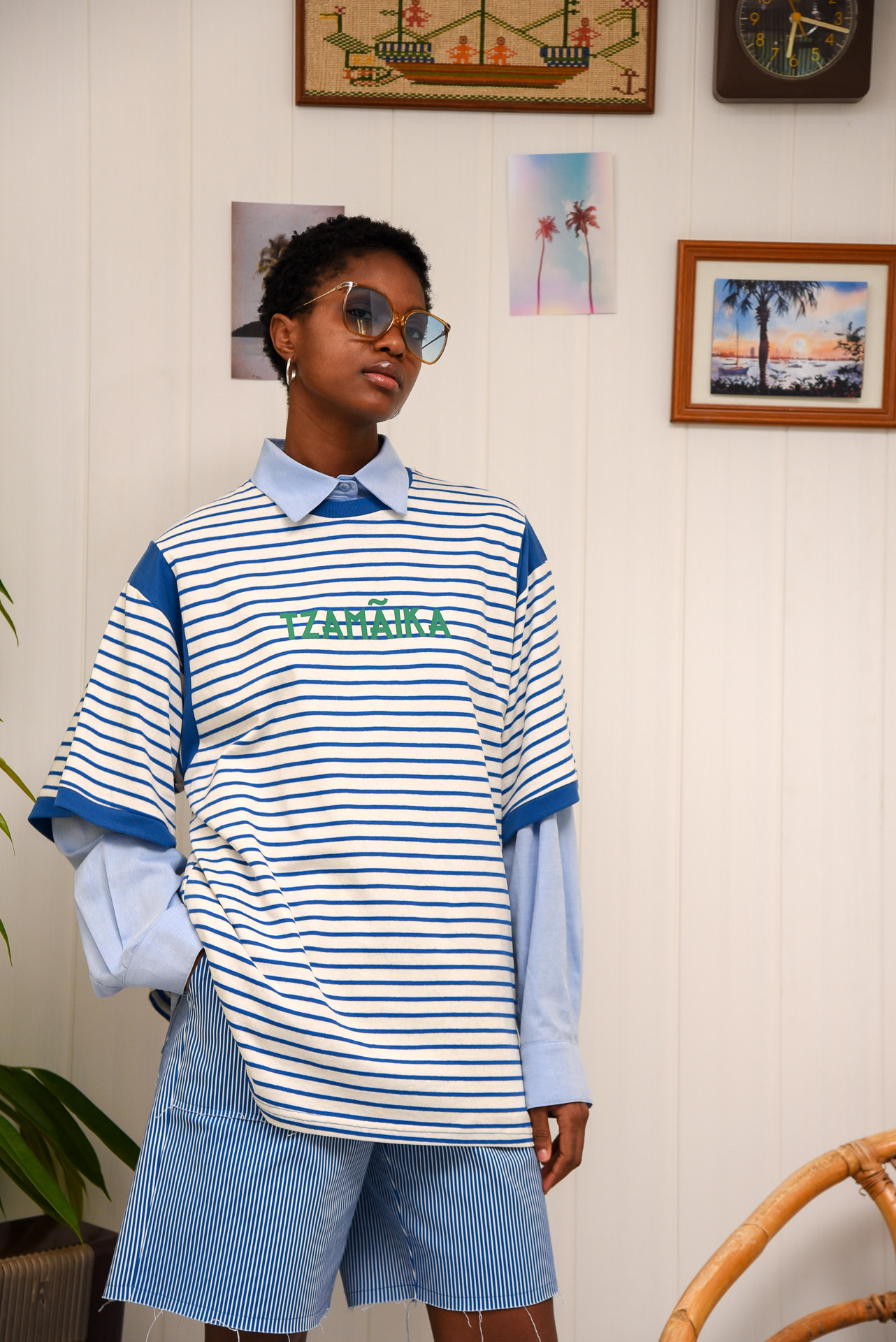 The JAMAICA t-shirt blends comfort and detail. Made from soft cotton, it features blue and off-white horizontal stripes, dark blue ribbed collar and cuffs, and contrast shoulder panels. Side slits add movement, while the bold green TZAMÃIKA logo pops at the front. Its oversized fit makes it perfect for laid-back, sunny-day style.