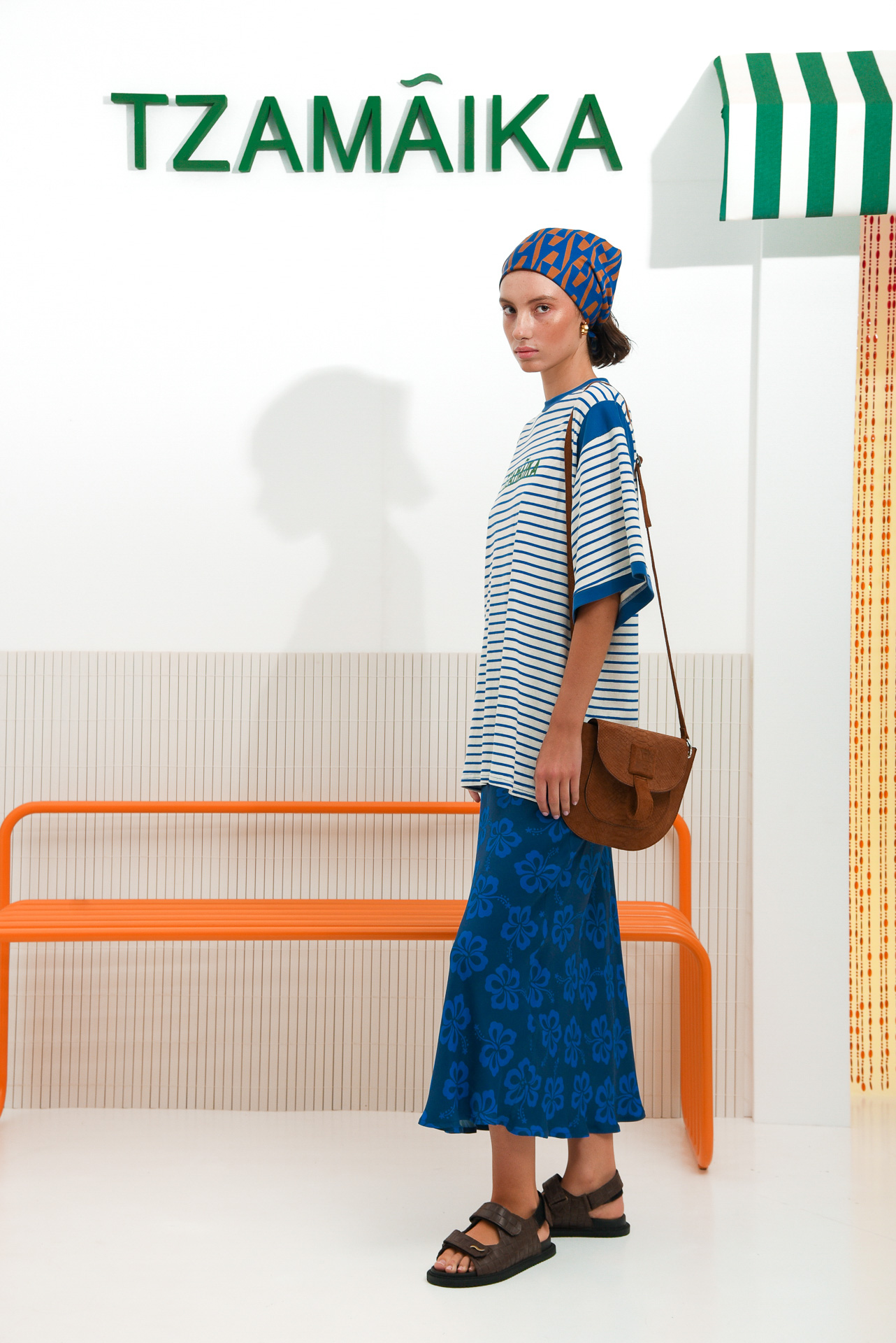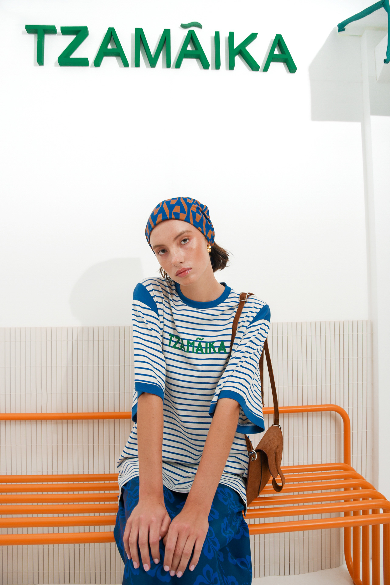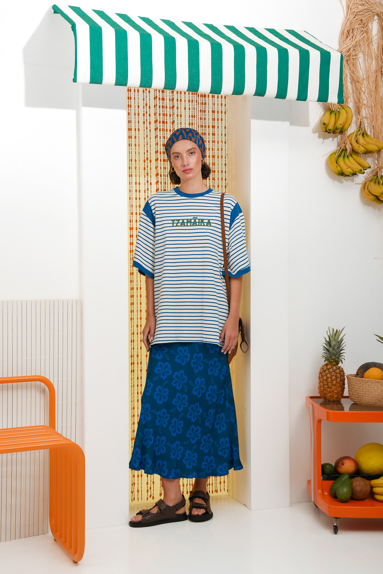 The JAMAICA t-shirt blends comfort and detail. Made from soft cotton, it features blue and off-white horizontal stripes, dark blue ribbed collar and cuffs, and contrast shoulder panels. Side slits add movement, while the bold green TZAMÃIKA logo pops at the front. Its oversized fit makes it perfect for laid-back, sunny-day style.