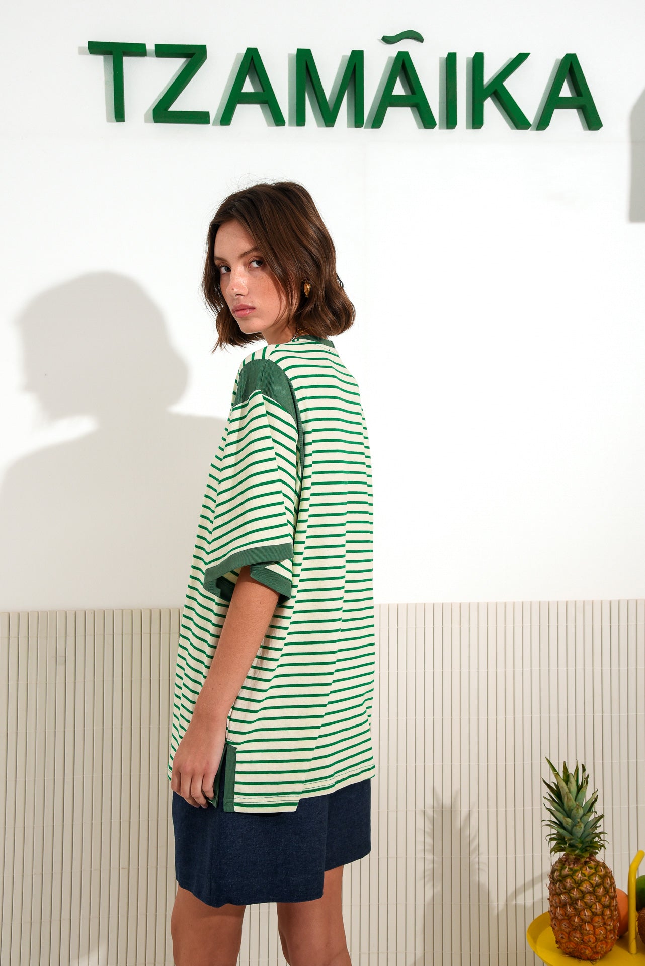 The JAMAICA t-shirt blends comfort and detail. Made from soft cotton, it features blue and off-white horizontal stripes, dark blue ribbed collar and cuffs, and contrast shoulder panels. Side slits add movement, while the bold green TZAMÃIKA logo pops at the front. Its oversized fit makes it perfect for laid-back, sunny-day style.
