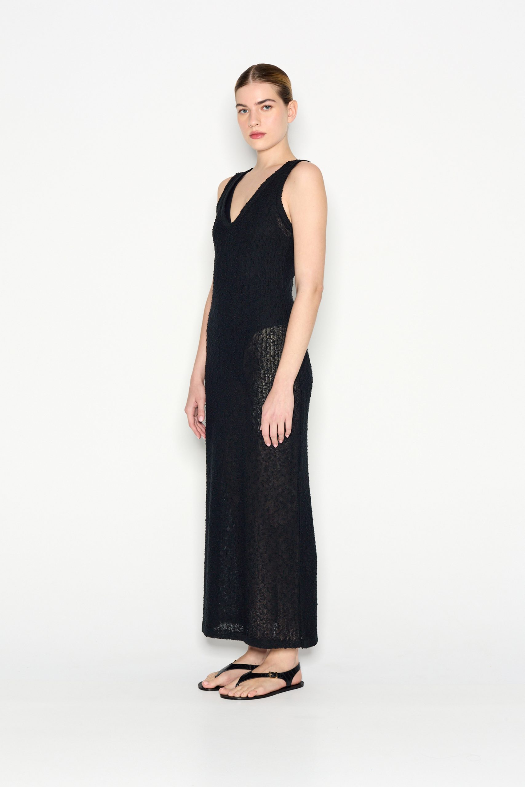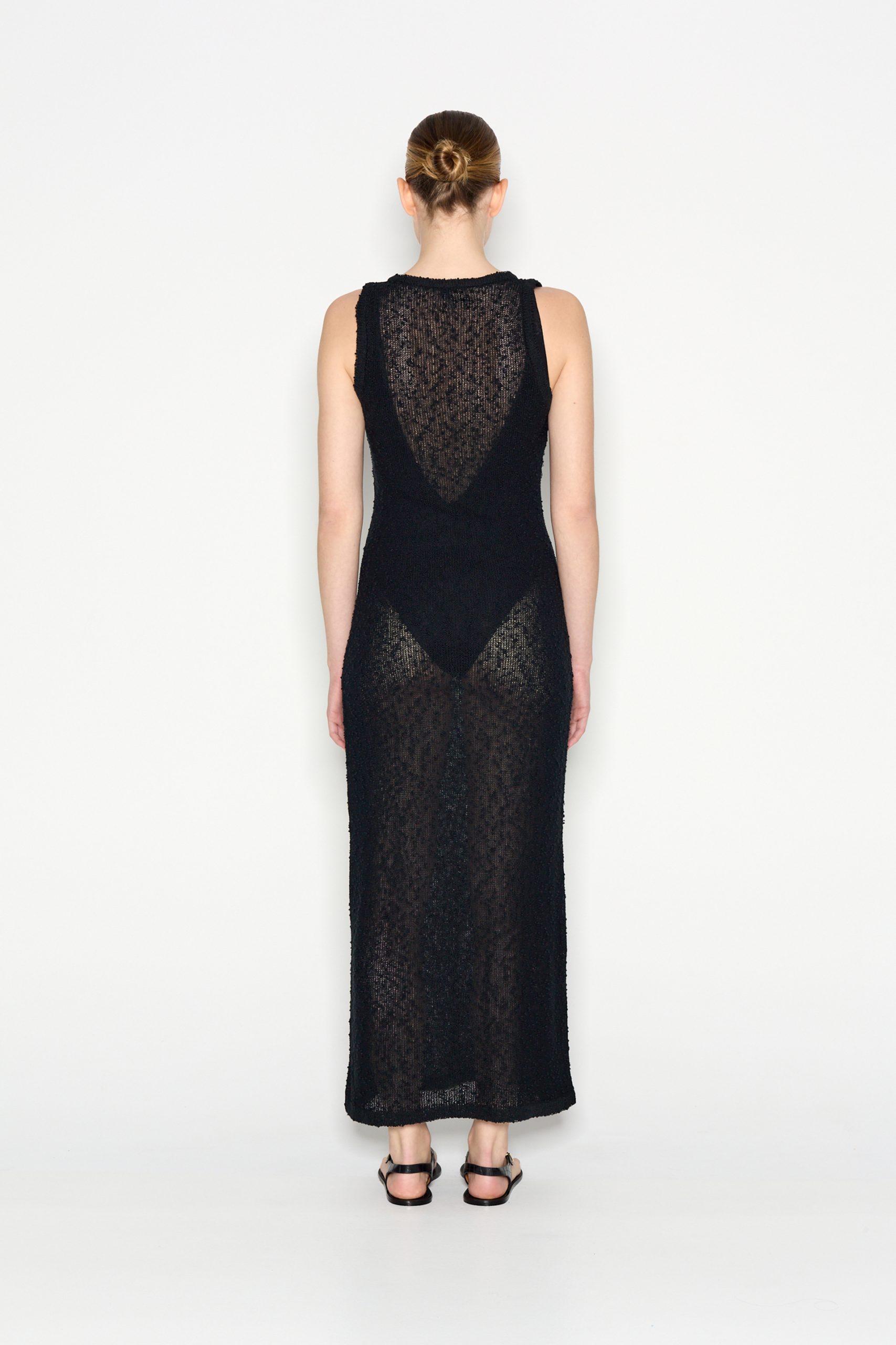 Light and flowing, this sheer knit maxi dress is the kind of effortless elegance summer calls for. With a sleeveless cut and simple V-neck, it works beautifully over swimwear or dressed up for evenings by the water. Available in classic black and soft beige, it’s a versatile piece that moves with you from day to night.