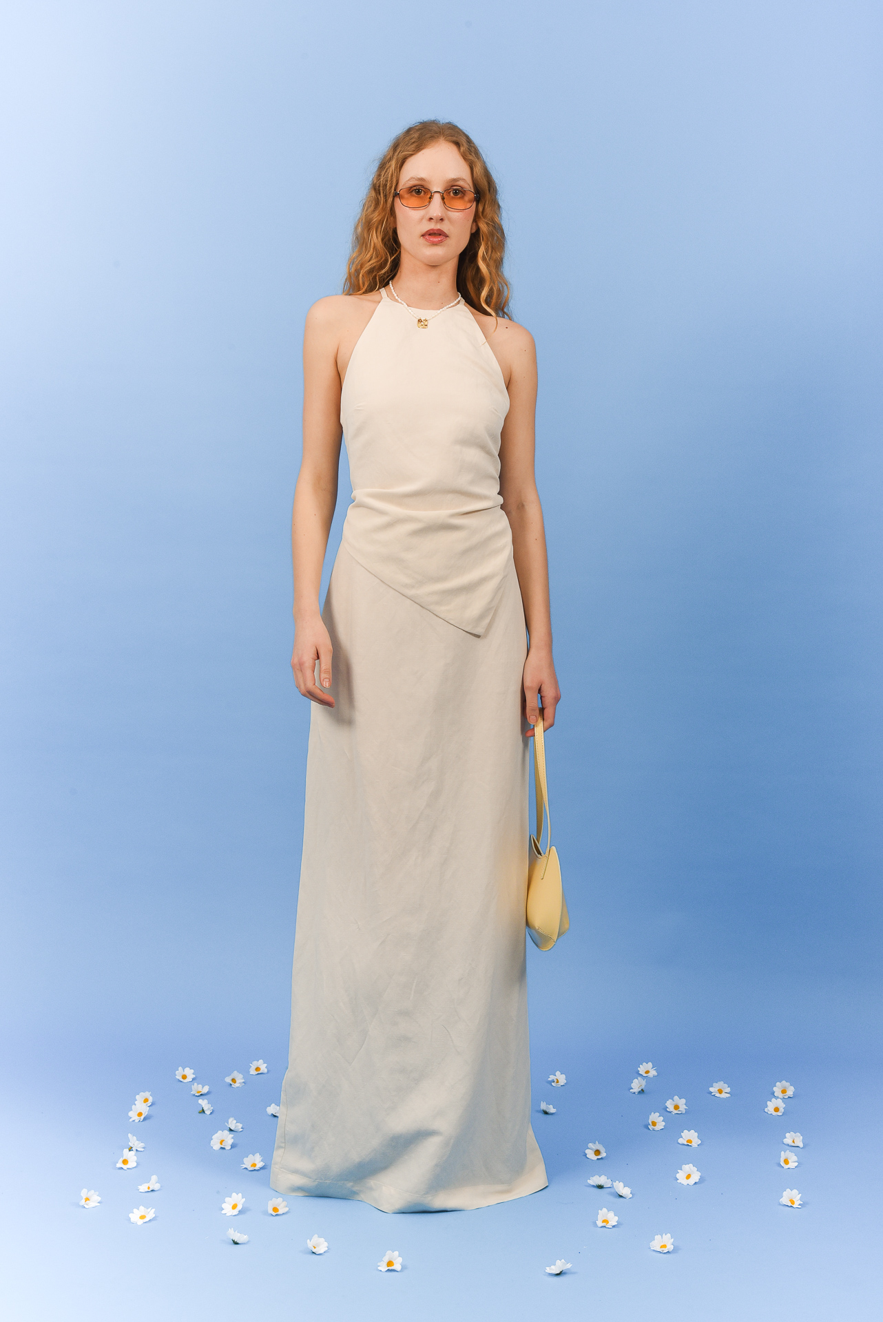 June Top is a refined halter-style piece designed to softly sculpt the silhouette. Crafted from lightweight fabric, it features a clean high neckline, a fitted bodice, and an adjustable lace-up back for a customizable fit. Elegant and minimal, it pairs effortlessly with the June Pants, Maxi Skirt or Skort for elevated summer and occasion dressing.