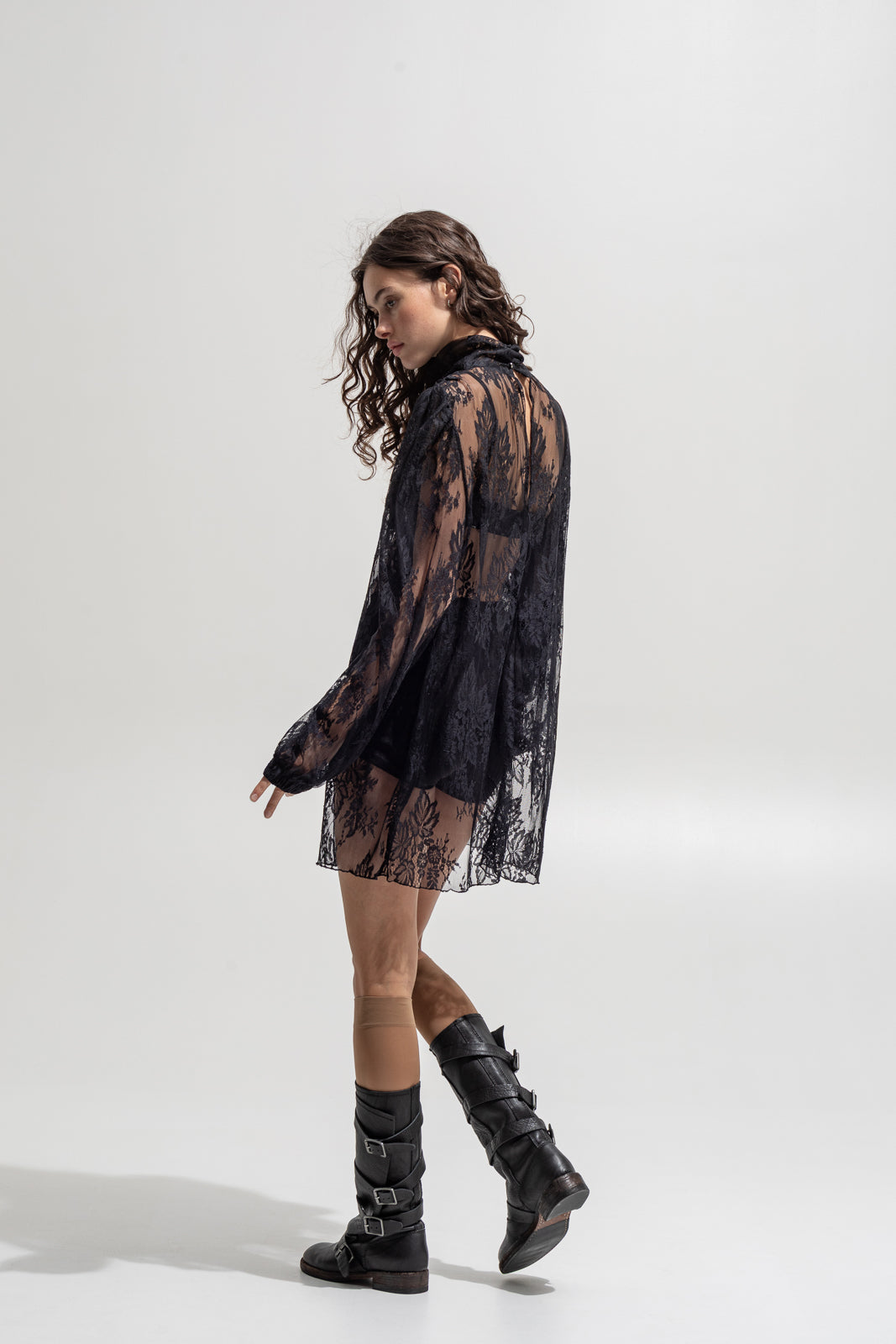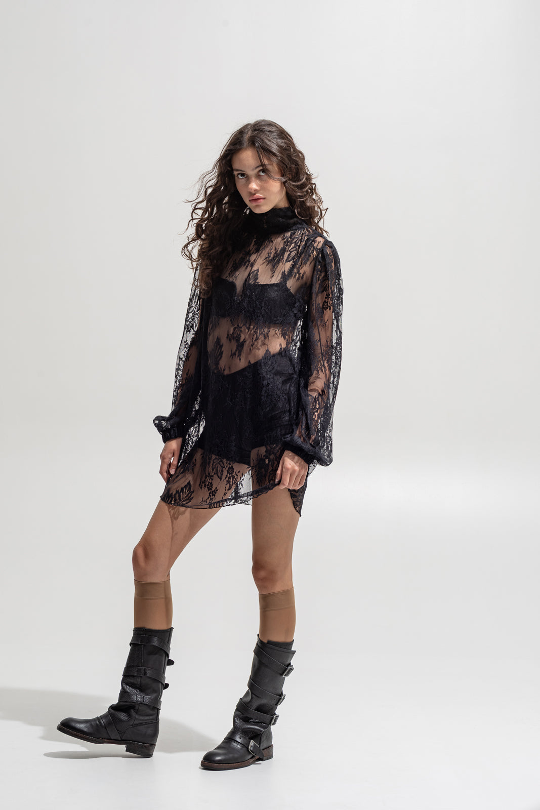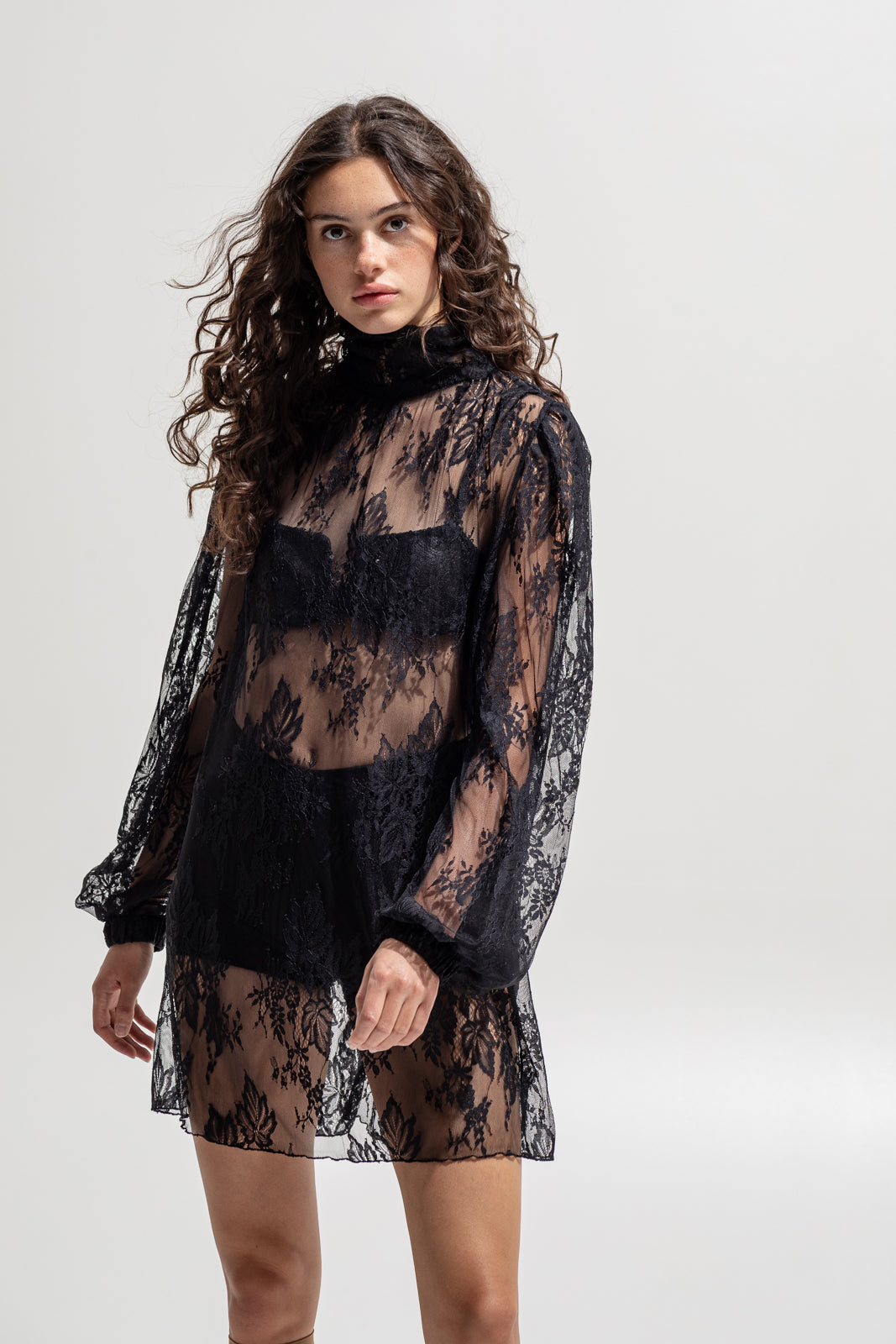 Delicate, daring, and undeniably powerful. This sheer black lace dress redefines femininity with an edge. Designed in a loose silhouette with voluminous sleeves and a soft high neckline, it flows effortlessly over the body — balancing romance and rebellion. Perfect for layering over lingerie, bodysuits or tailored pieces for a statement look that’s pure The Jerkins attitude.