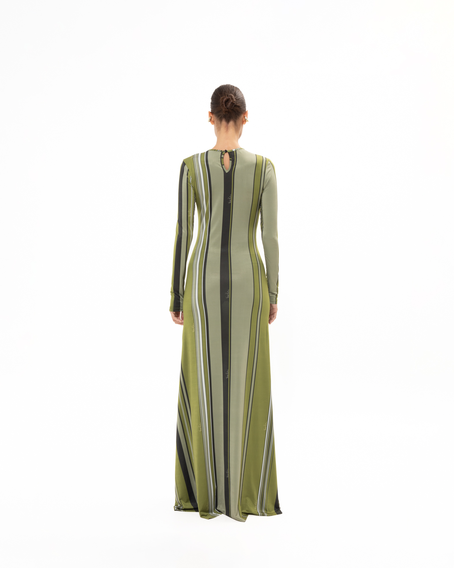 A striking khaki striped maxi dress that hugs the figure for a bold, modern silhouette.
