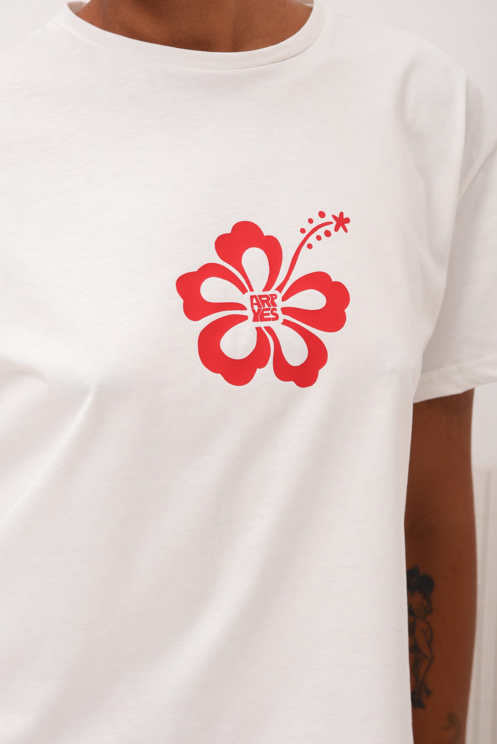 The Kingston t-shirt is a soft white cotton tee with a relaxed fit, short sleeves, and a classic round neckline. It features a bold hibiscus flower print at the chest with the ARPYES logo at the center. Available in red or blue print. Wear it tucked in or loose.