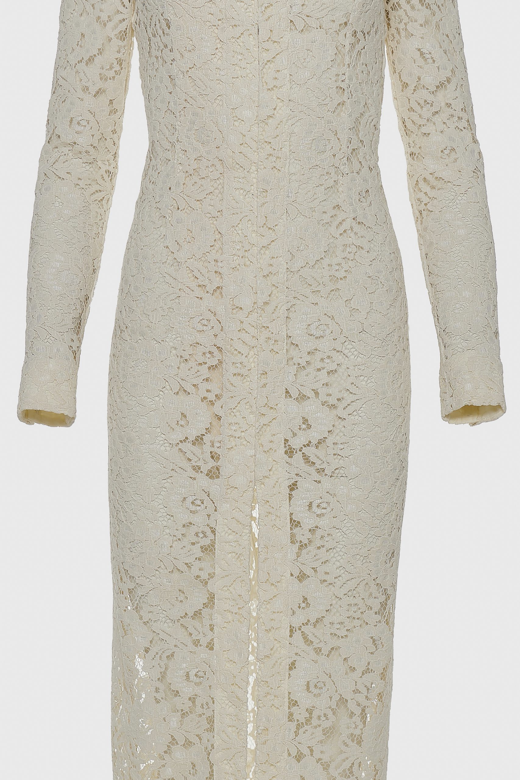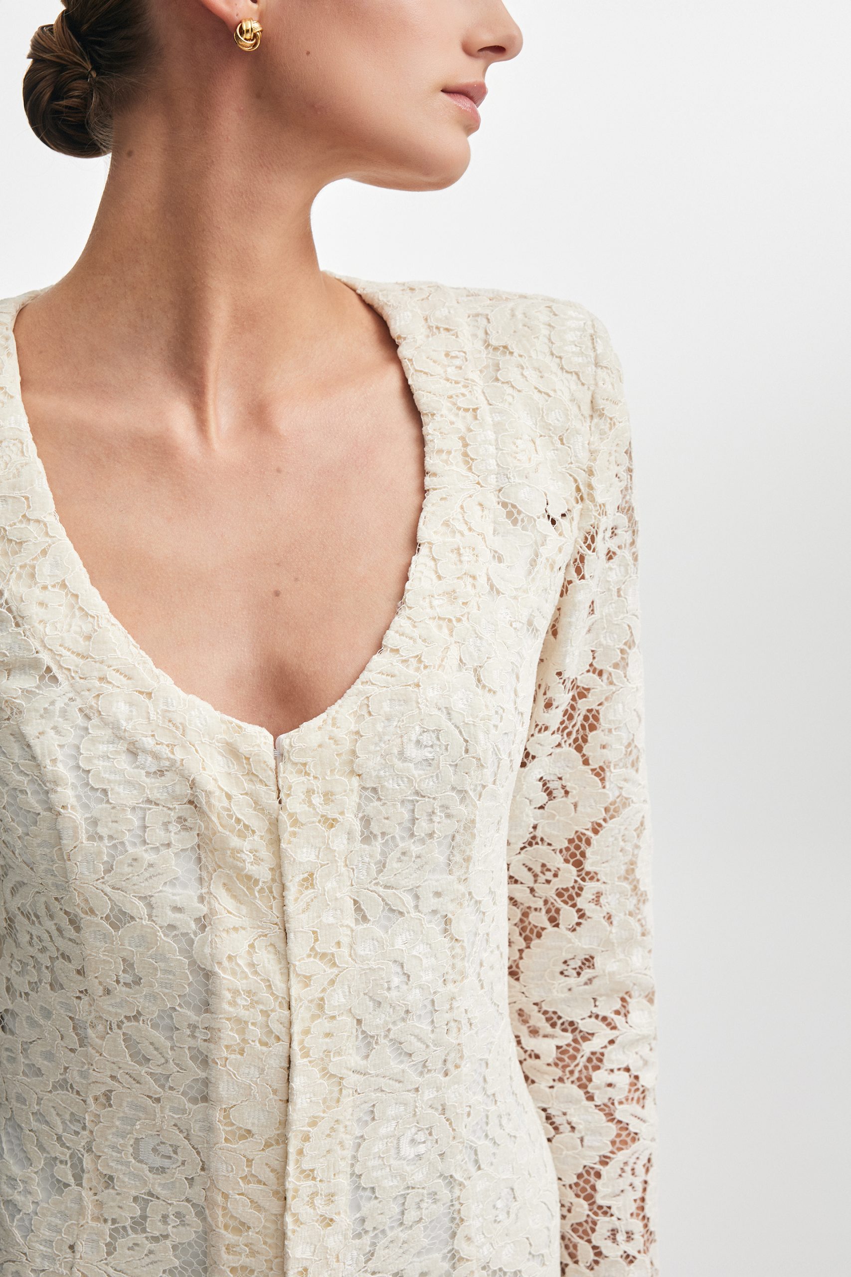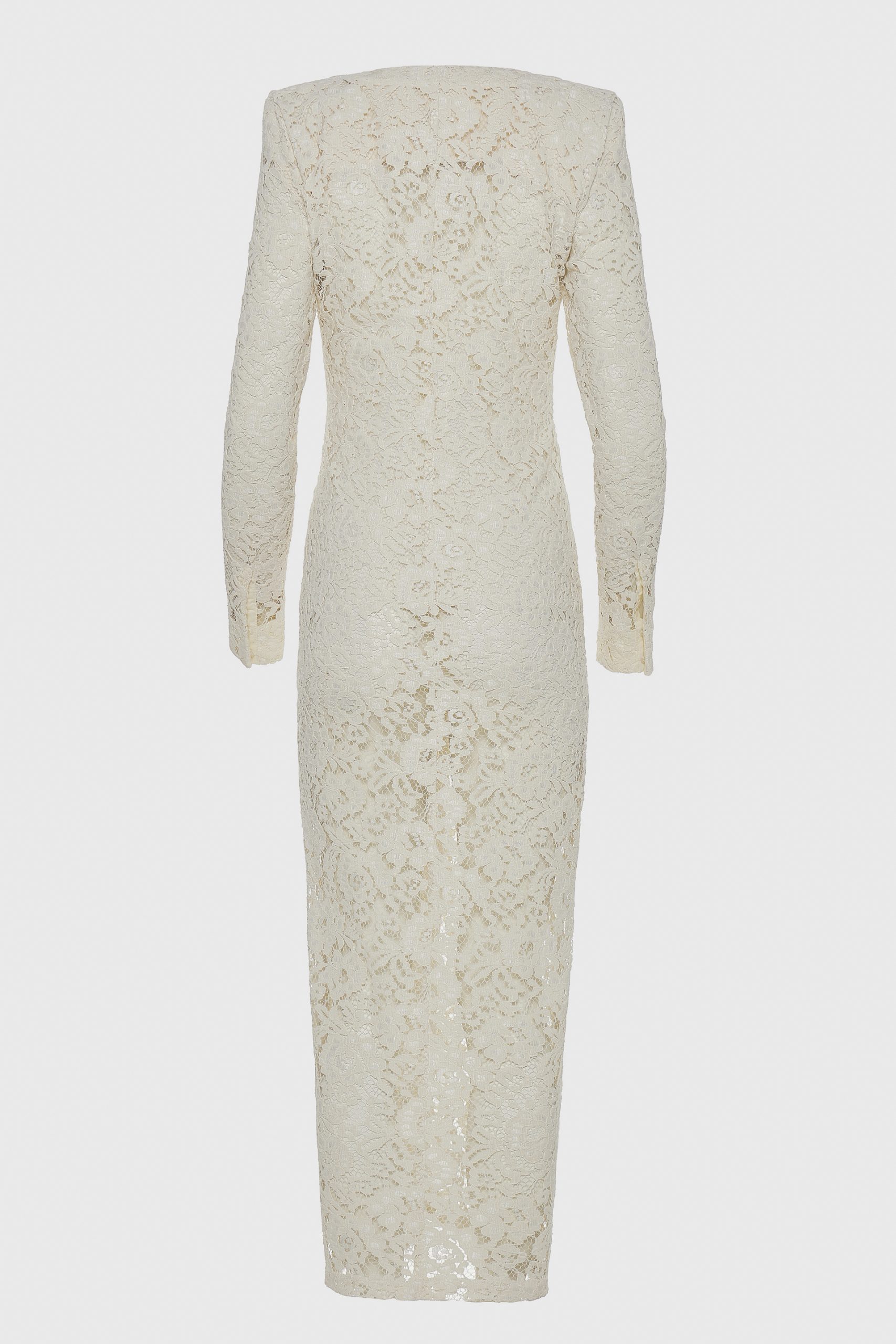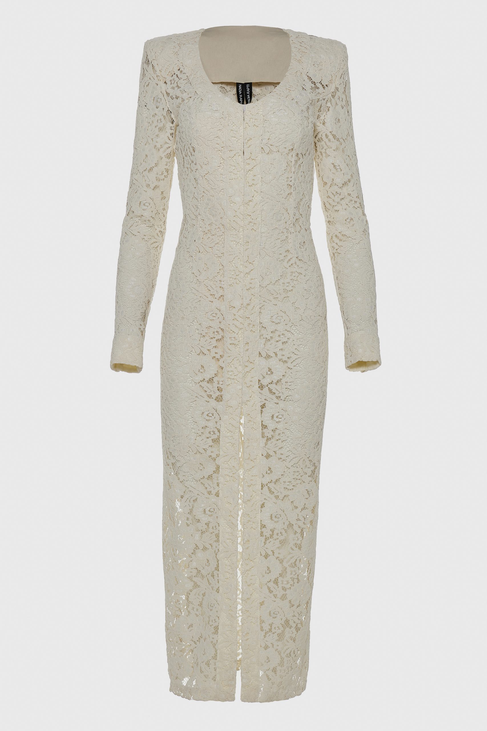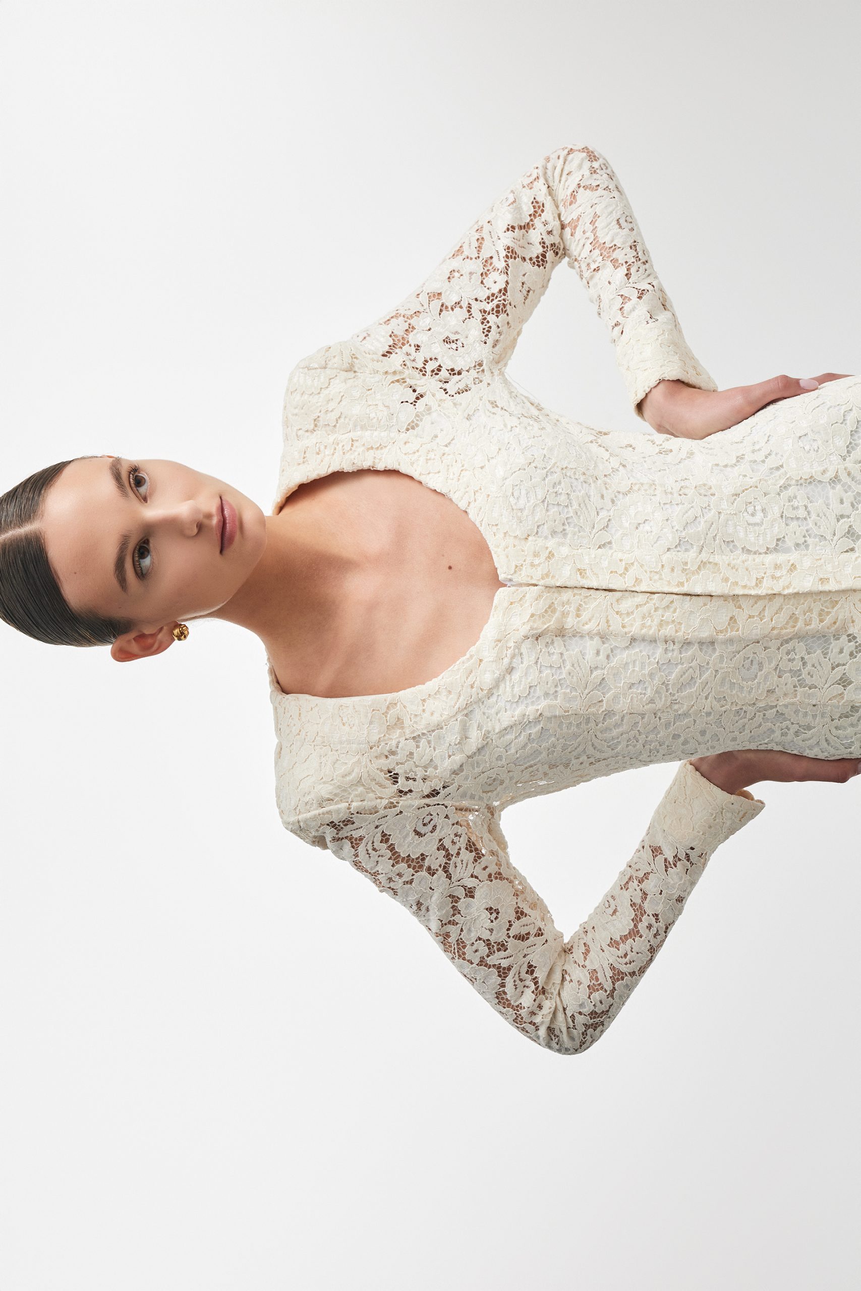 A refined evening silhouette cut in sheer lace velvet, designed to trace the body with ease and intention. The dress features a clean, structured upper body that transitions into a delicate, floor-length lace skirt. Long sleeves balance the transparency, creating a composed yet quietly sensual look. A piece defined by contrast softness and structure, exposure and restraint.