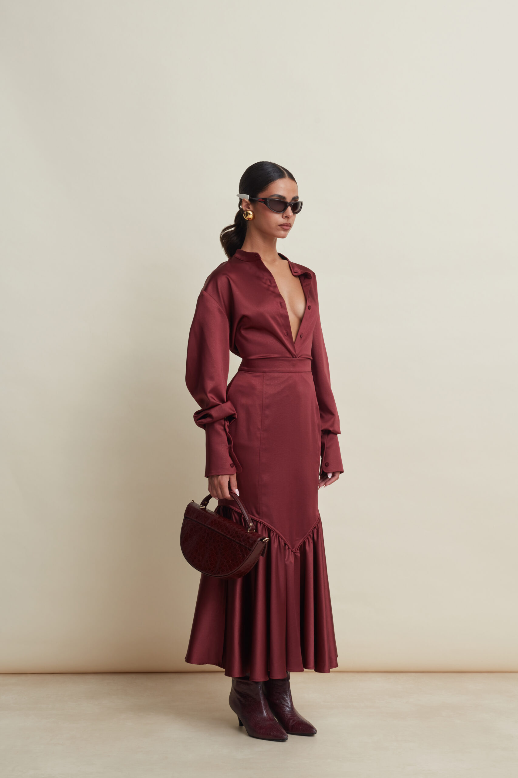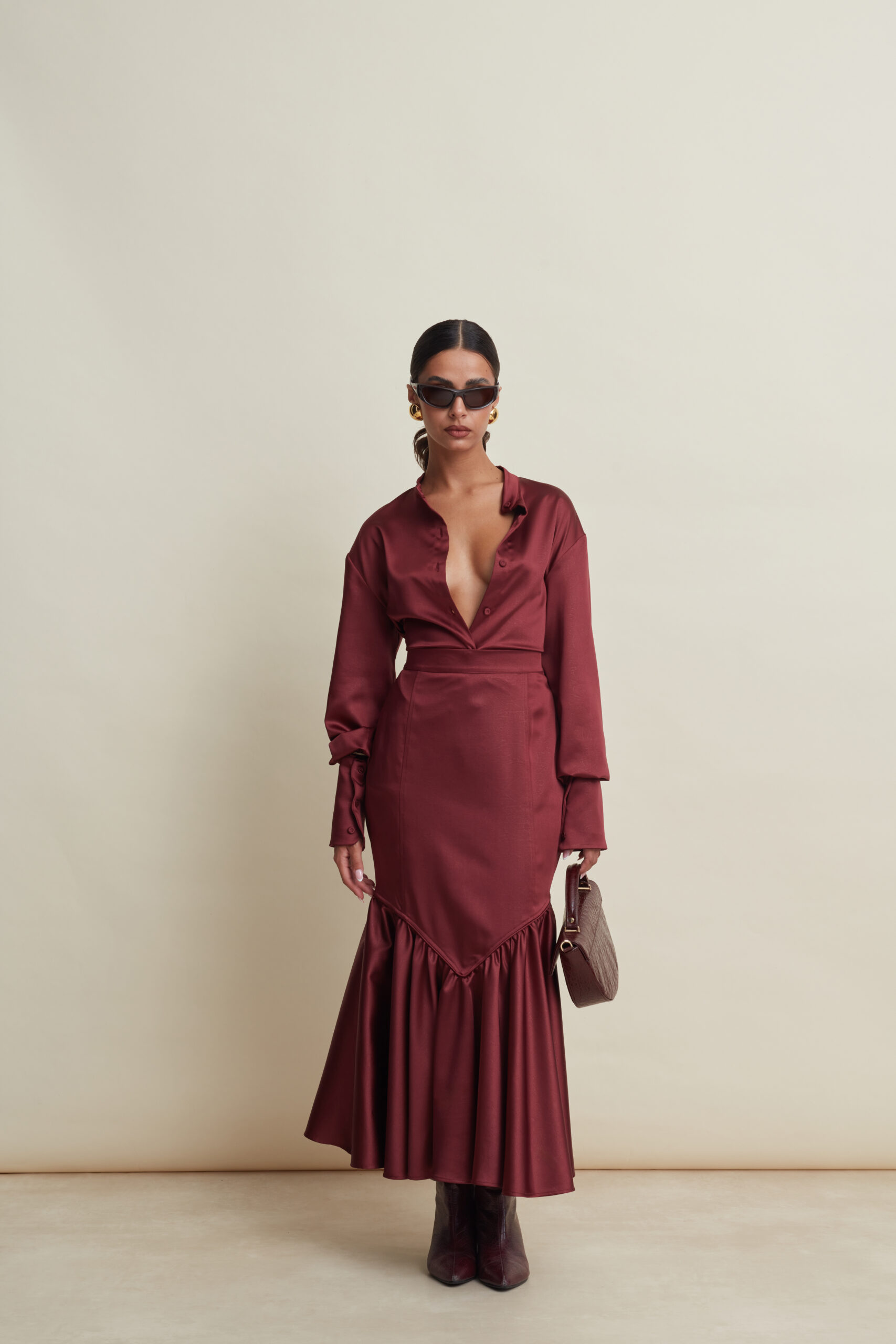 - A silky touch shirt in wine and black: a must-have piece of your office wardrobe.