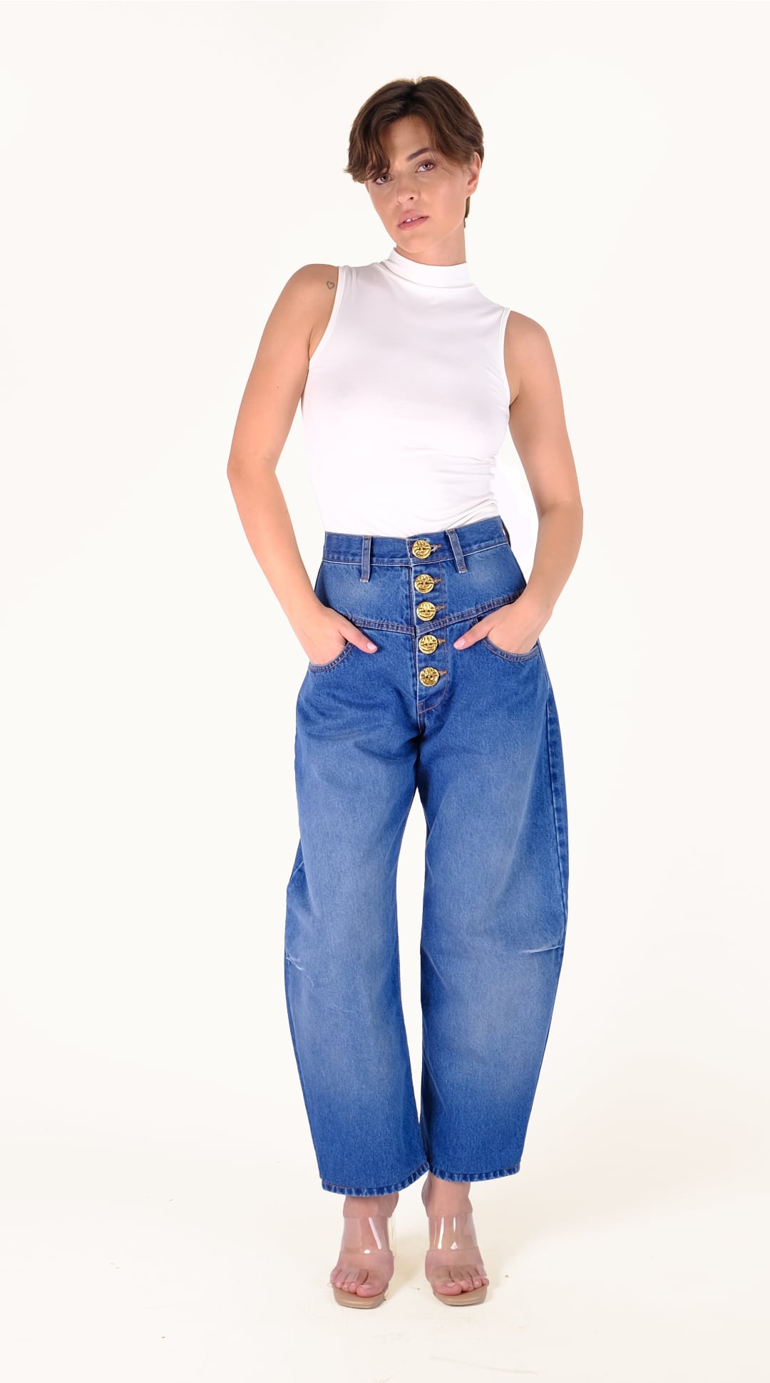 Επαναφέρει το κλασικό ψηλόμεσο τζιν μέσα από μια balloon γραμμή με σύγχρονη, statement διάθεση.