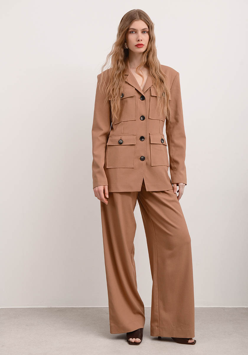 • Slim fit jacket with lapel collar and four front square pockets. Timeless in a strict style we suggest you combine it with Twiggy Camel Pants.
