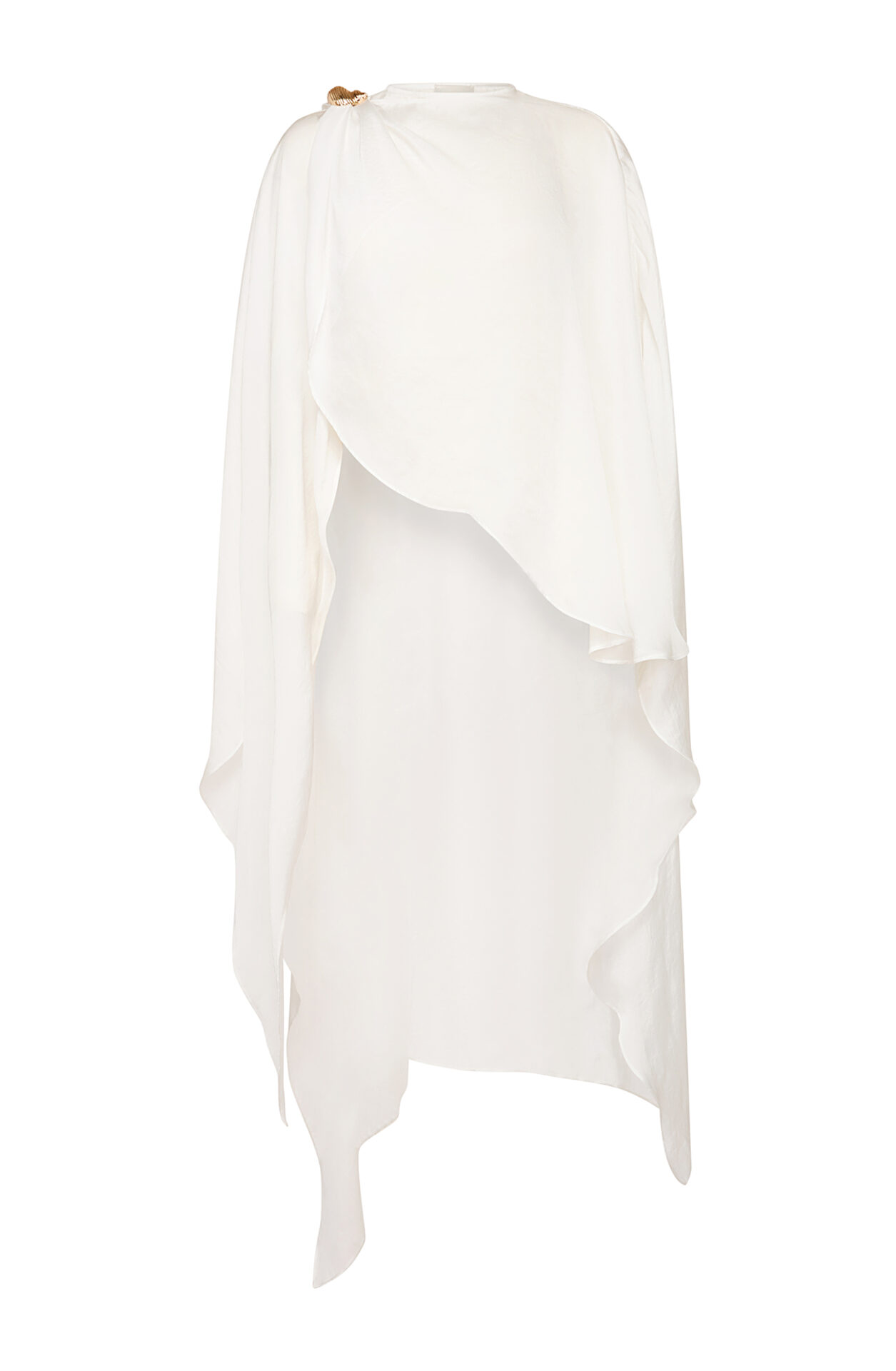 • A silky-touch cape with envelope design on the front, asymmetrical cut & a gold jewel on the shoulder.