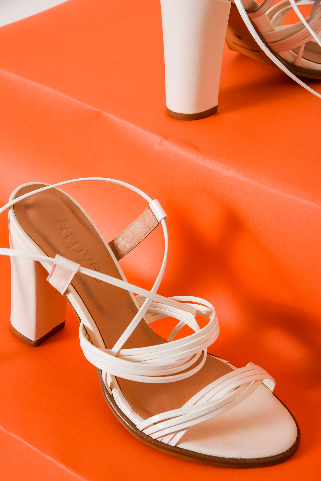 - Resting on thic heels, this barely-there style is accented with strappy ties that wrap around the ankles.