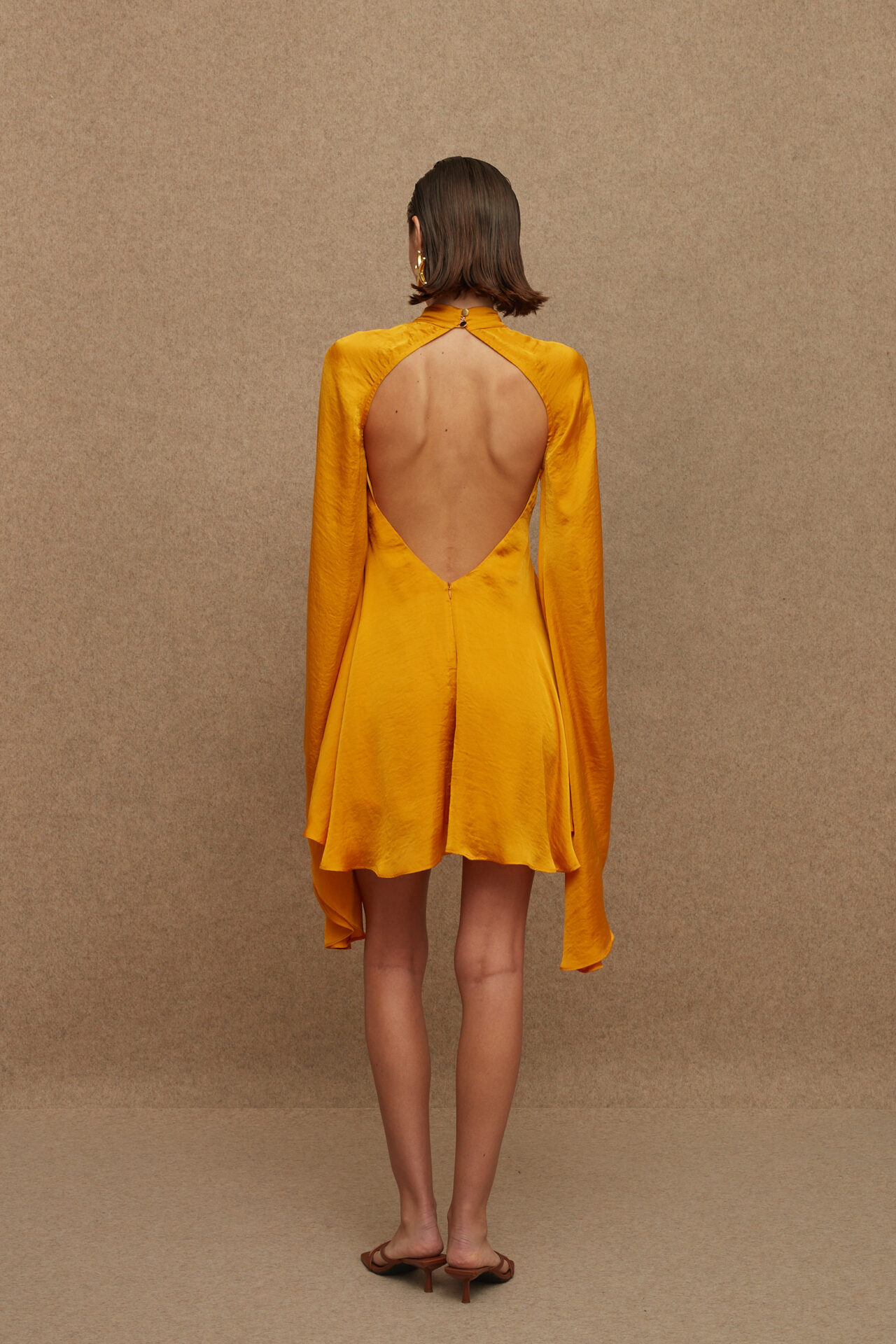 1. A silky touch mini dress with flare design & open back.