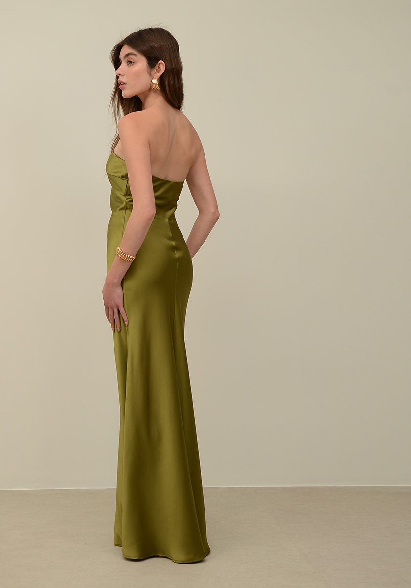 - Στράπλες, μακρύ φόρεμα από σατέν ύφασμα, σε ίσια γραμμή και φερμουάρ στο πίσω μέρος.