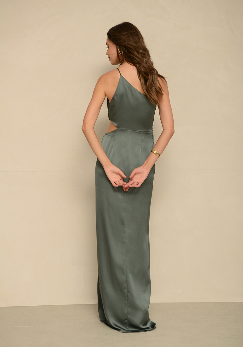 - Μακρύ φόρεμα από σατέν ύφασμα, άνοιγμα στην μέση και σκίσιμο μπροστά.