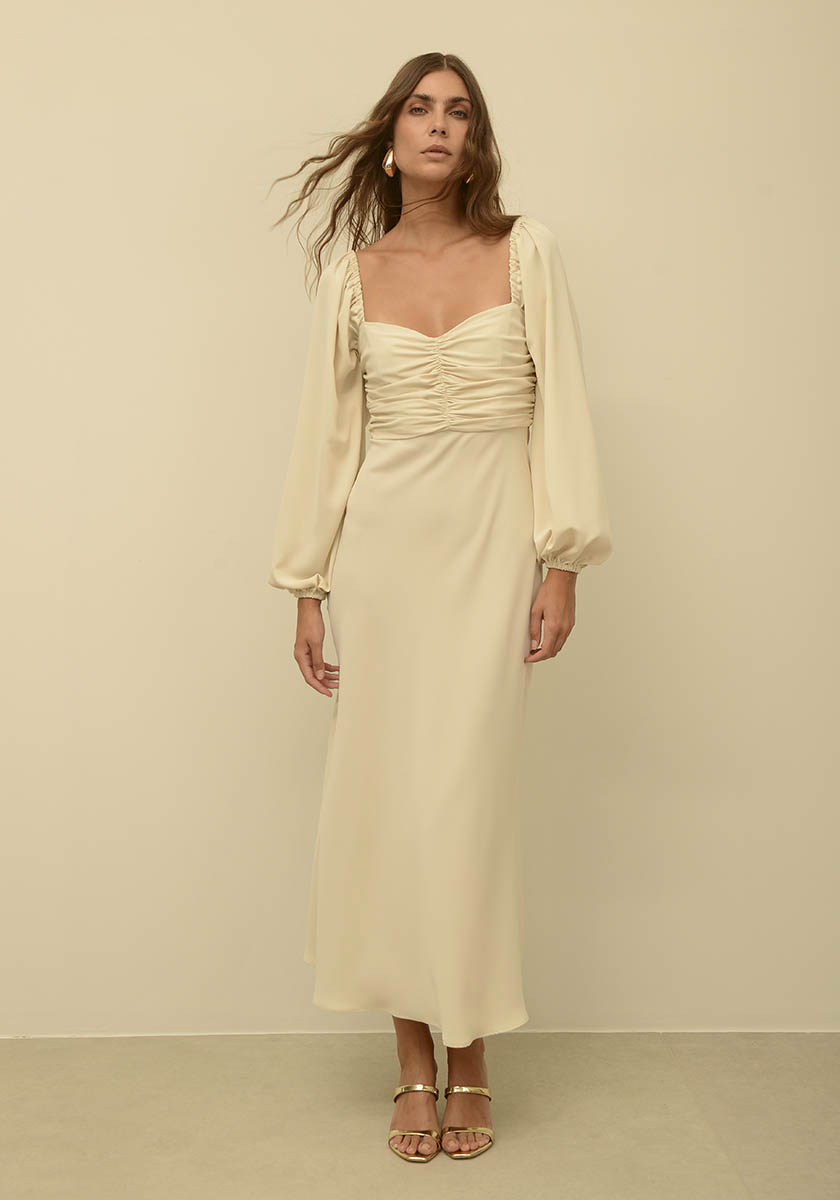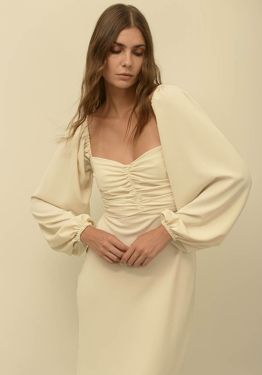 - Κόμψο μίντι φόρεμα με μακρύ μανίκι με σούρες από κρεπ σατέν ύφασμα & πιέτες στο μπούστο. Τετράγωνη λαιμόκοψη και φερμουάρ στο πίσω μέρος. Εάν είστε ανάμεσα σε δύο μεγέθη προτείνουμε να αγοράσετε το μικρότερο.