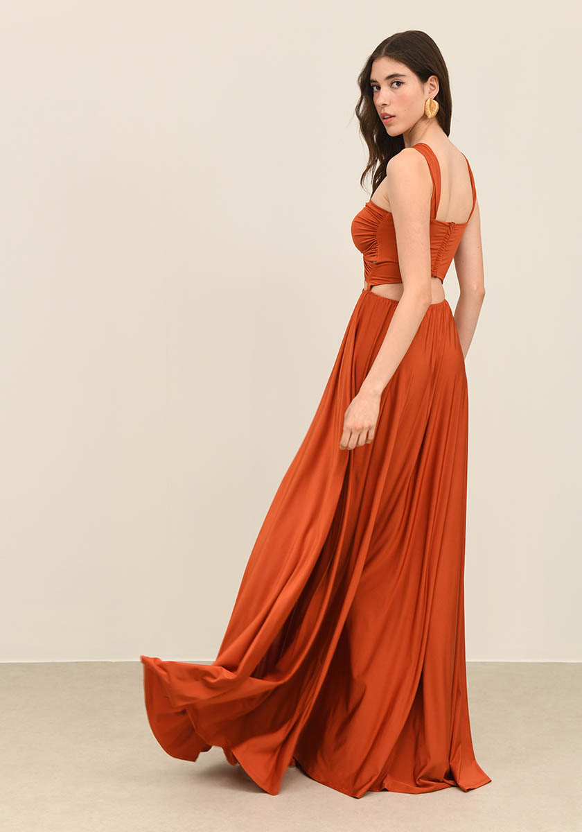 • Μακρύ φόρεμα από ελαστικό ύφασμα με ιδιαίτερα γεωμετρικά στοιχεία στο μπούστο και ανάλαφρο άνοιγμα στη γραμμή «Α».
