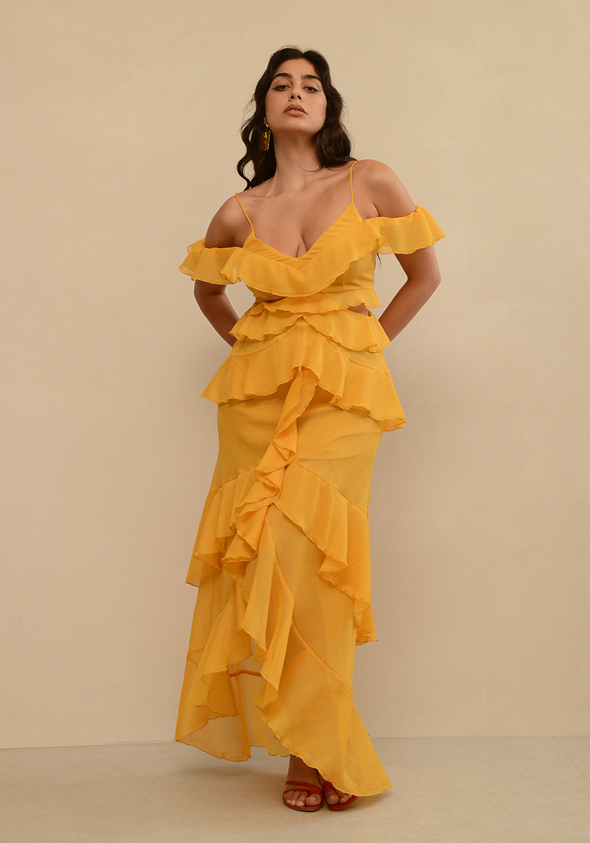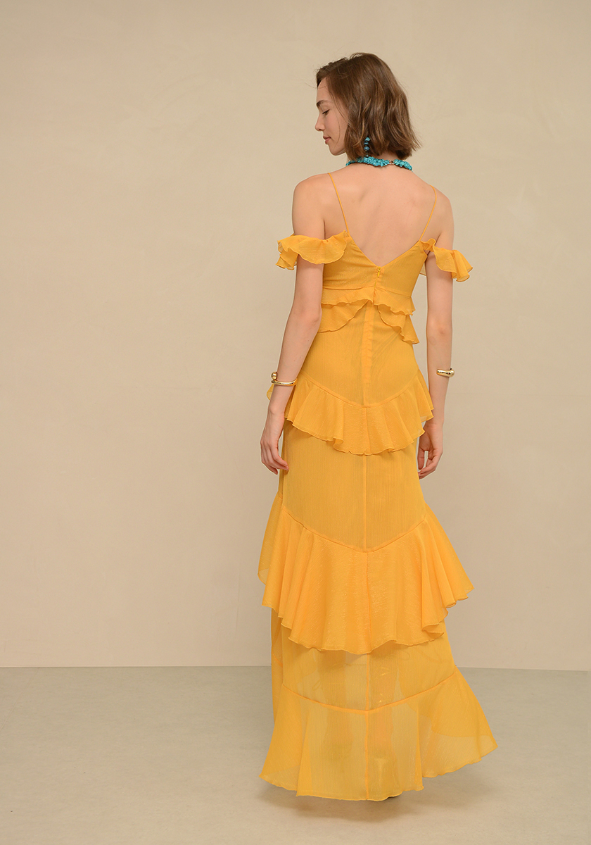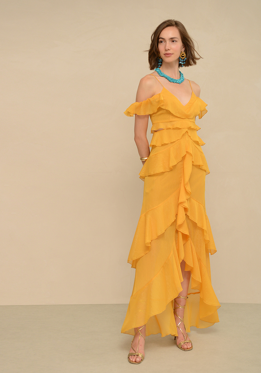 - Μακρύ φόρεμα με βολάν από μουσελίνα με άνοιγμα μπροστά. Φερμουάρ στο πίσω μέρος.