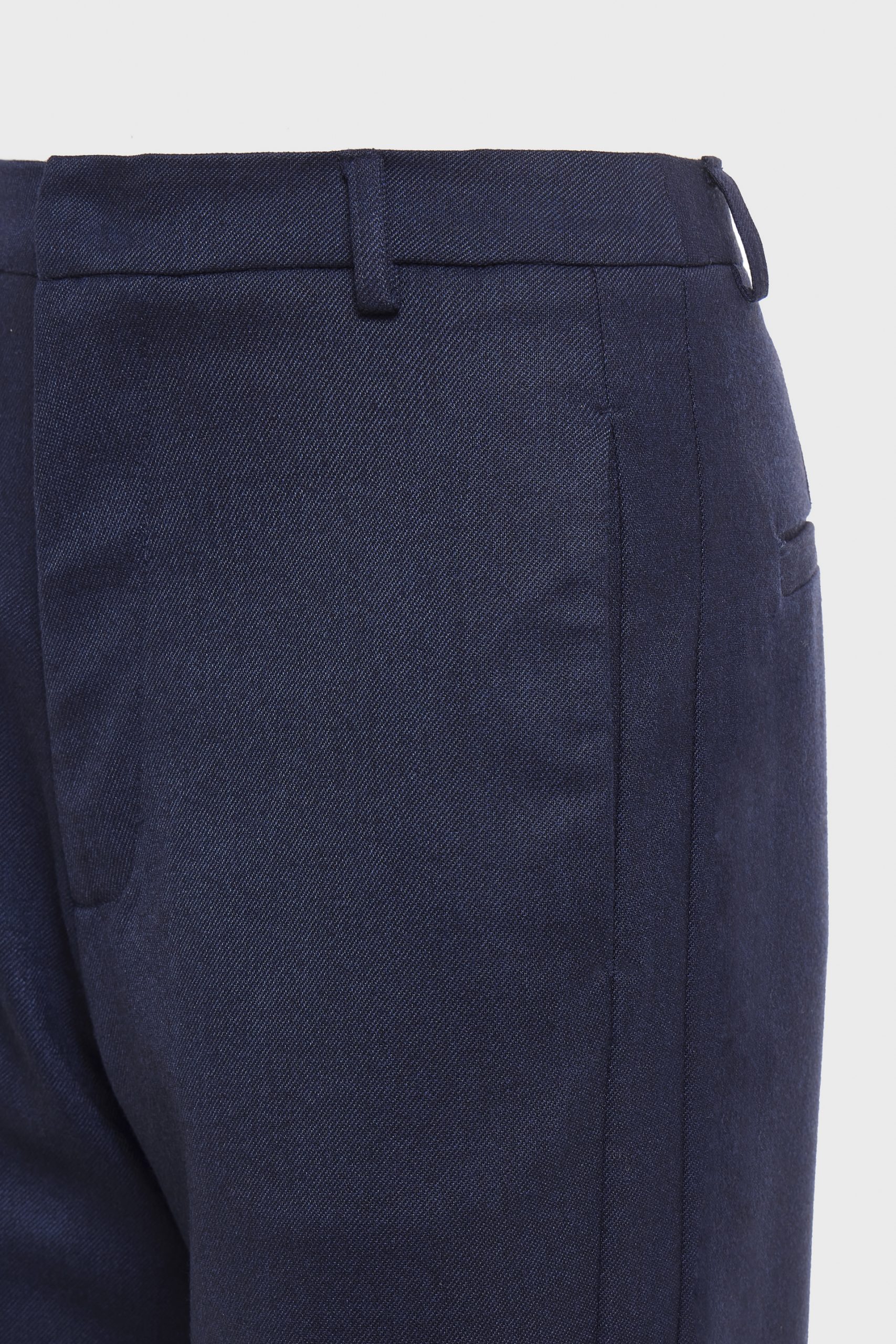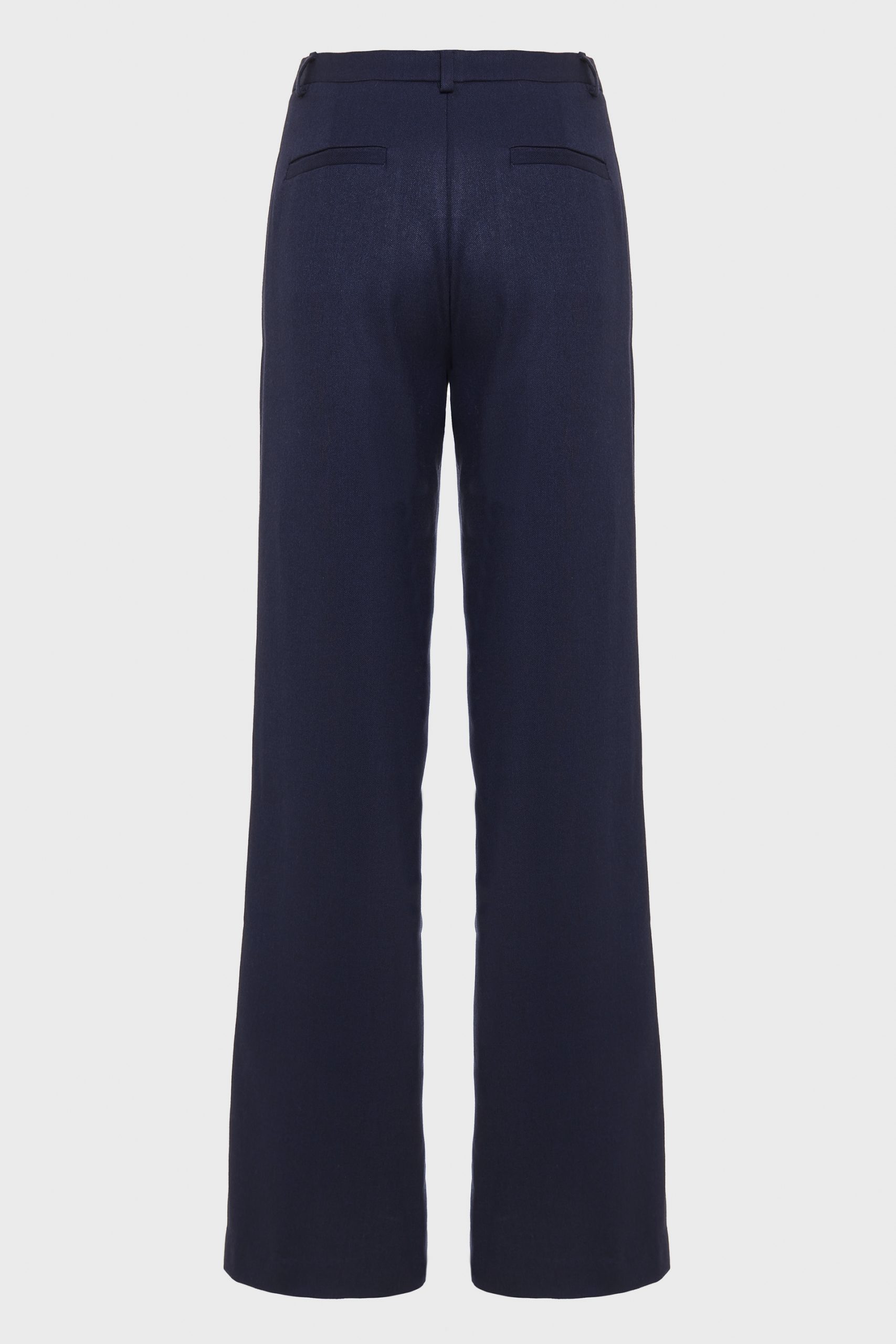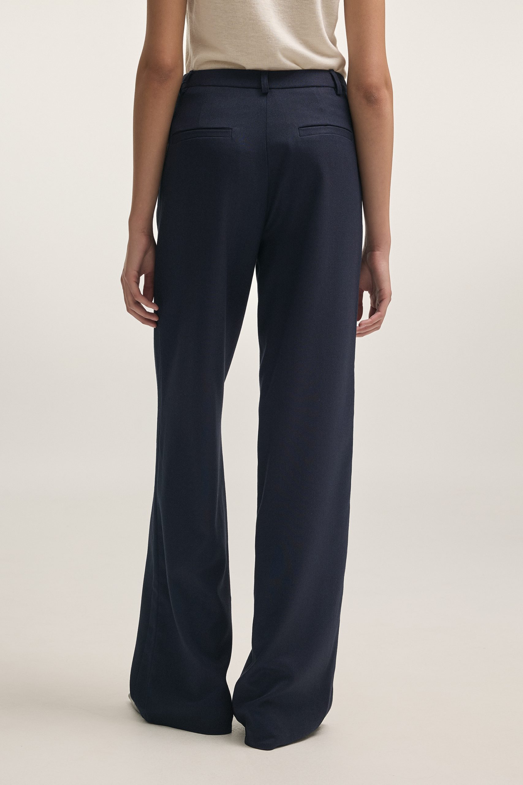 Tailored high-waisted trousers crafted from diagonal weave fabric. Designed with a straight-leg silhouette for a clean and refined look, featuring discreet side pockets and back welt details. Available in brown and navy for a polished, coordinated ensemble.